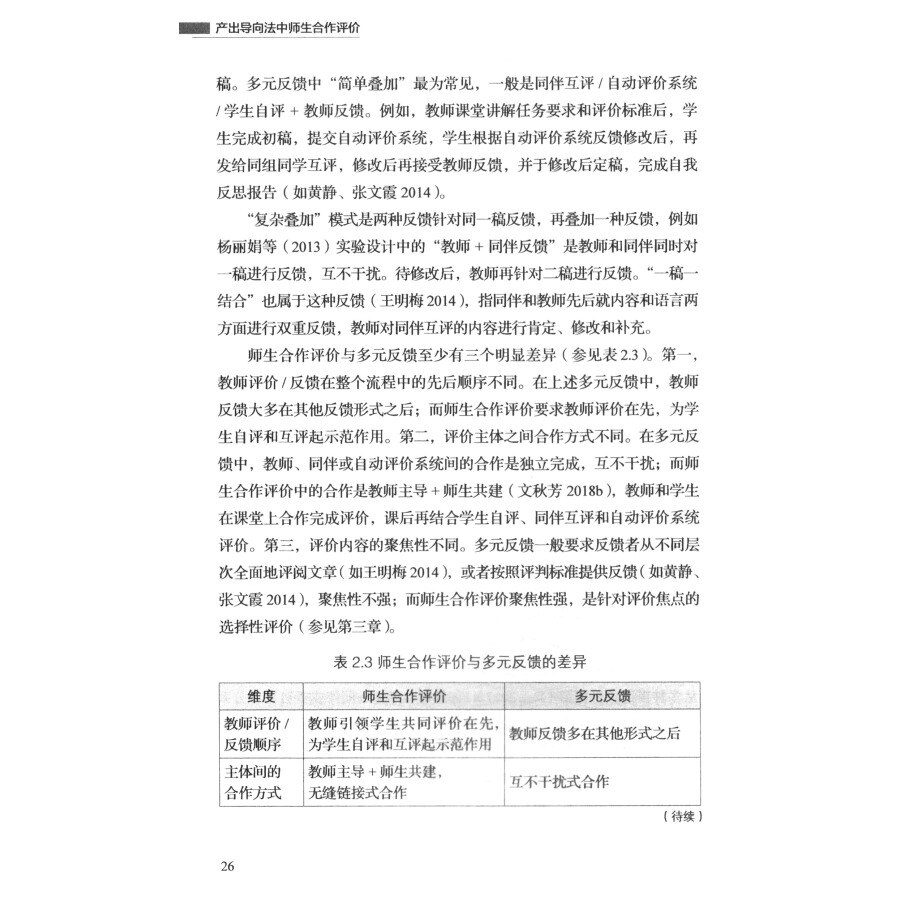 二语写作评价一直备受研究者和一线教师的广泛关注。学界对评价与教学关系的认识大体经历了两次转向:从评教分离转向评教结合,再逐步转向“评、教、学一体”。但遗憾的是,这种认识似乎还停留在理论探讨层面,现有的实证研究对评价有效性的结果关注得多,而对如何才能做到有效评价的过程关注得少。20 1 6年,我在北京外国语大学攻读博士学位,师从产出导向法(Production-Oriented Approach,简称POA)理论的创建者文秋芳教授,同年加入POA研究团队。也正是在此时,我有幸阅读了《“师生合作评价”:“产出导向法”创设的新评价形式》(文秋芳2016)一文。为了解决困扰自己多年的写作评价难题,我决定将博士学位论文选题聚焦于POA评价环节,尝试将师生合作评价用于评价中国大学生英语写作成品,探索其可行性和有效性。
