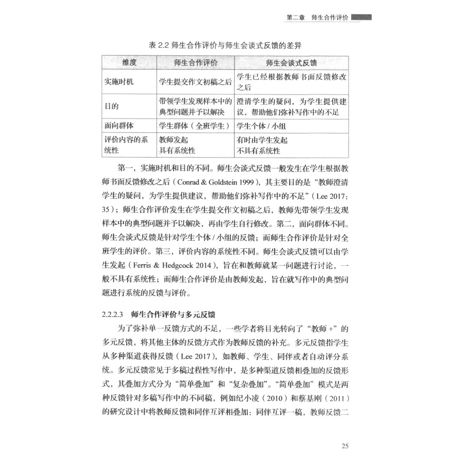 全书共包含九章。第一章为绪论,从笔者作为英语学习者“学习写作”和作为英语教师“评价写作”的经历、高校英语教师面临的写作评价挑战和英语学习者对写作评价的期待三个方面阐述实践师生合作评价的缘起,说明评价在POA中的地位,并简要介绍教学实践对象。
