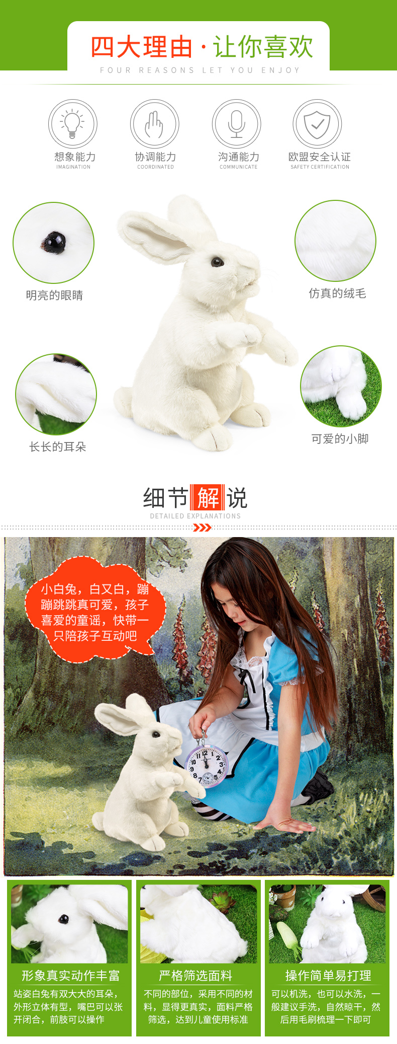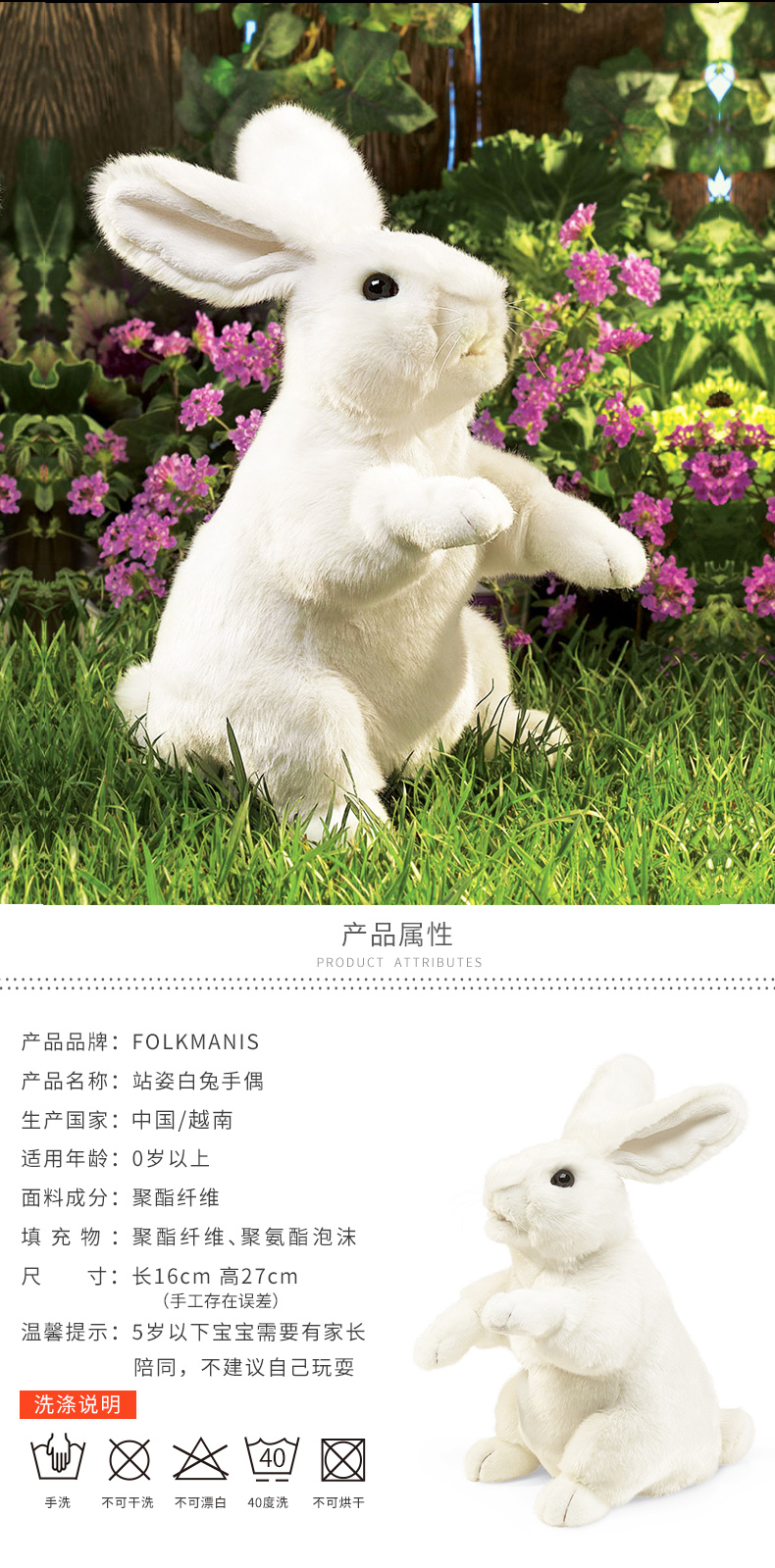 Folkmanis Puppets站姿白兔玩具/2868玩偶毛绒玩具礼物