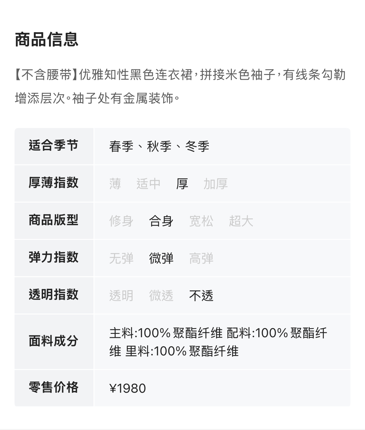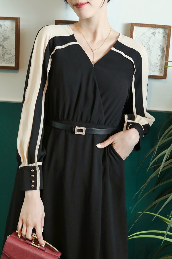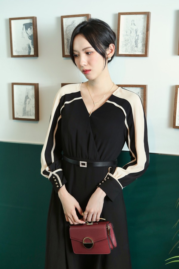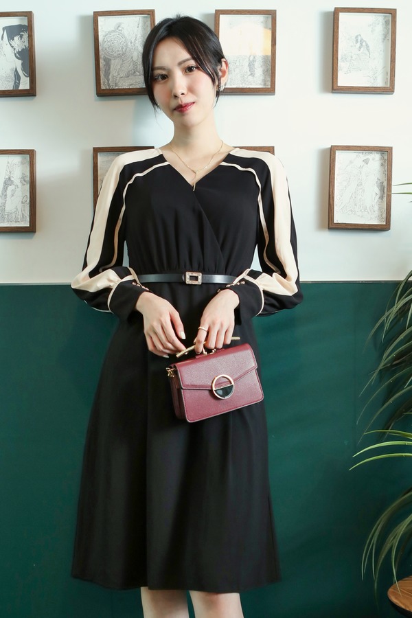 ELLA JADE 米黑撞色袖子拼接连衣裙 13189【不含腰带】