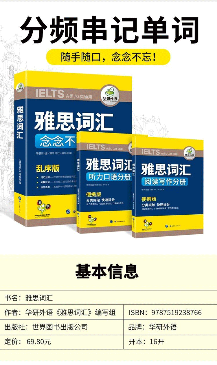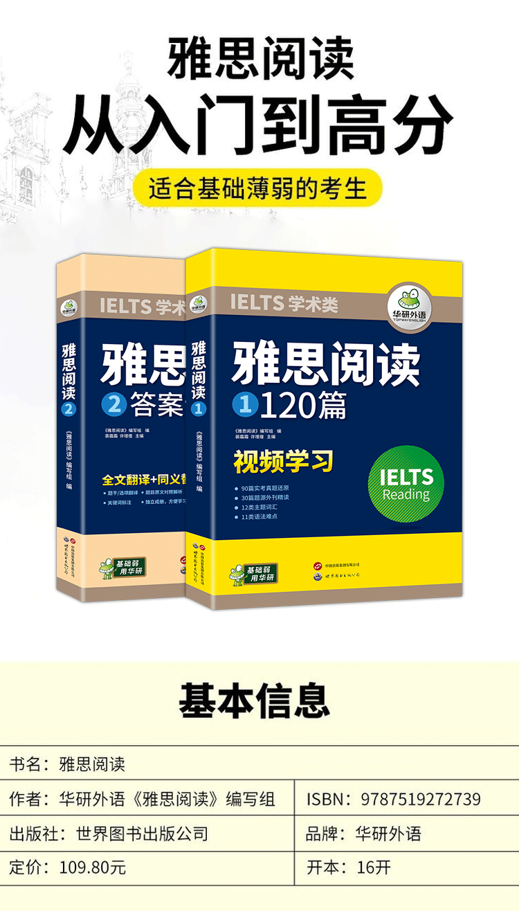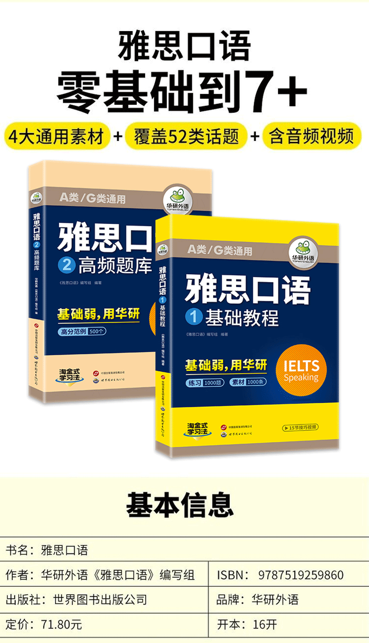 1.两册装,上册为雅思口语基础教程,从发音、词汇、语法入门,提高口语发音准确性和流畅度,积累口语主题词汇及观点,有1000道练习题和4大类素材库。下册为机经题库,配500个高分回答范例及外教英音朗读音频;