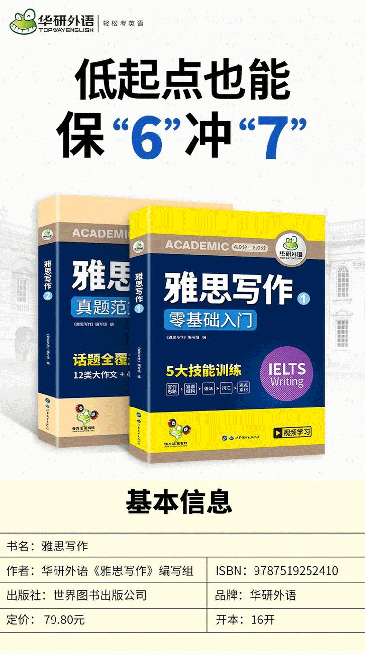1. 两册装,上册为写作基础教程,掌握雅思写作要领,学习英文写作原则,学会英文造句及炼词。下册为题库范文,100篇雅思真题范文,以练带学。