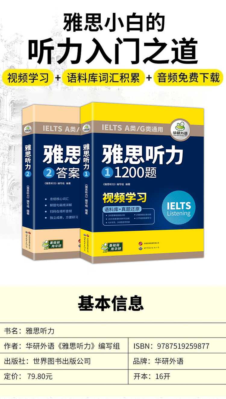 1. 两册装,上册为听力1200题,提供雅思听力考试的理论指导,从语音和词汇入门,积累雅思听力场景词汇,分析命题规律和各题型的解题技巧。有的放矢,有助于考生快速备考。下册为答案详解,答案独立成册,避免来回翻页。