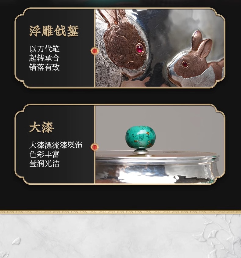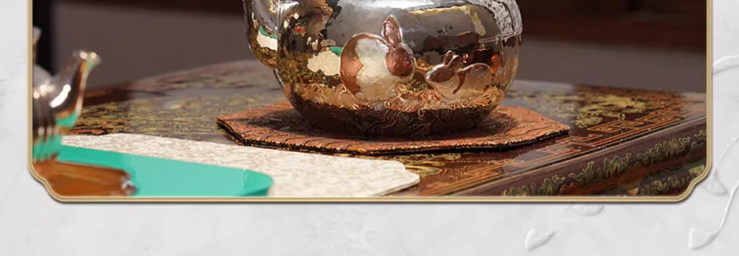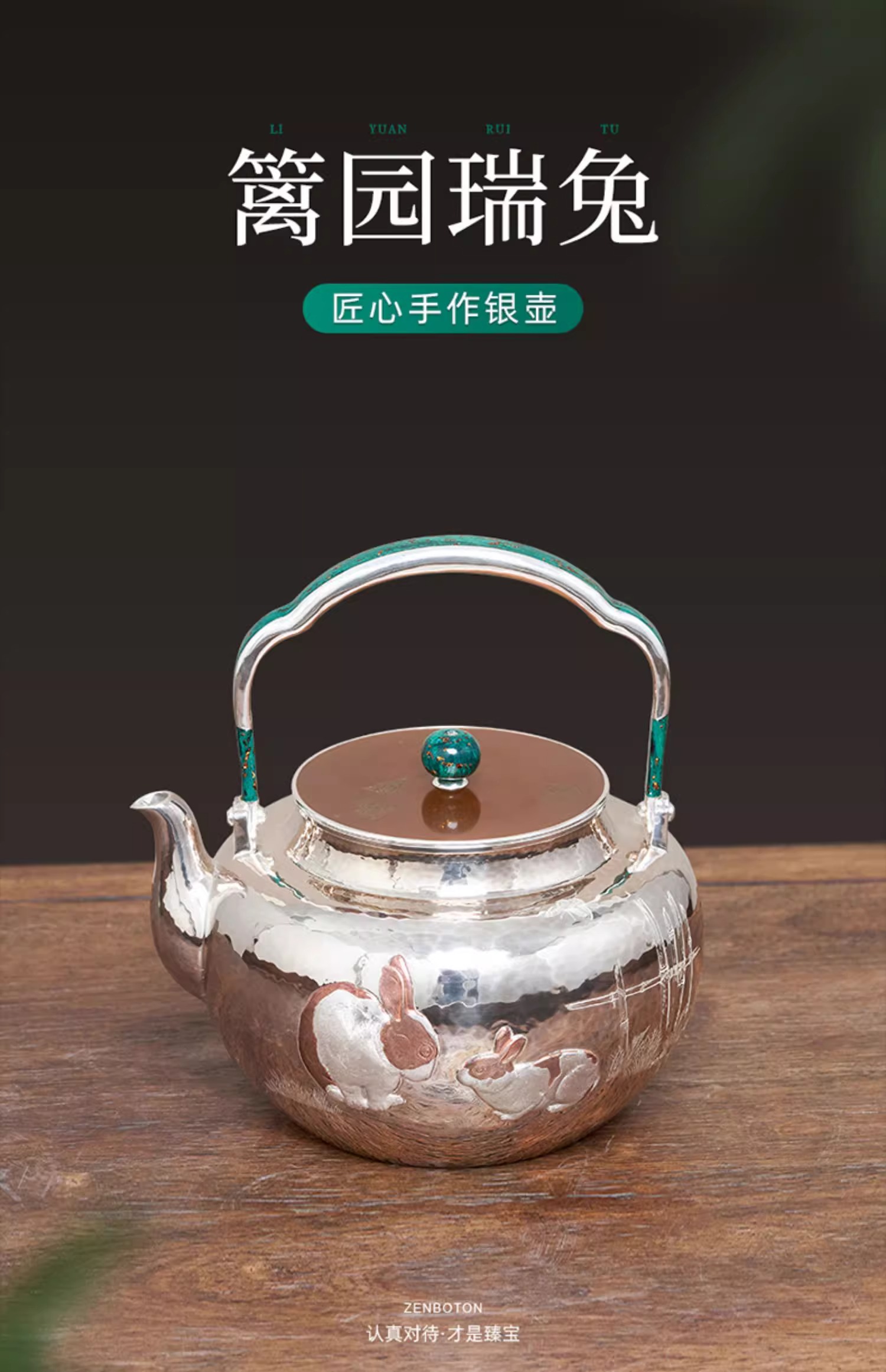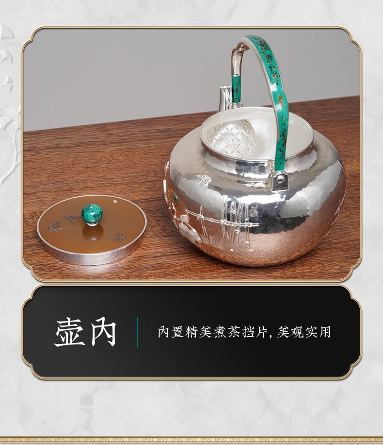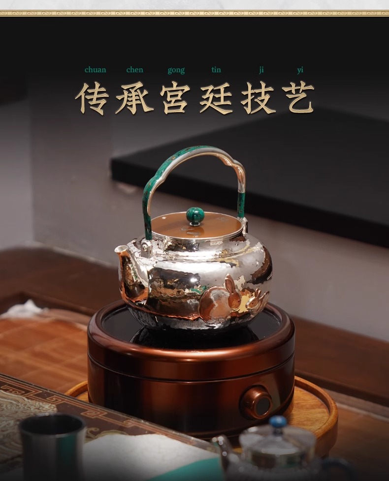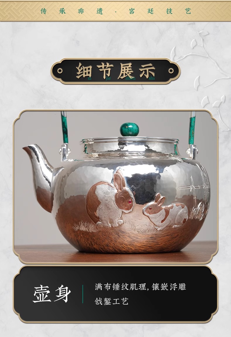 臻宝堂银壶999纯银烧水壶纯手工篱园双兔茶壶足银茶具大漆把中式篱园瑞兔壶1000ml