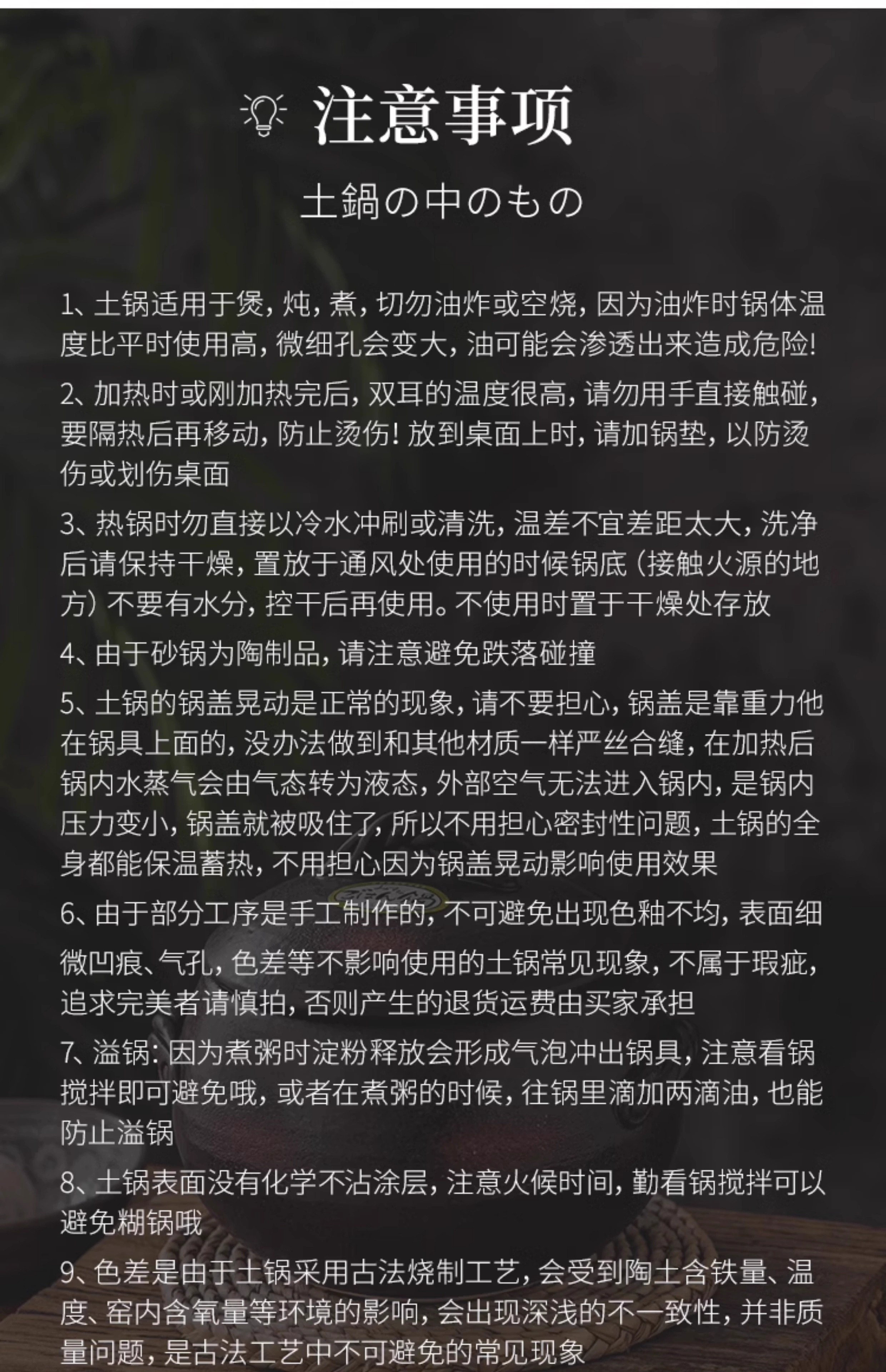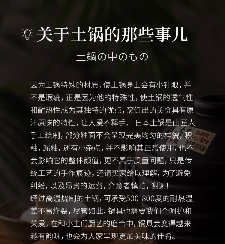 购买需知:陶锅内外盖因蓄热需求制作为光滑质感,实物有部分小孔;原装进口简单纸箱包装,如介意者勿拍