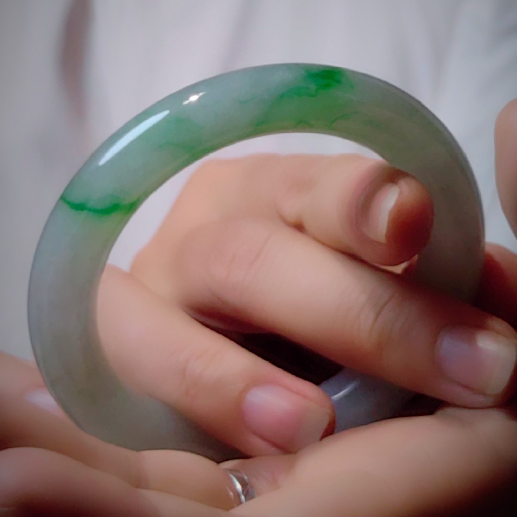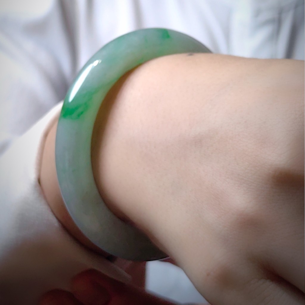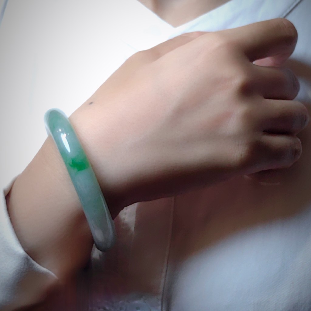 这是一只翡翠漂亮的翡翠手镯,厚装料足,特别是飘绿花的颜色浓艳饱满,上手端庄大方,值得拥有。