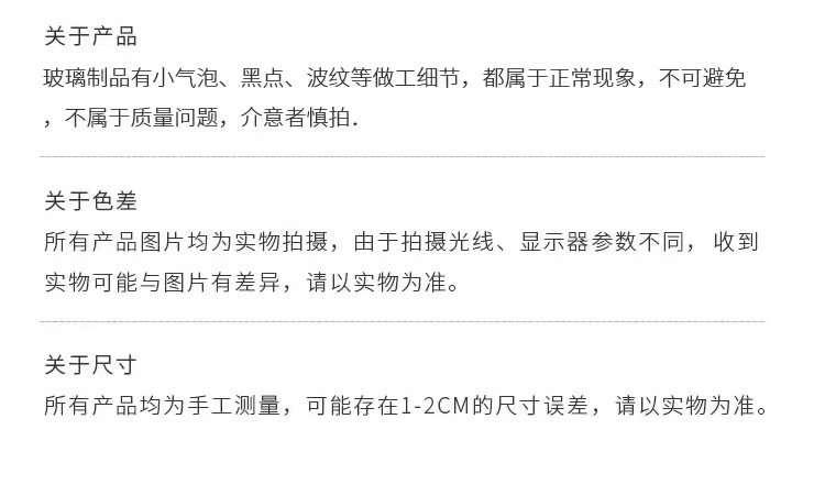 【温馨提示】玻璃属高温烧制产品,可能会出现轻微小变形,小气泡,均属于合格品,不在售后范围。