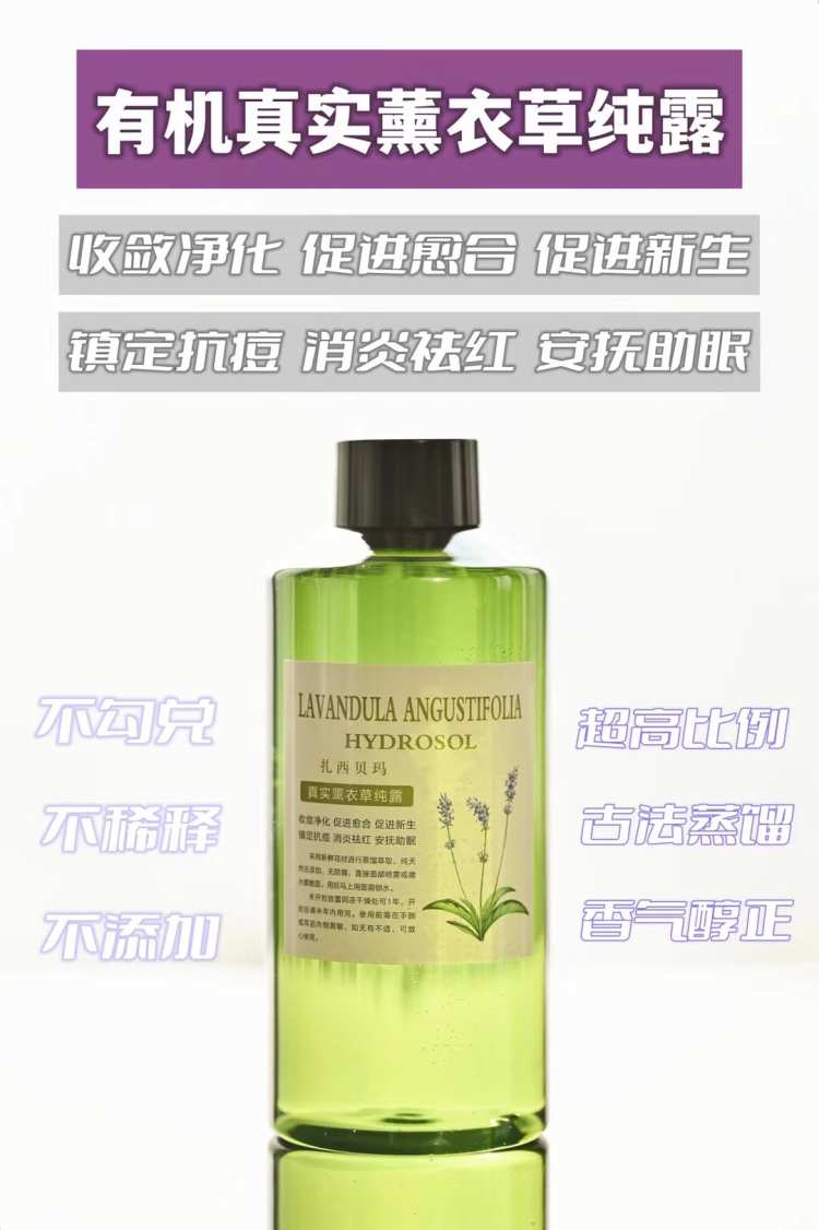 功效:真实薰衣草纯露让温柔苏醒,展现至纯至净。包裹着自然的气息,清浅蓝紫中透着温润舒畅,它能有效调节肌肤水油平衡,还可抚平肌肤的一些小清新,比如痘痘和痘印,令肌肤匀净平滑。亦可亮白肌肤,消炎修复能量特别突出。咱们家这款真实薰衣草纯露,是用薰衣草的太奶奶的品种蒸馏的,最古老的品种,品质最好,真实薰衣草萃取出来的精油和纯露是成分最复杂、功效最全面的。酯类含量很高,并且会带有一点儿蜂蜜般甜甜的味道。