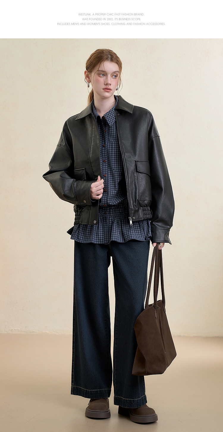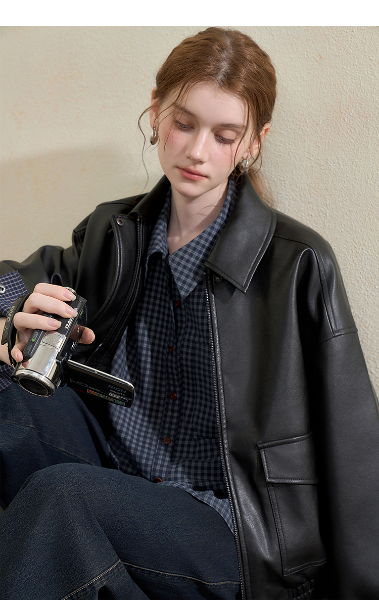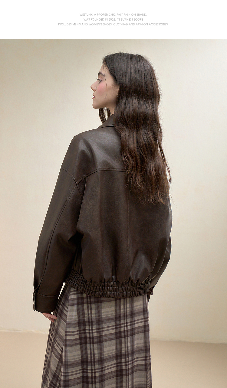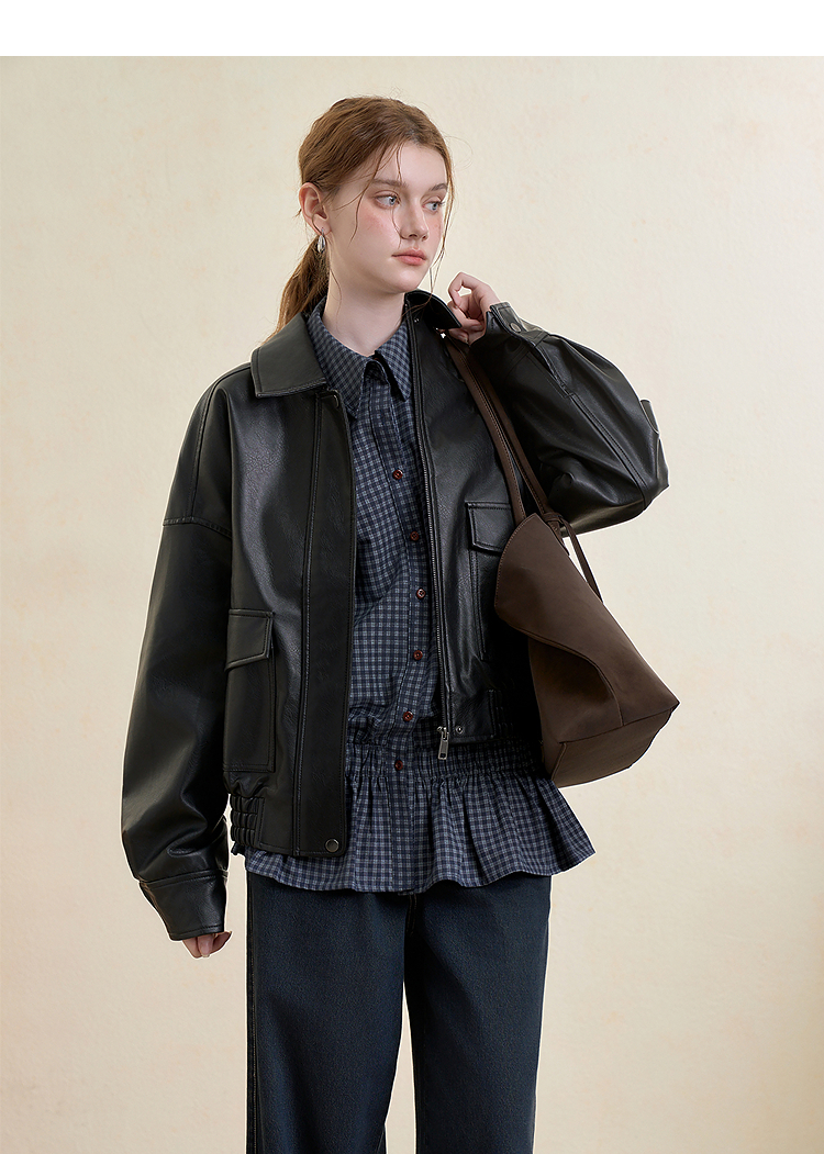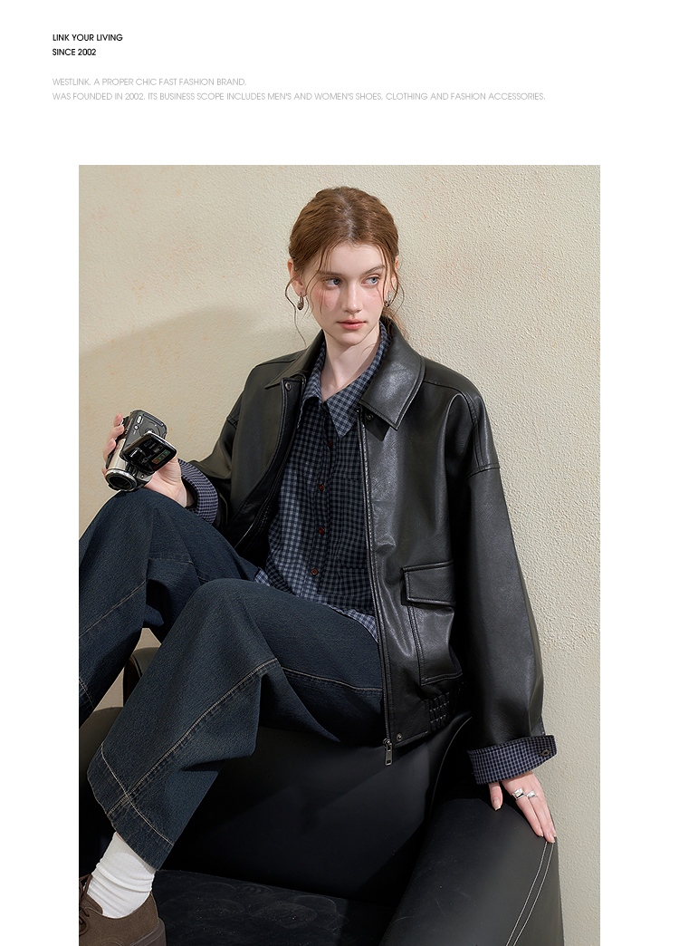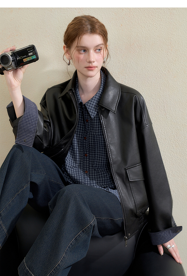 西遇复古休闲摩登质感pu皮夹克外套女秋季宽松廓形显瘦机车服V3151296