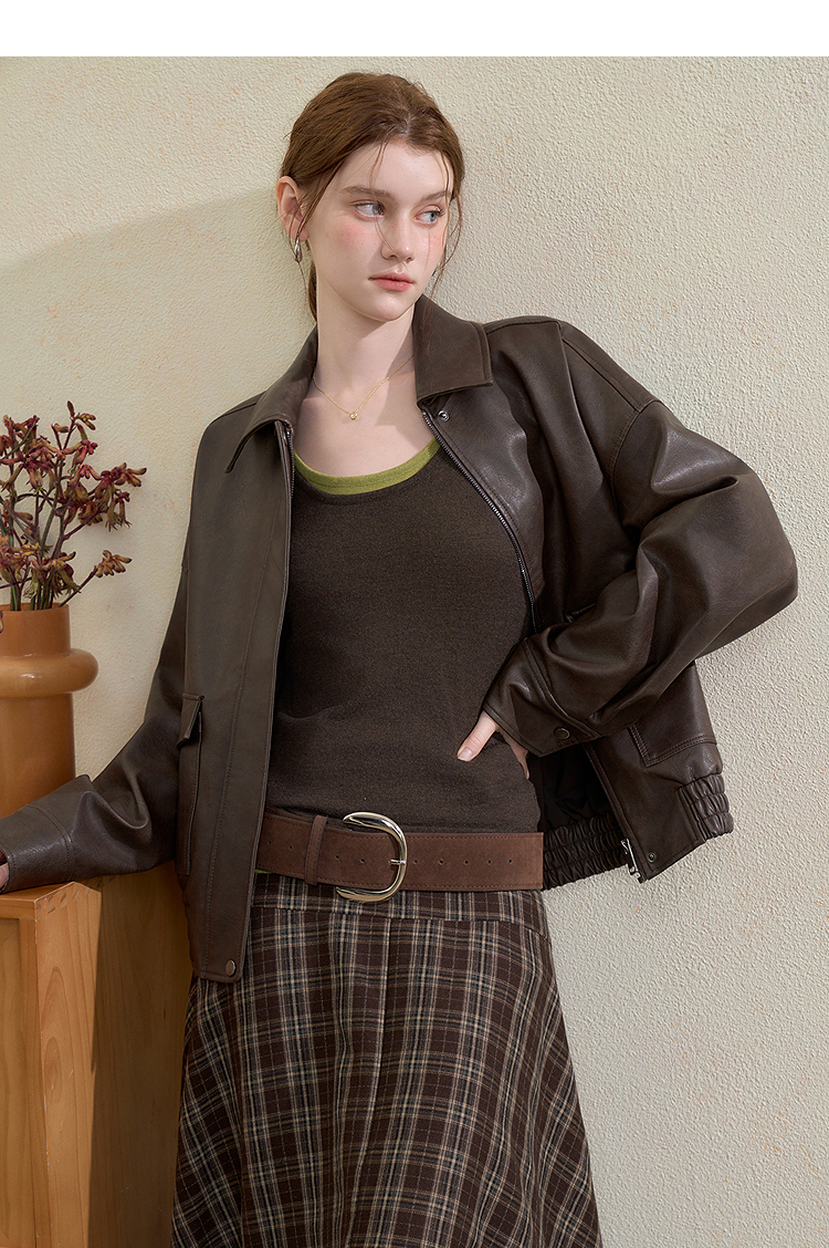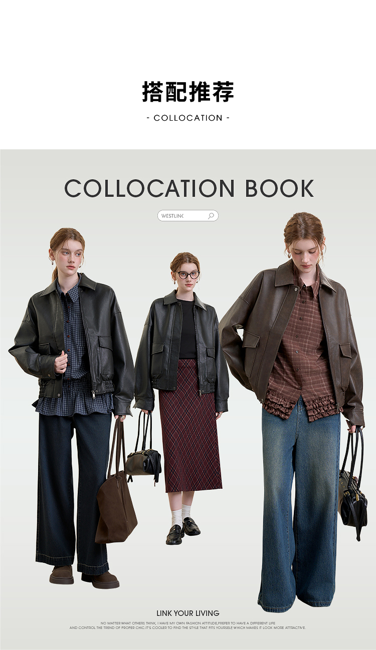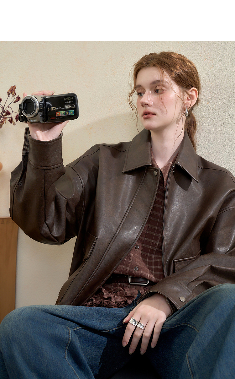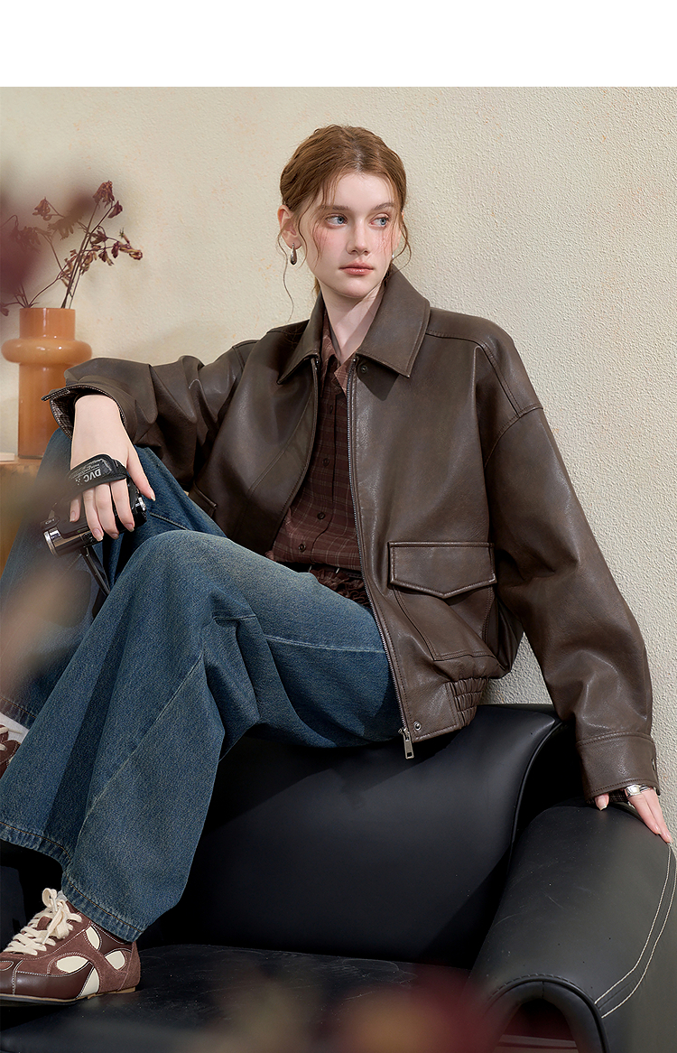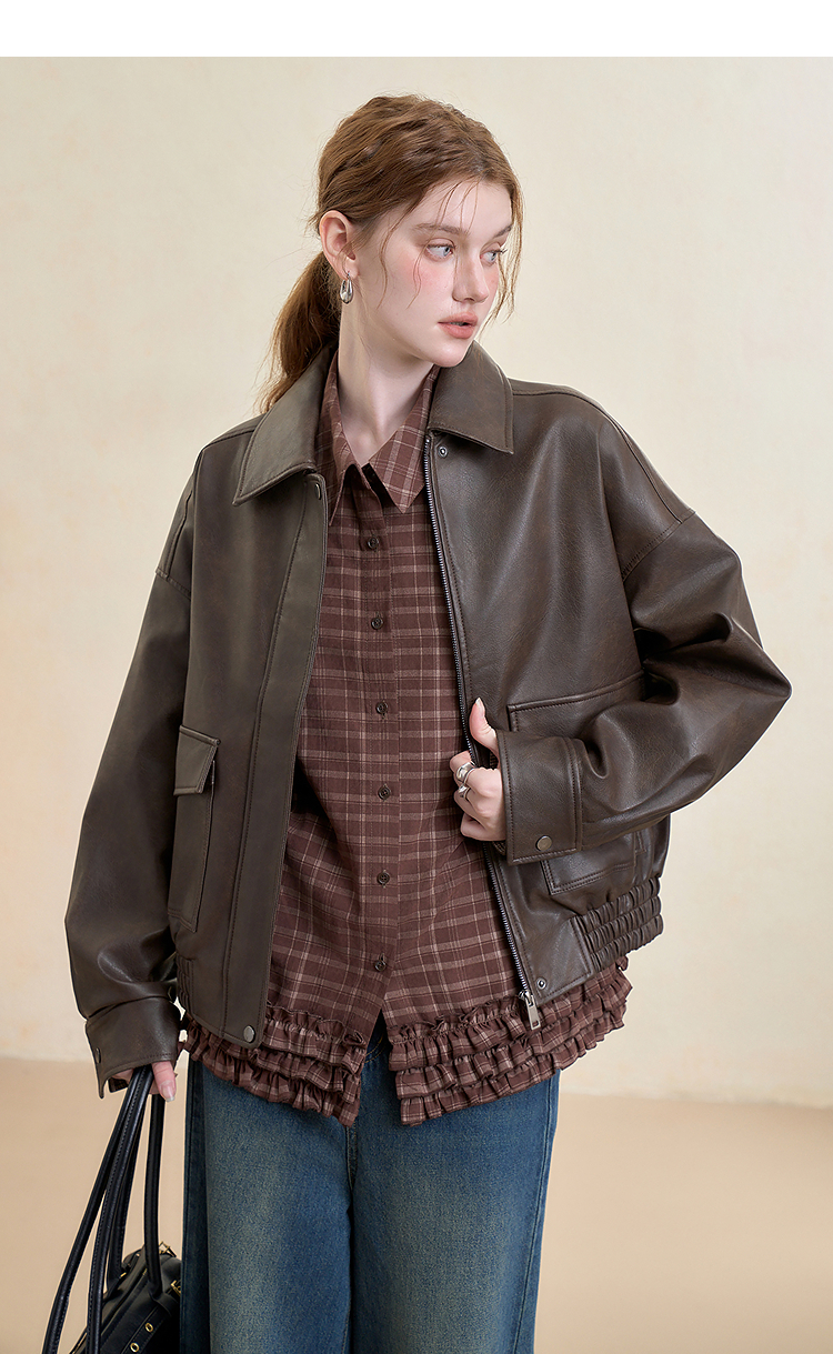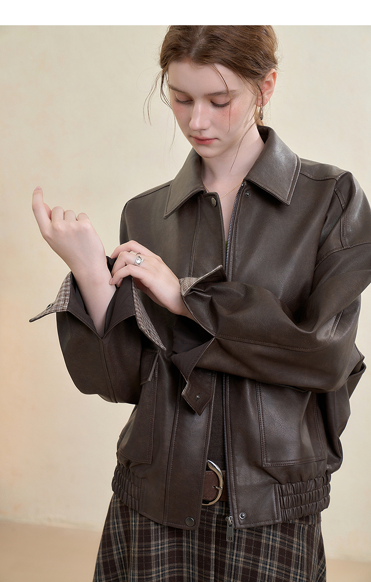 西遇复古休闲摩登质感pu皮夹克外套女秋季宽松廓形显瘦机车服V3151296