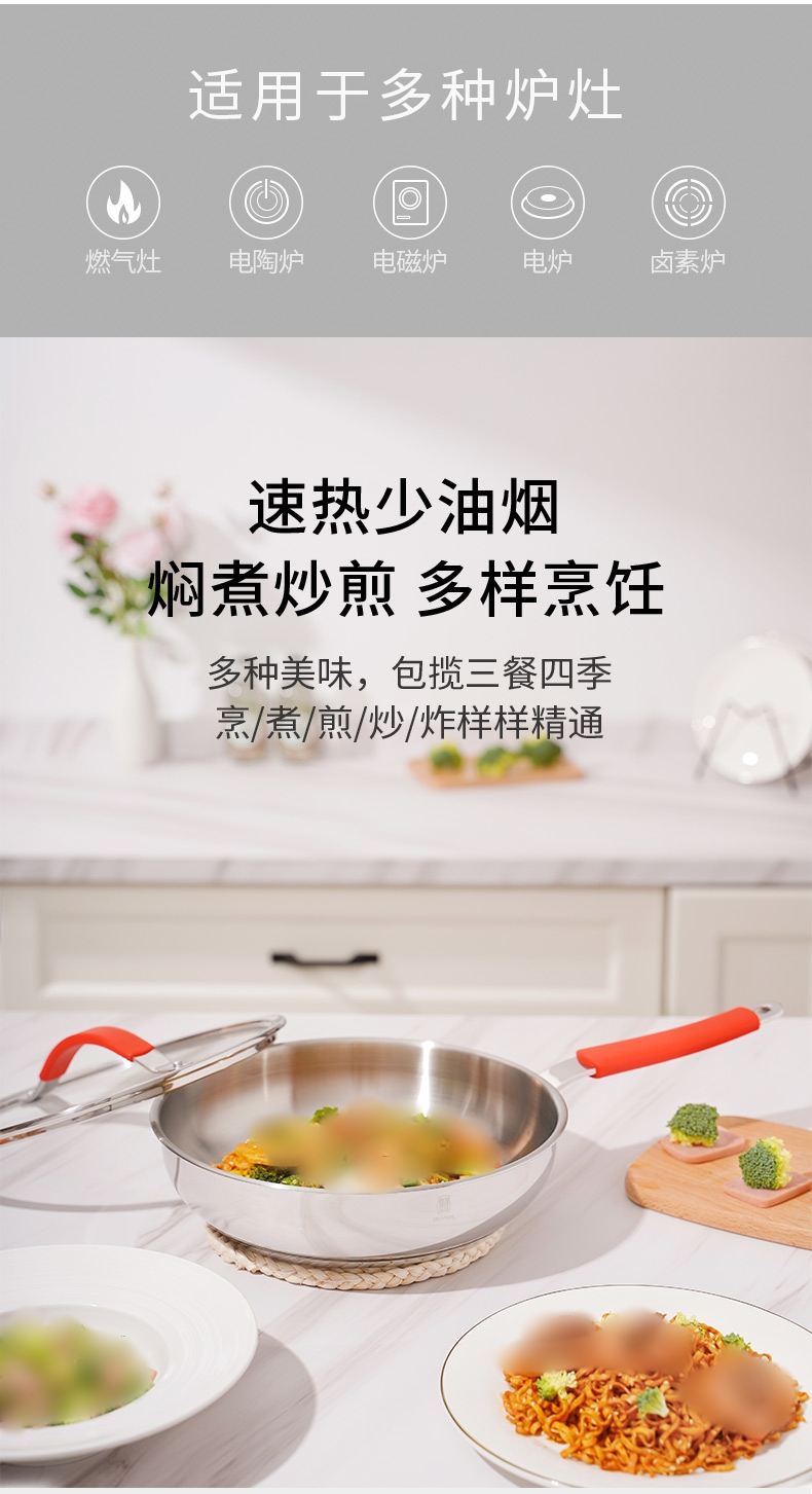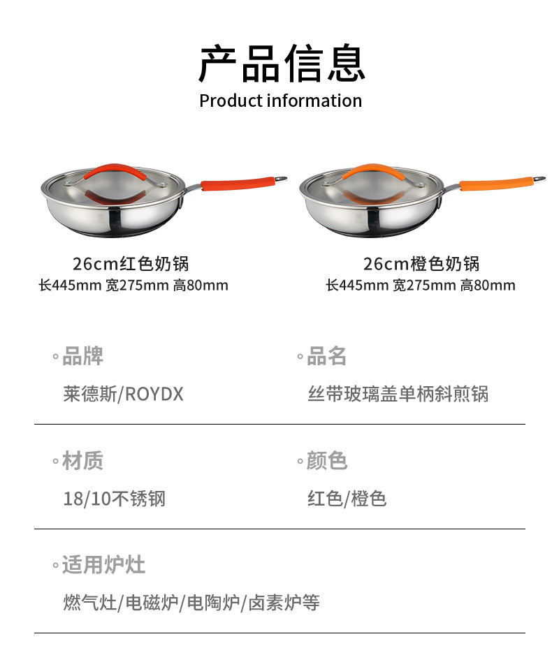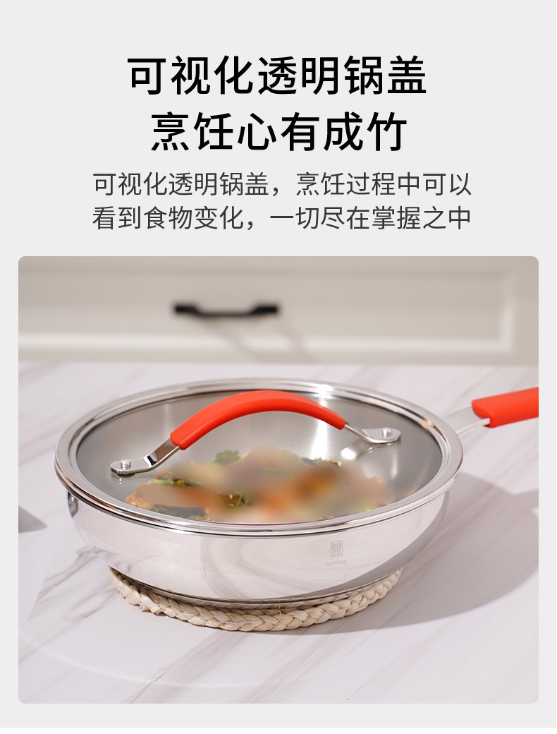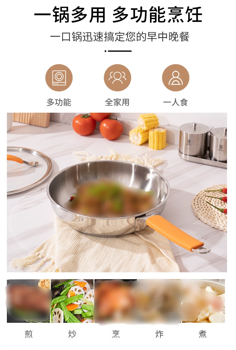 莱德斯26cm单柄煎锅 304不锈钢无涂层家用煎炒一体丝带锅具