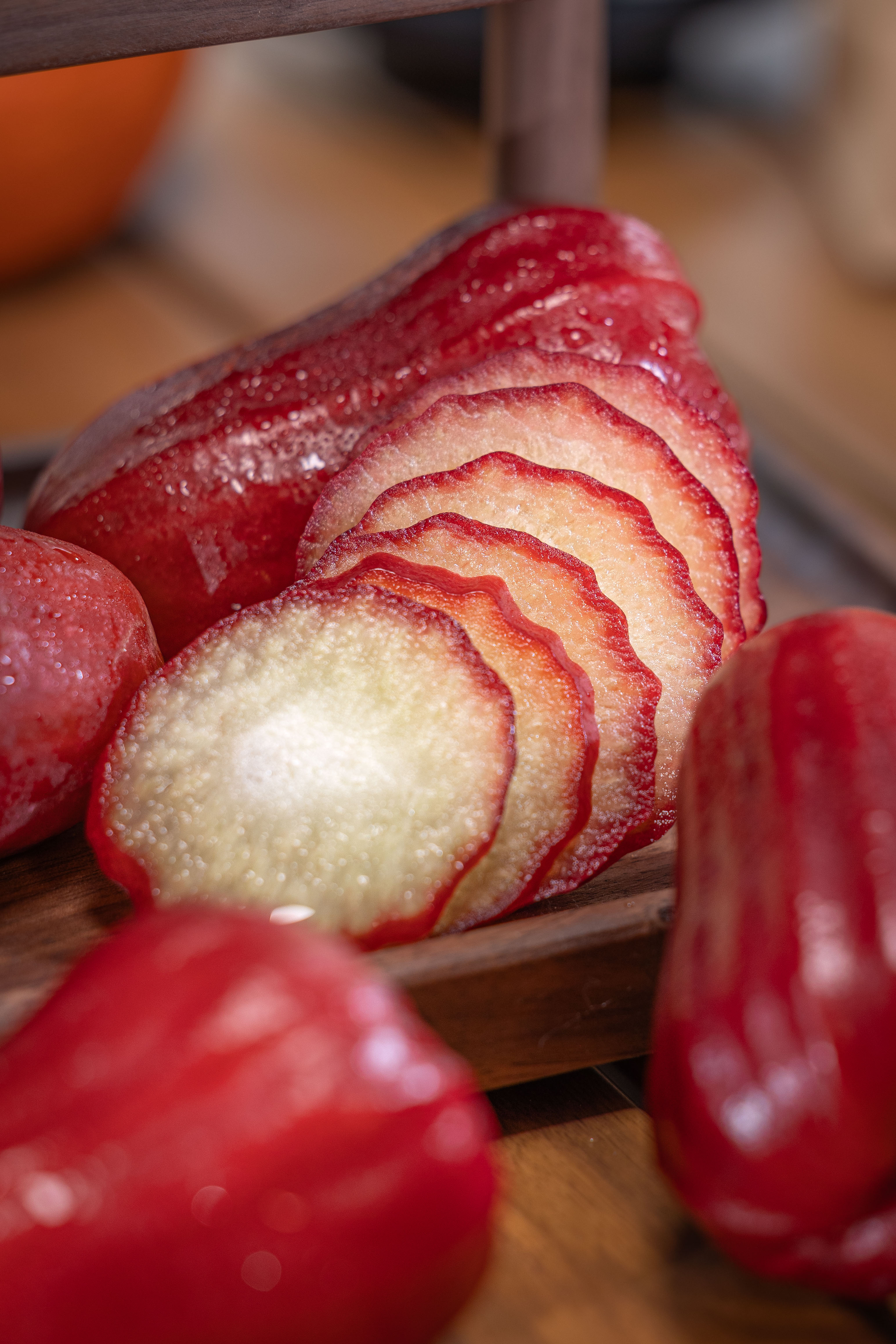蜜风铃莲雾的果实饱满多汁,口感细腻,甜而不腻。果皮薄而易于剥离,果肉富含水分和纤维,吃起来非常清爽。