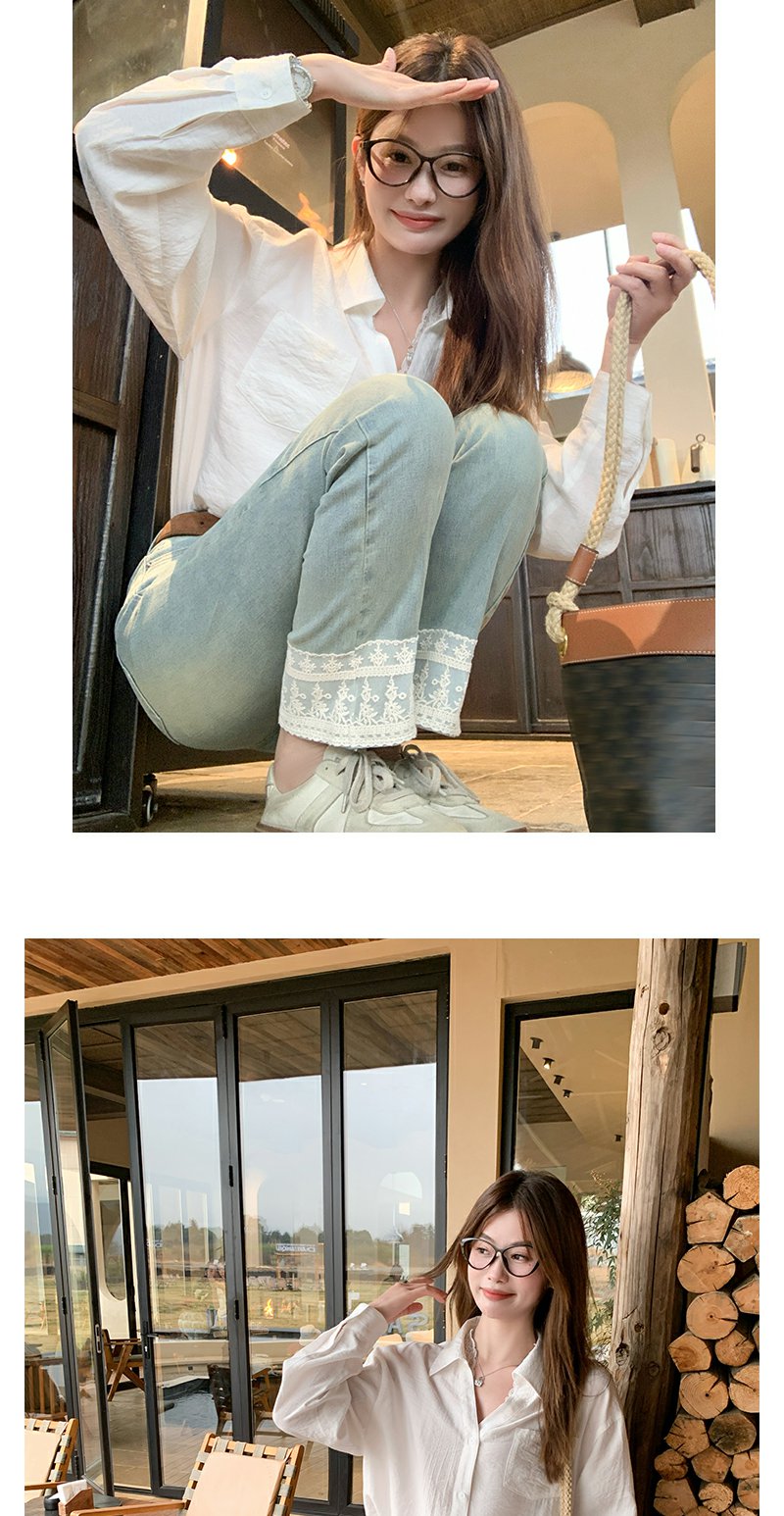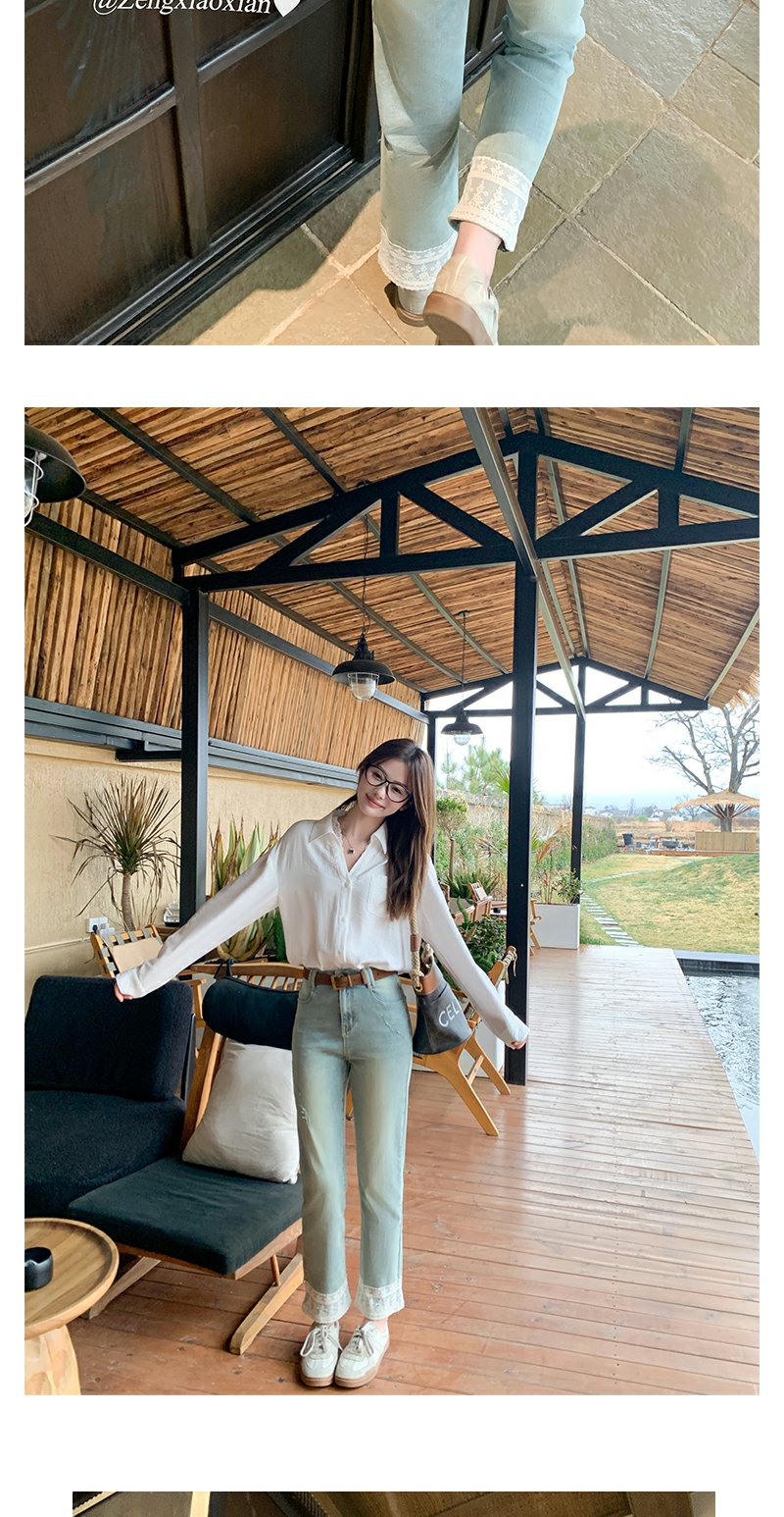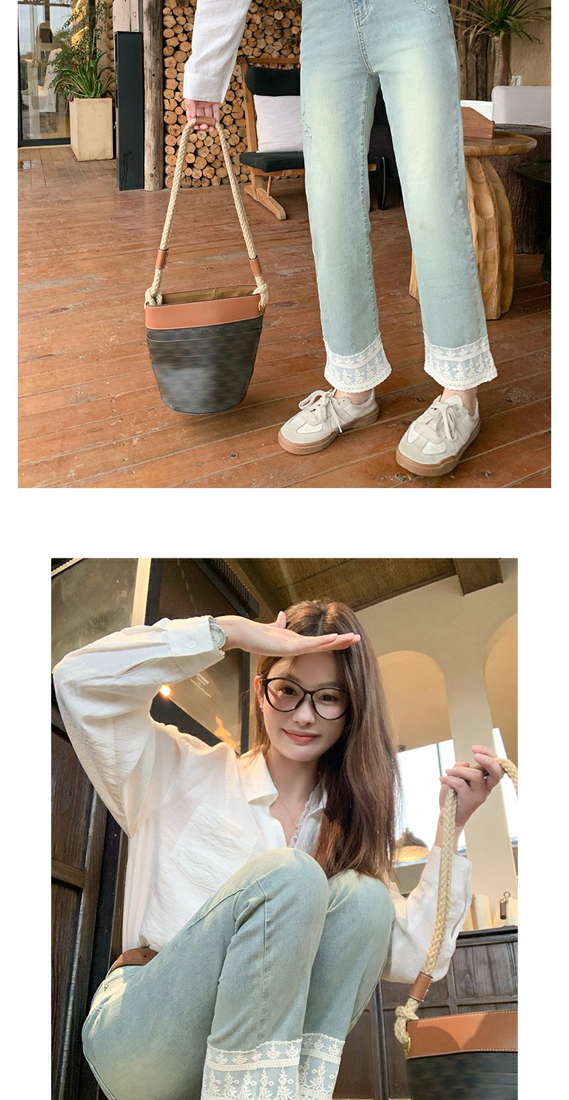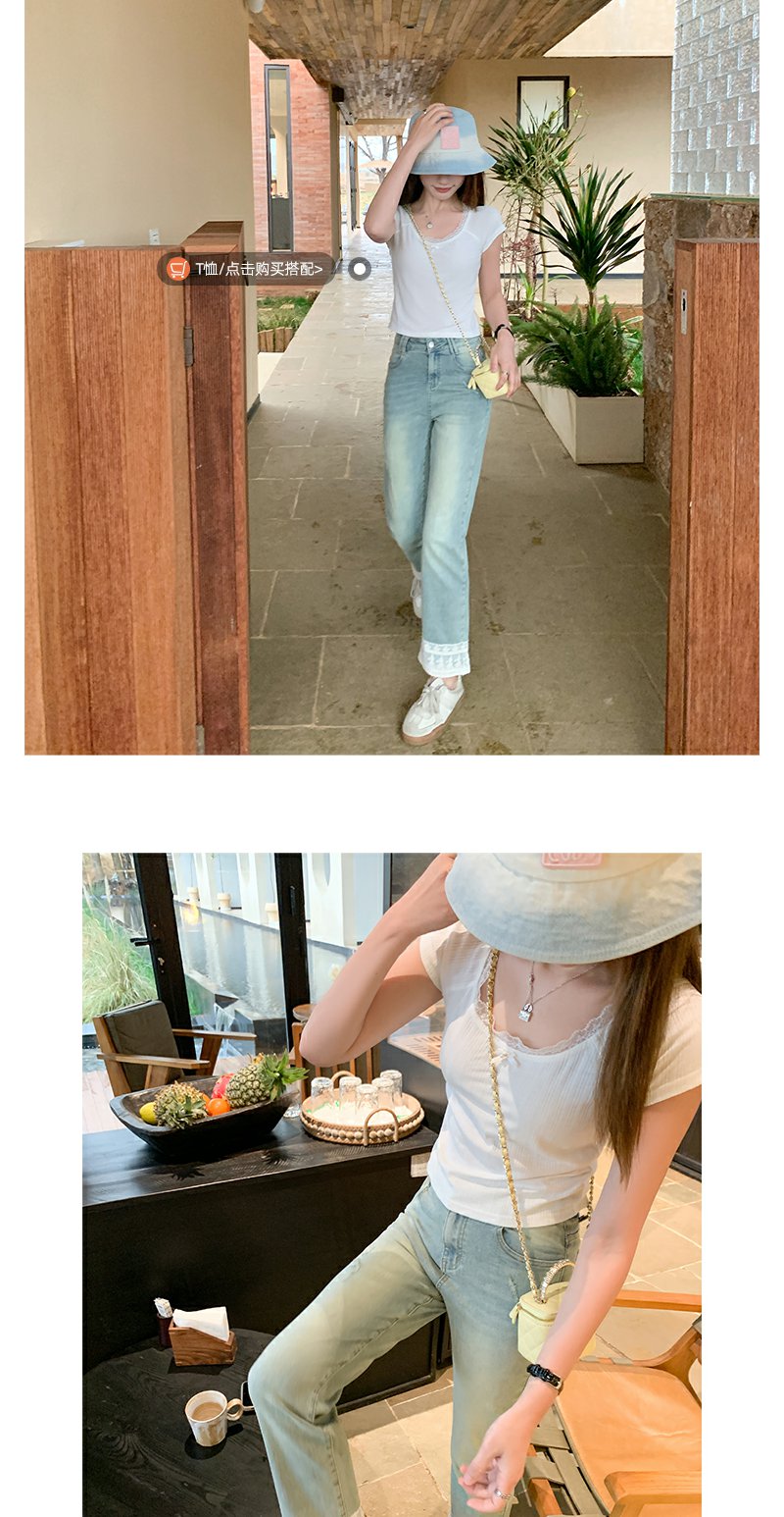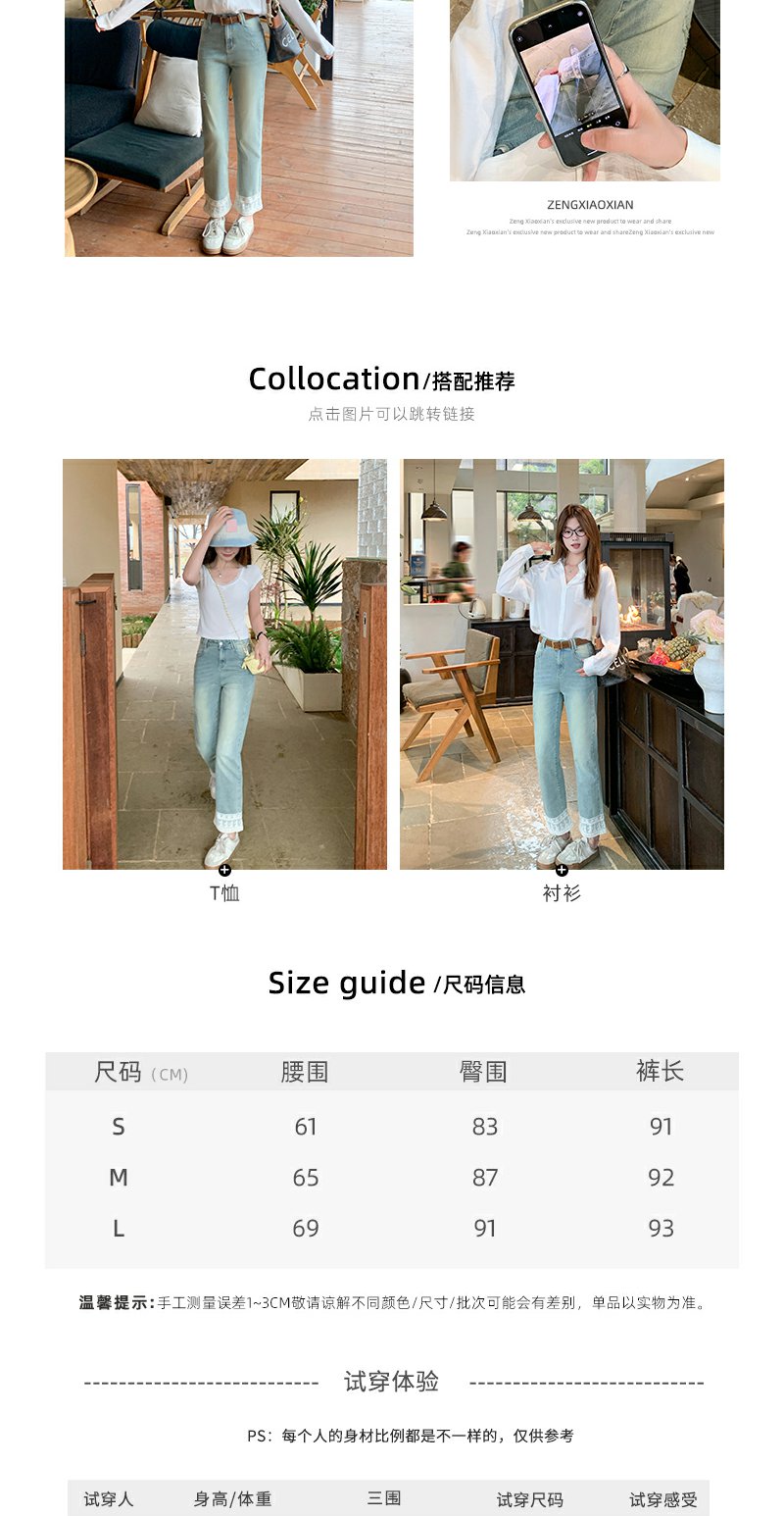 <曾小咸推荐>设计感拼接蕾丝蓝色高腰显瘦牛仔裤