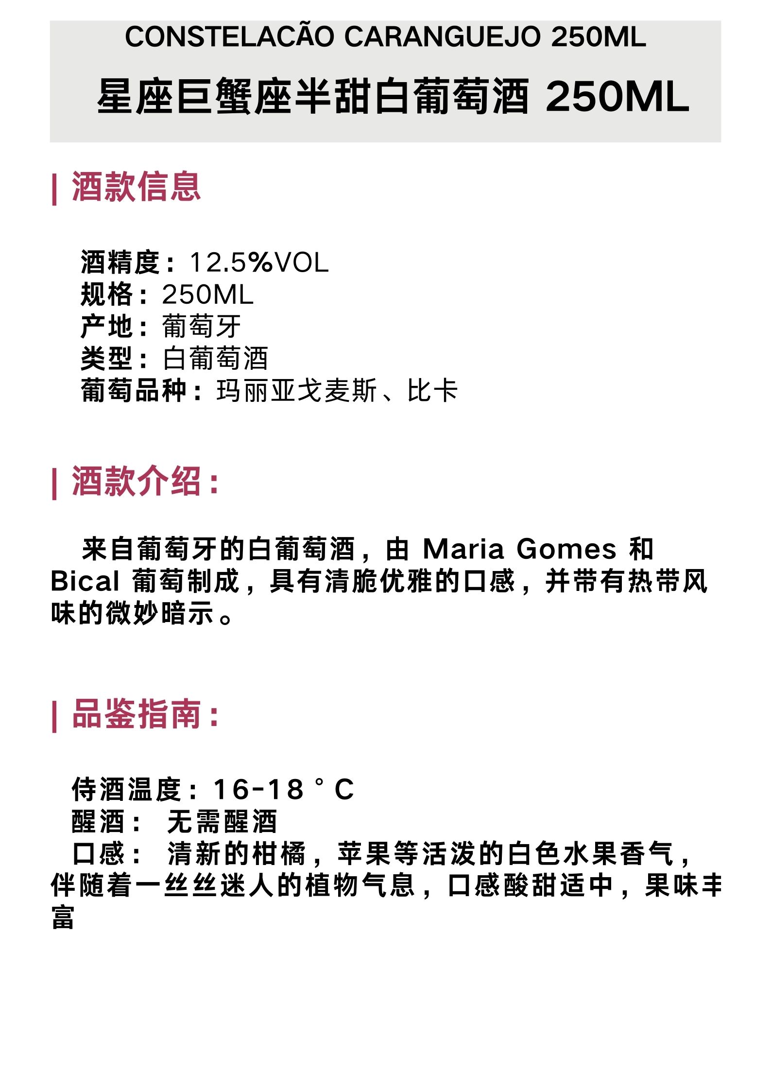 星座巨蟹座半甜白葡萄酒 250ML