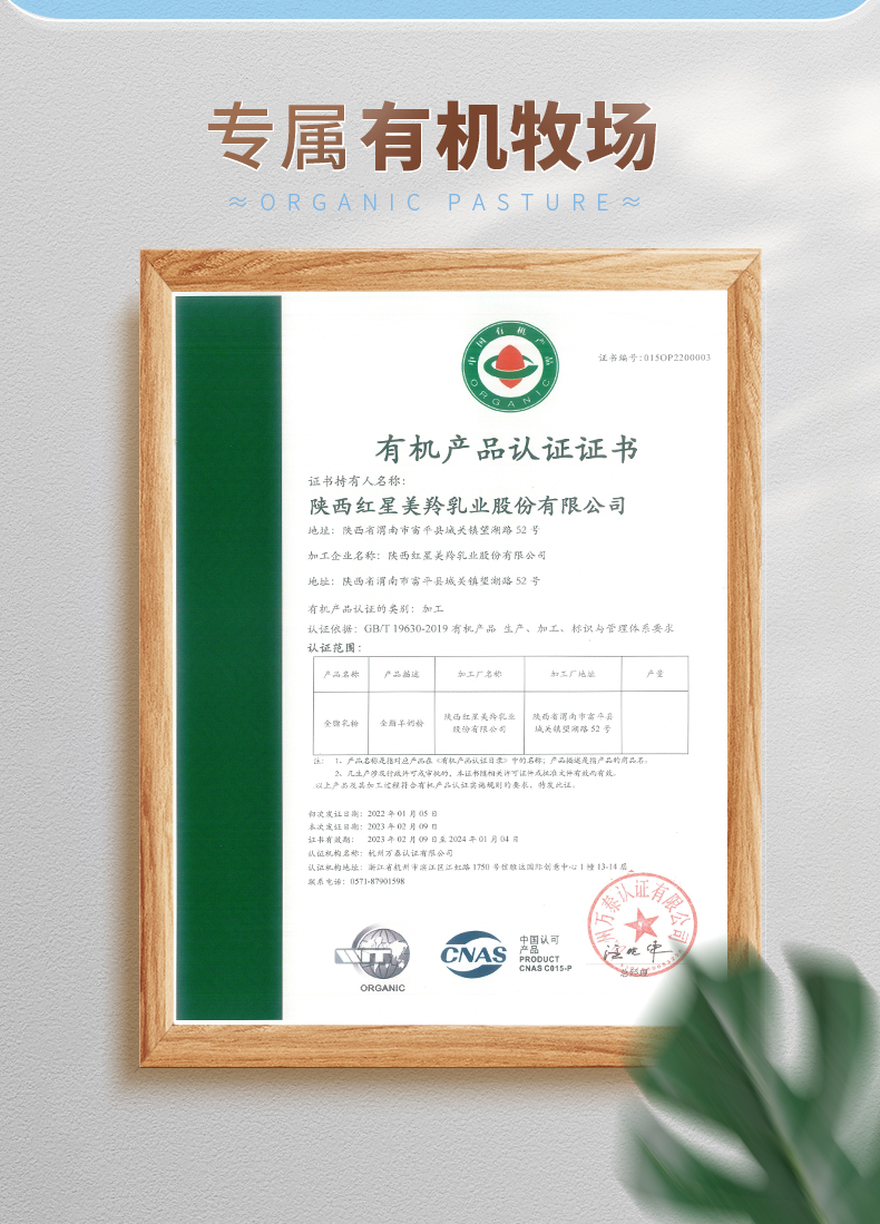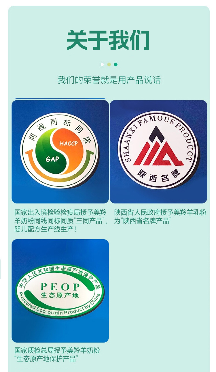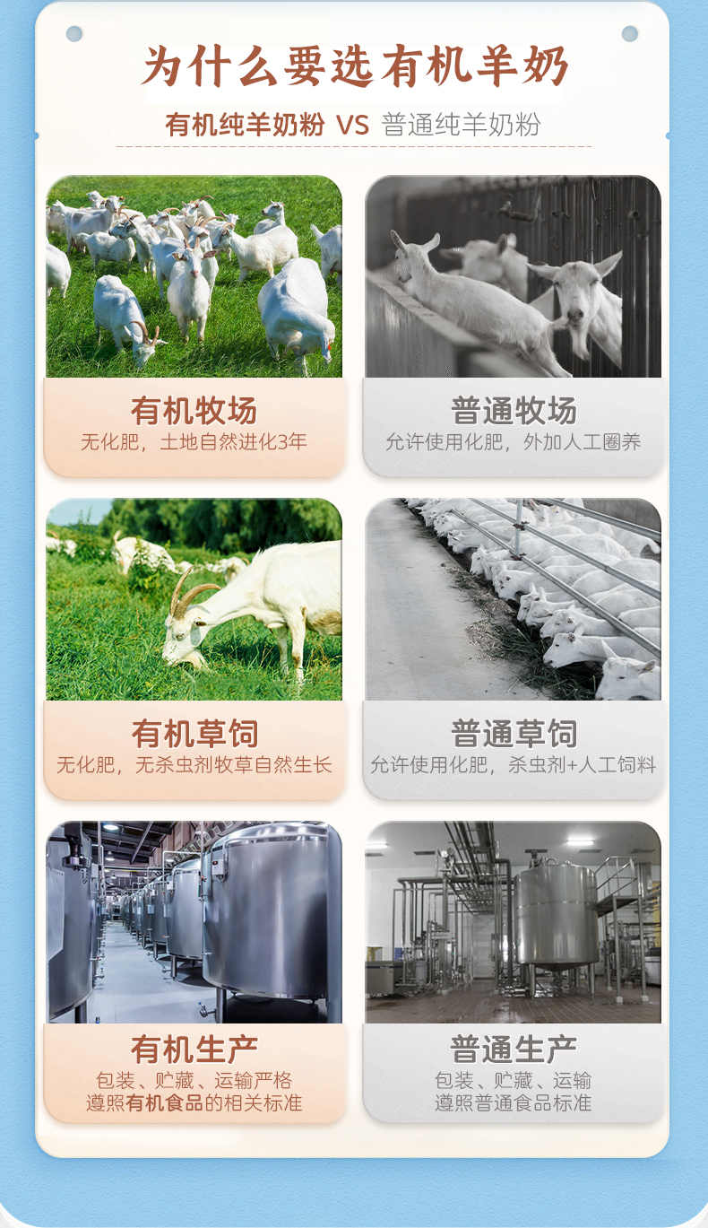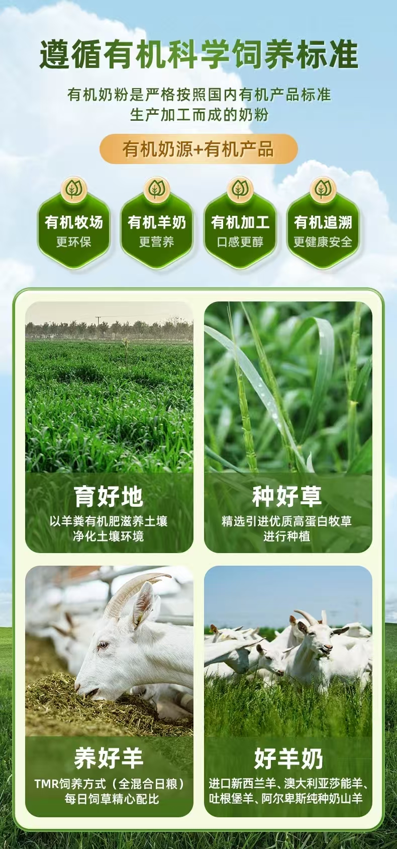 美玲有机羊奶粉,他们家从种草、奶羊培育、养羊、挤奶、生产、销售,是全产业链的羊奶企业,品质是靠的住的。
