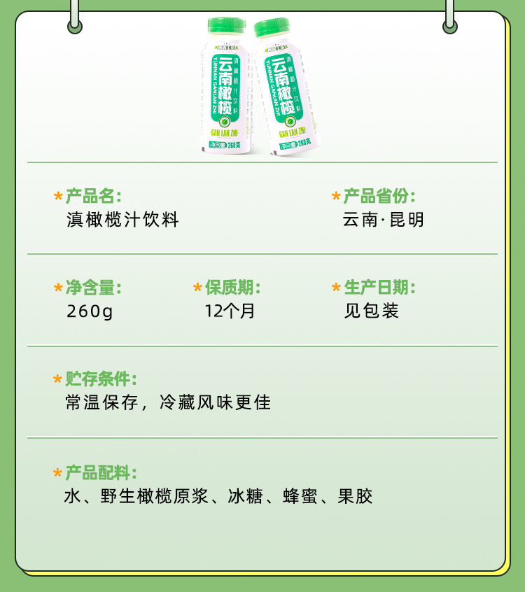 阿伲工坊牌饮品滇橄榄汁260g/瓶