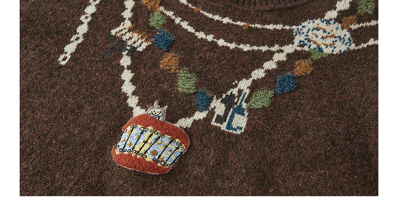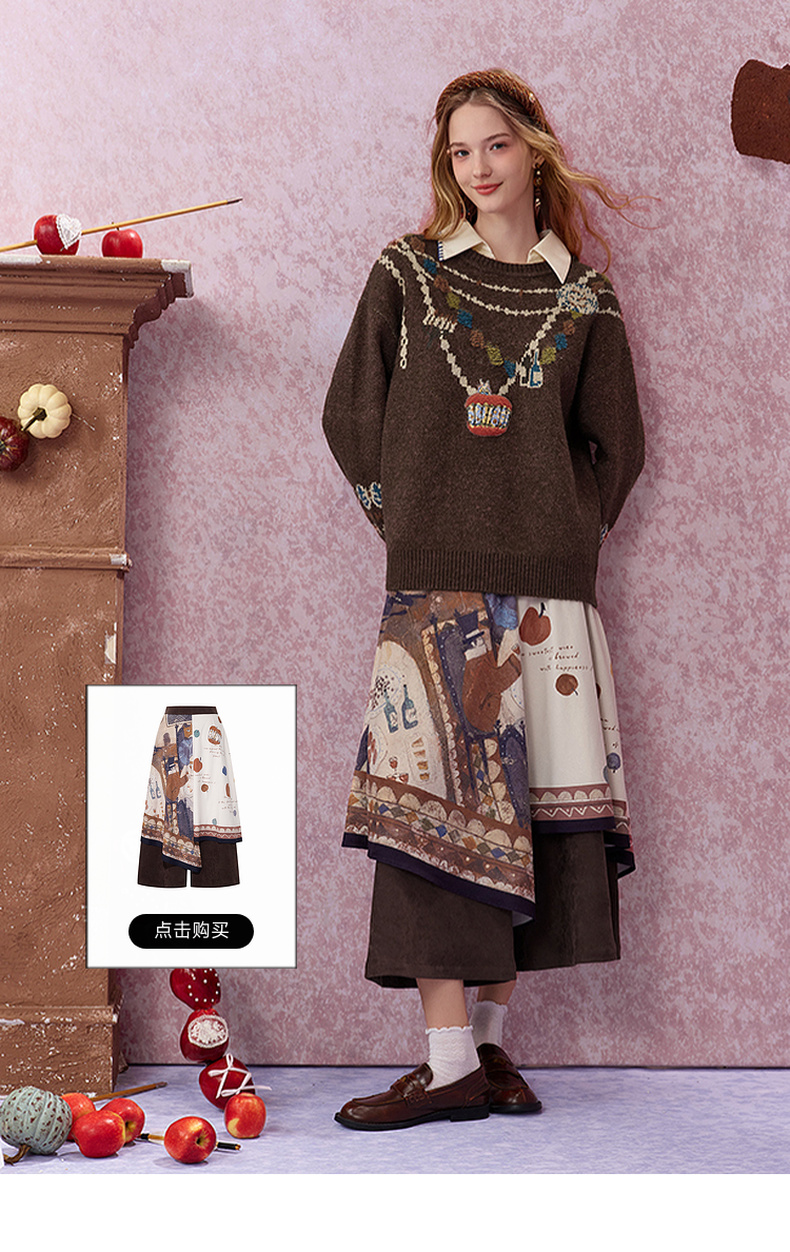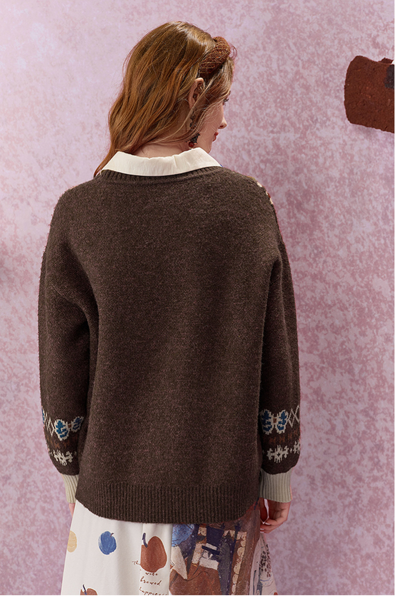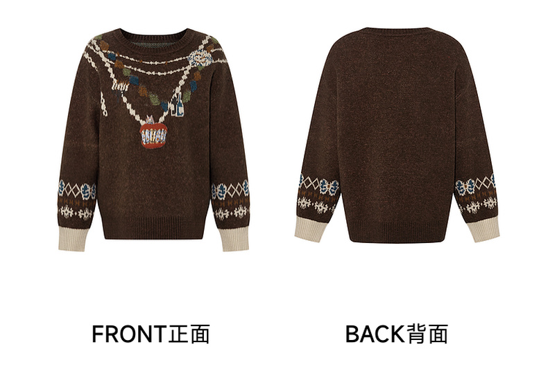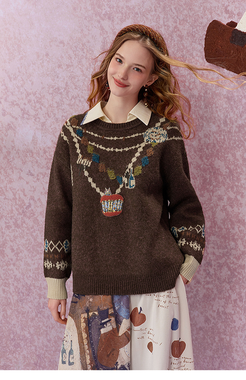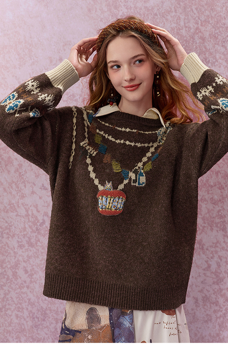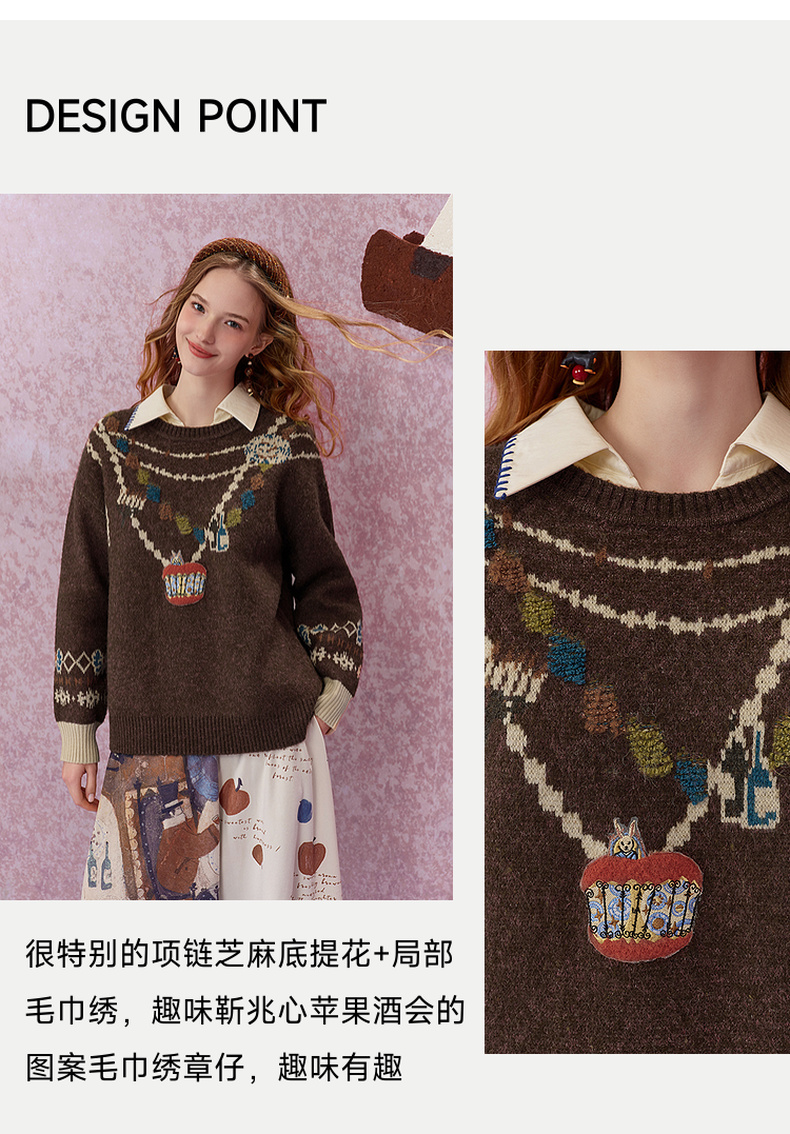 两三事 蜜糖盛宴 2025秋季新款复古项链提花图案套头毛衣女宽松