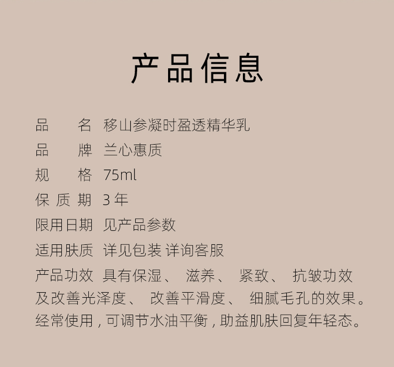 【补水控油 润泽修护 提亮细腻】移山参凝时盈透精华乳 75ml 兰心惠质
