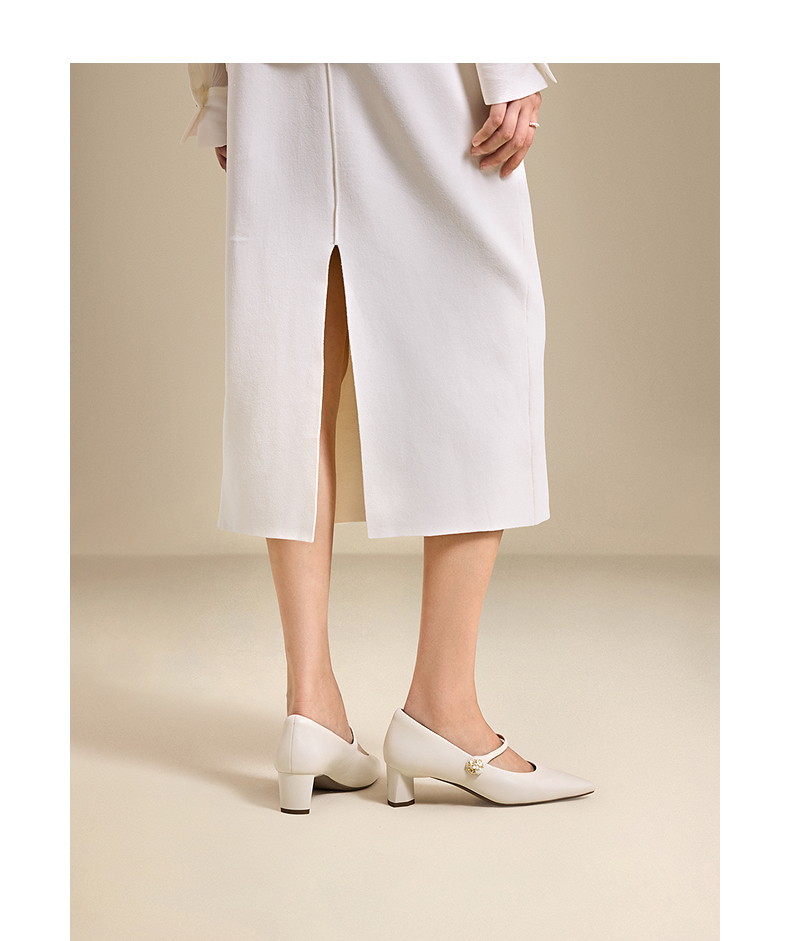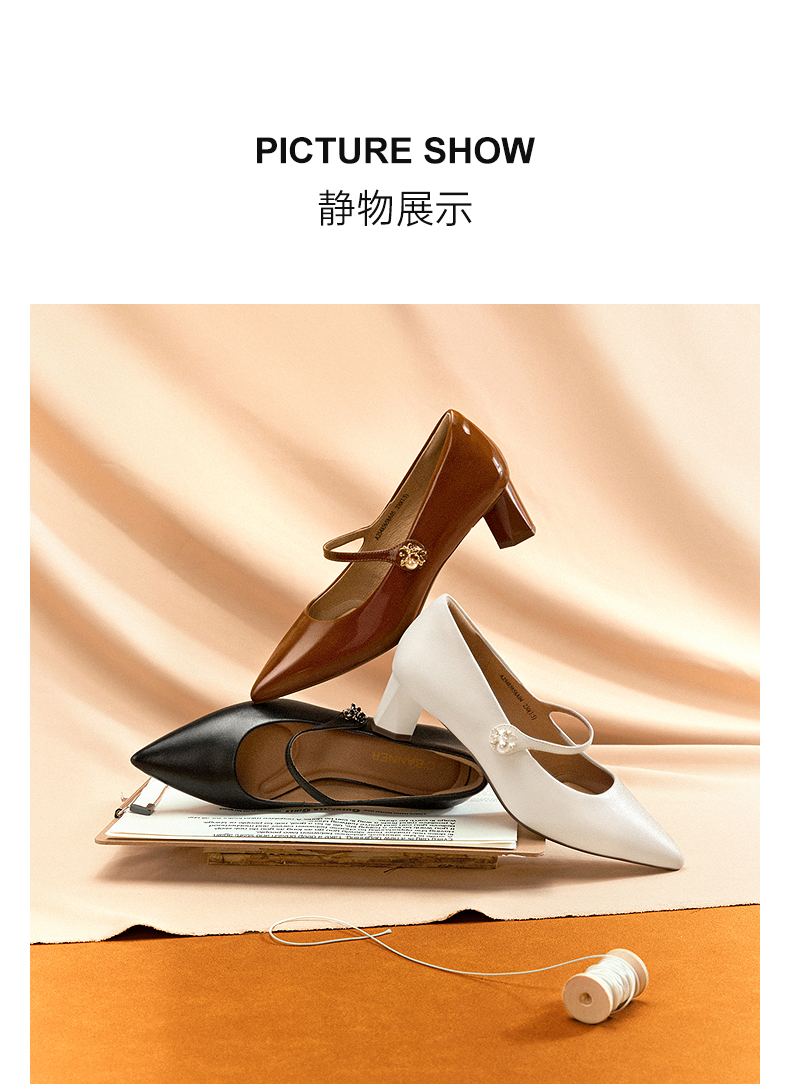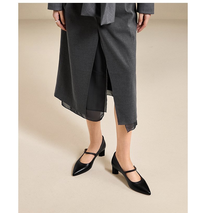 千百度羊皮粗高跟鞋女玛丽珍鞋法式裸色尖头浅口单鞋A25485658
