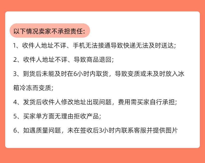 4. 生鲜产品不支持7天无理由退换货,如因地址错误、收件地址不详细、快递联络不上收件人等情况,造成的包裹延迟派送或拒拒签造成的损失,由买家自行承担!