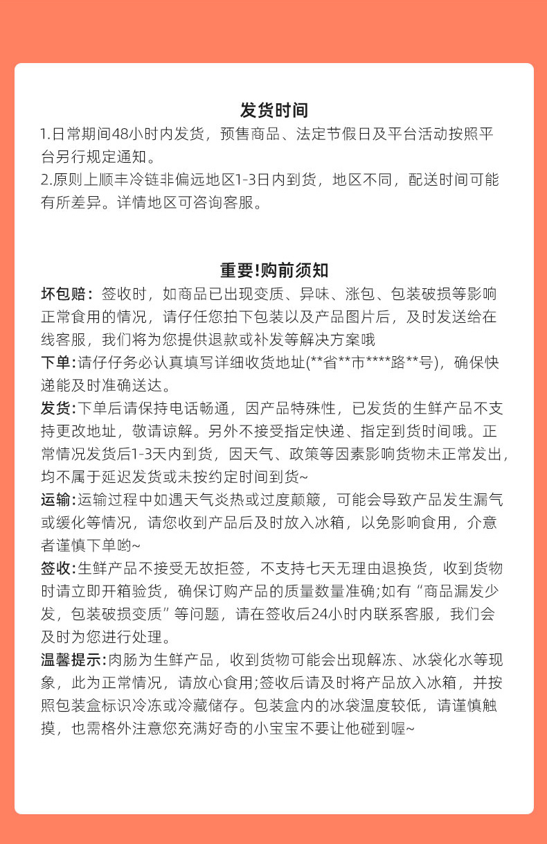 2. 下单后不支持修改地址,请下单前仔细核对收货地址,生鲜产品一经发出不支持退款,请见谅!