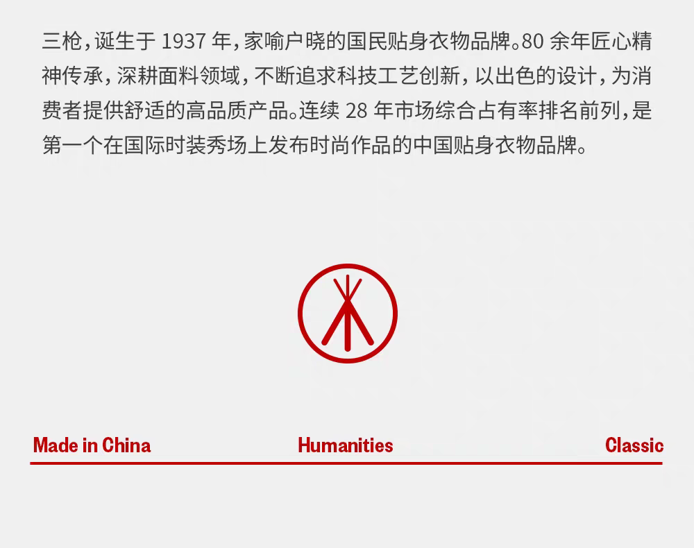 - 创建于1937年,中国代表性民族品牌 “引领内衣发展趋势,倡导身心合一的温馨生活” 是品牌的发展理念 始终致力于面料的舒适性和功能性开发 融合科技与时尚 用心呵护您的每一次贴身体验
