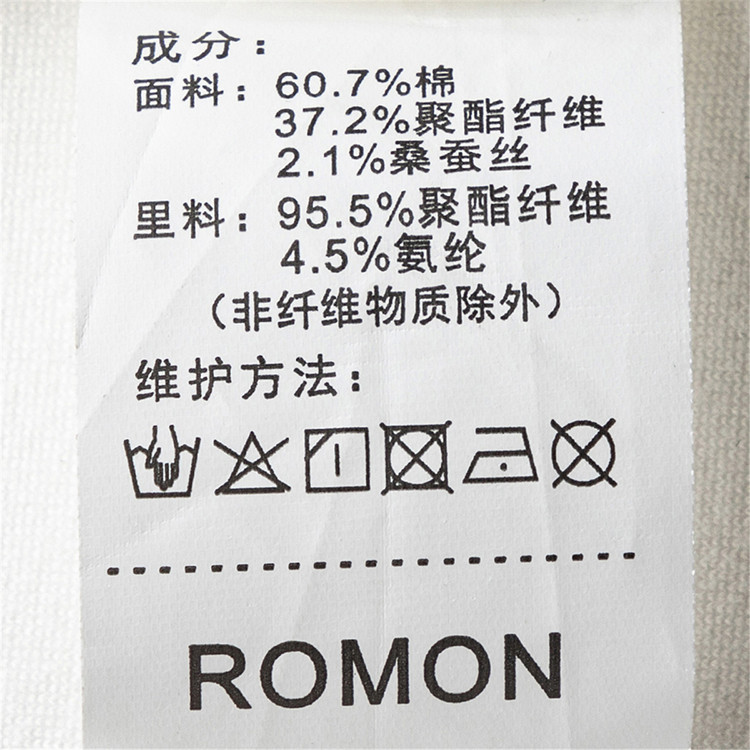 面料:60.7%棉 37.2%聚酯纤维 2.1%桑蚕丝