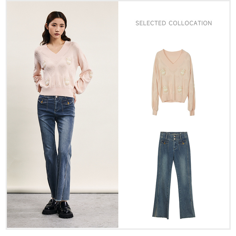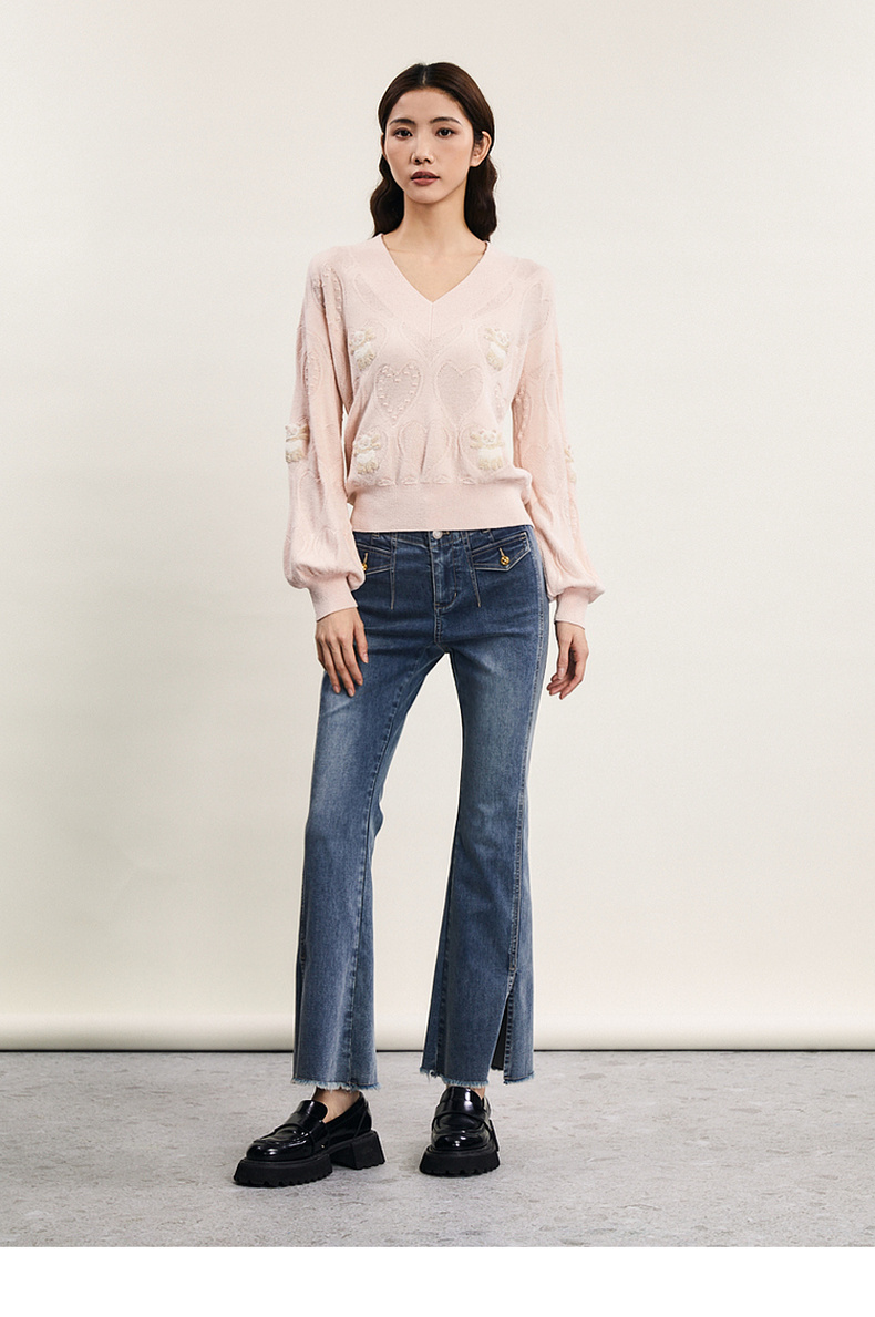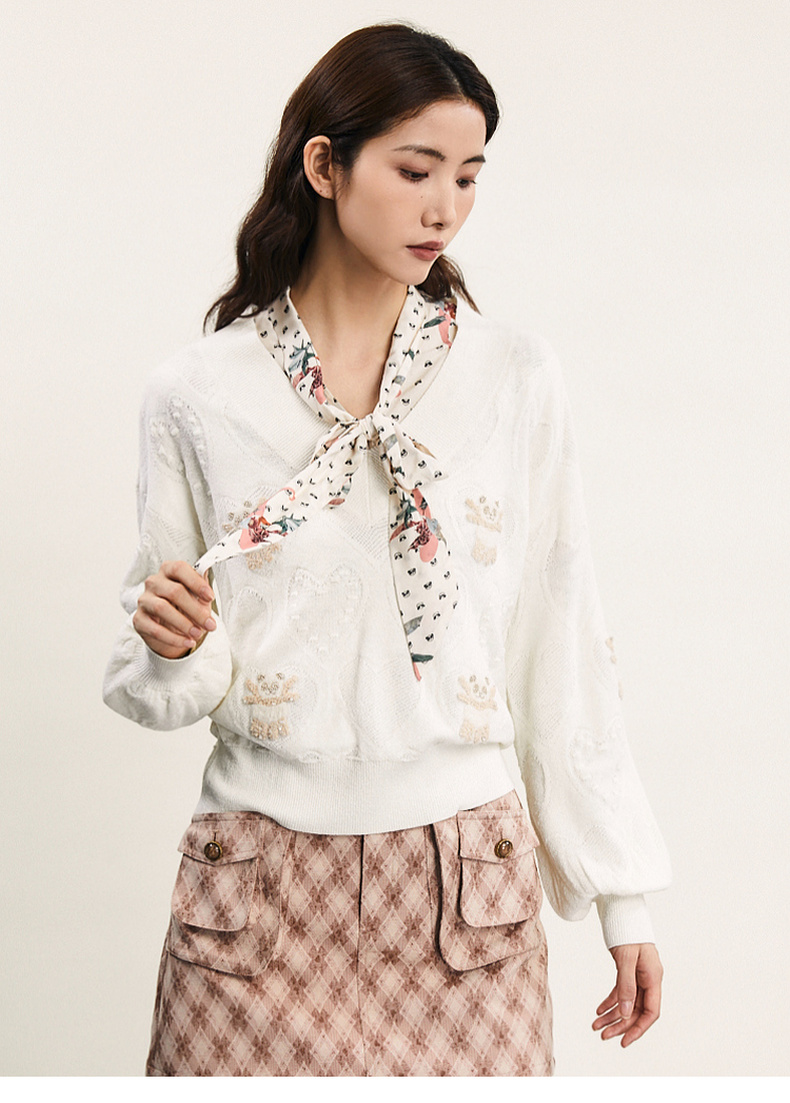 谜底V领套头针织衫女2024春新款文艺风特色绣花合体毛衫241MZ0310