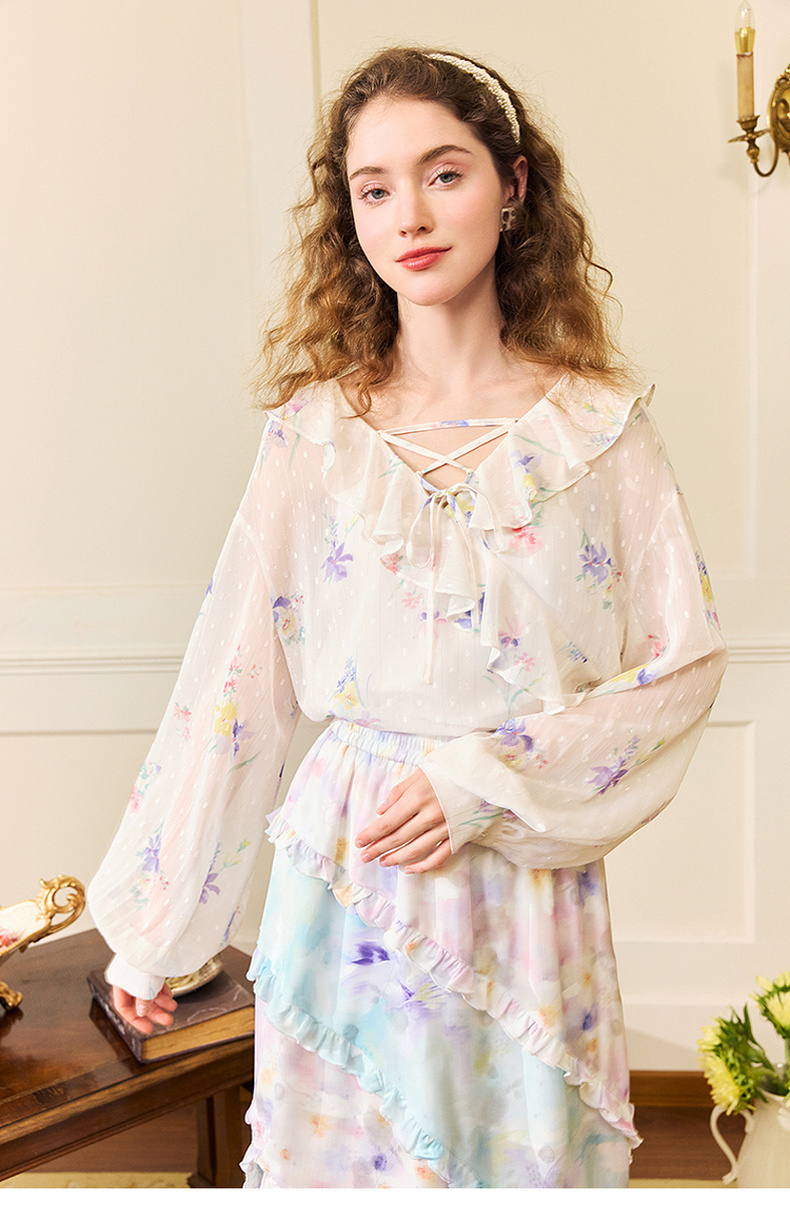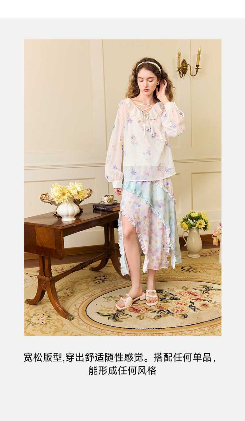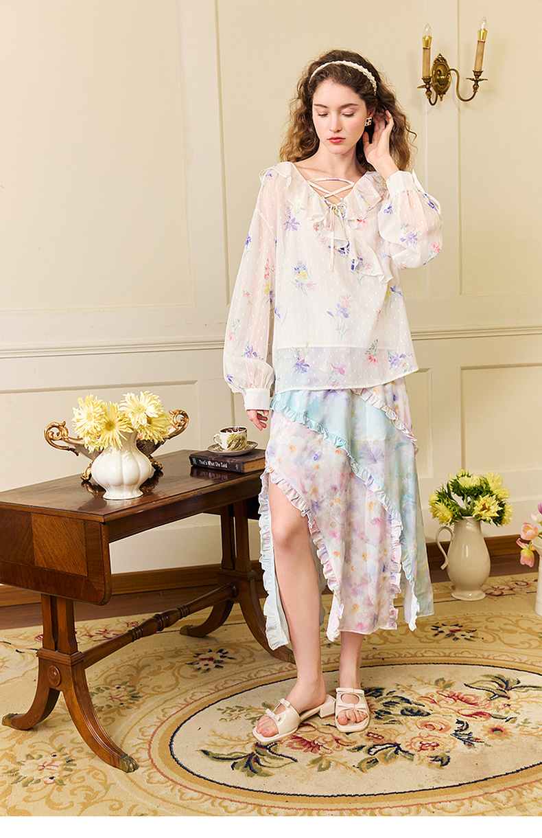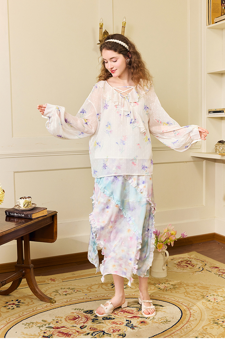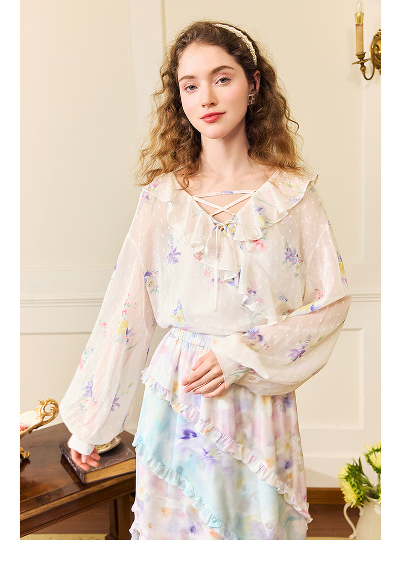 两三事雾里看花2024夏季新款法式印花荷叶边两件套雪纺衫女宽松