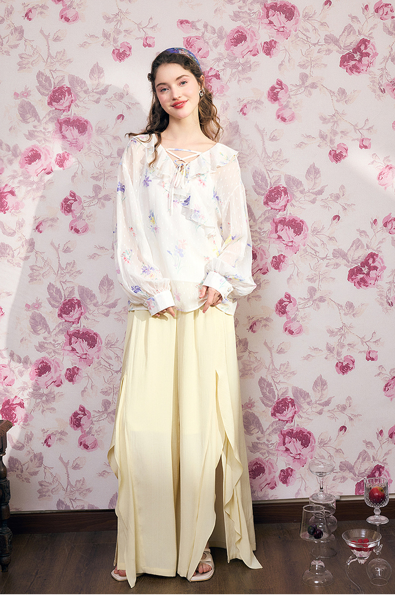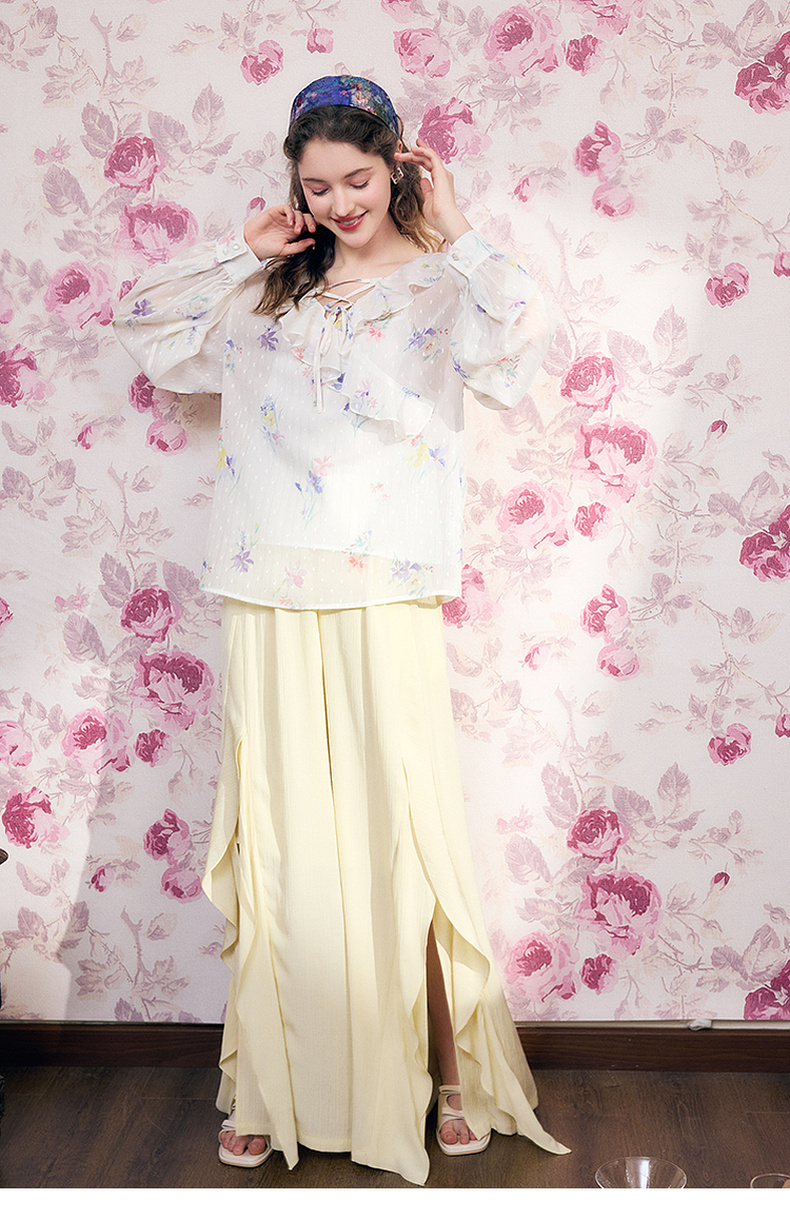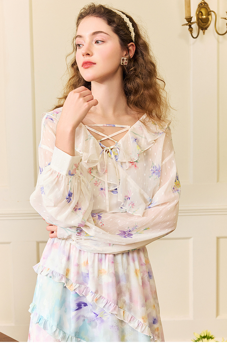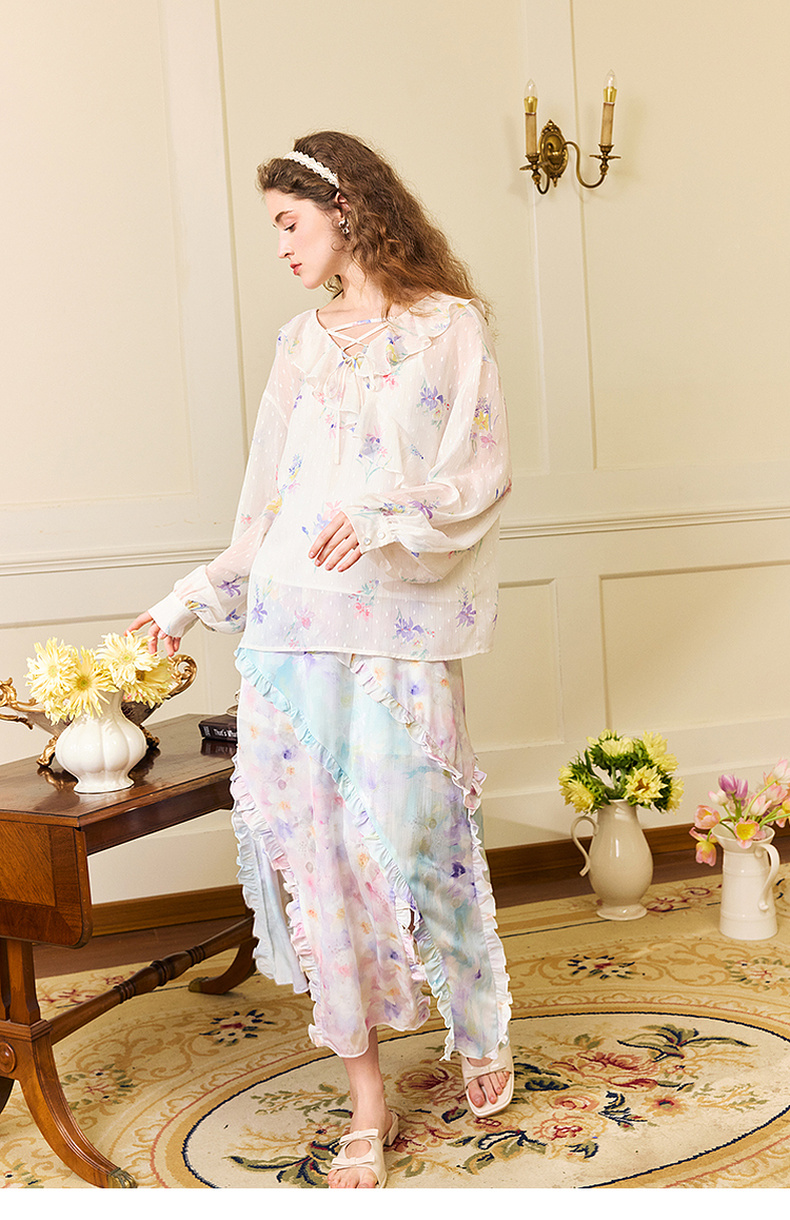 两三事雾里看花2024夏季新款法式印花荷叶边两件套雪纺衫女宽松