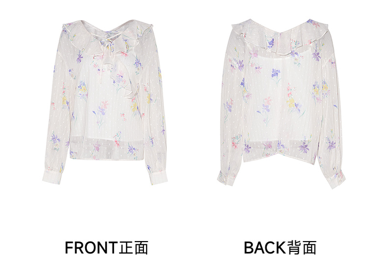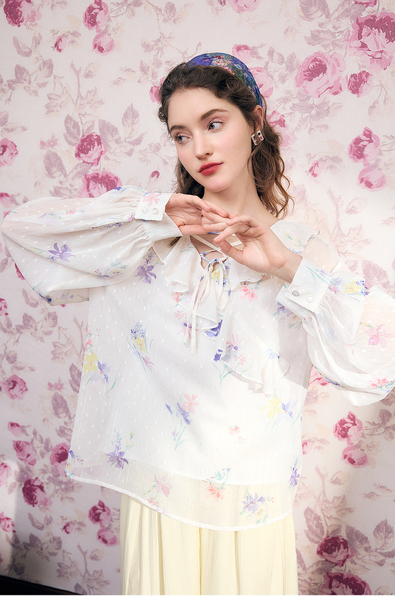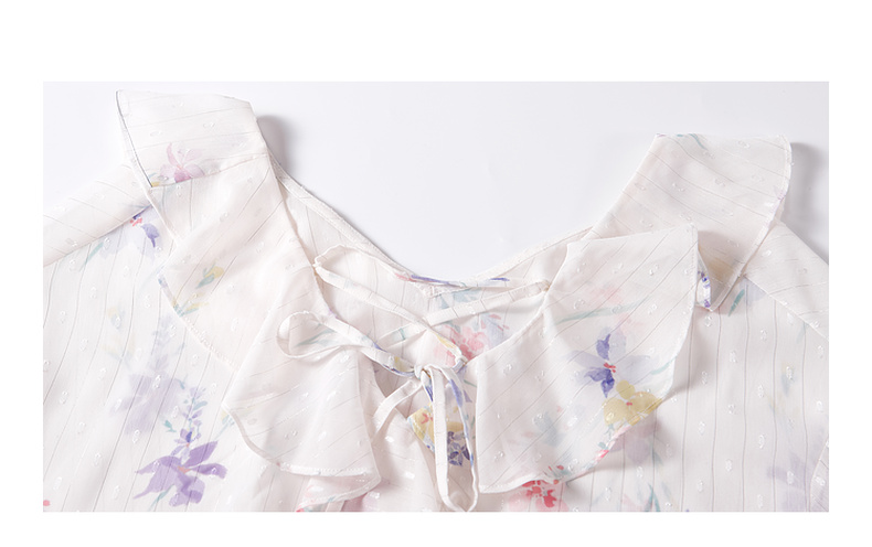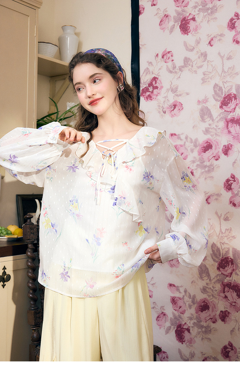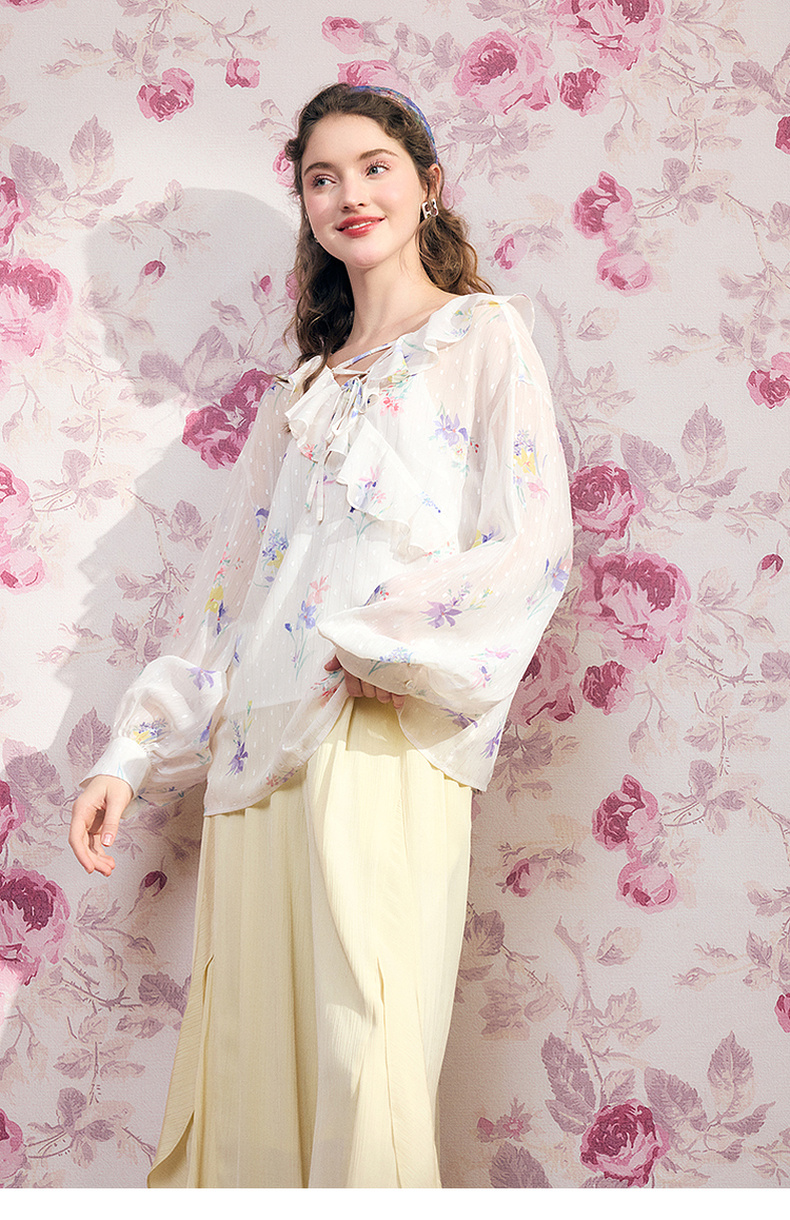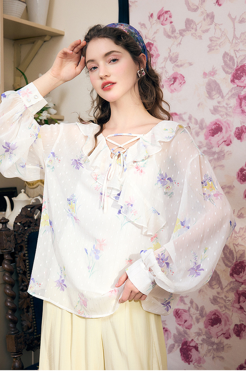 两三事雾里看花2024夏季新款法式印花荷叶边两件套雪纺衫女宽松