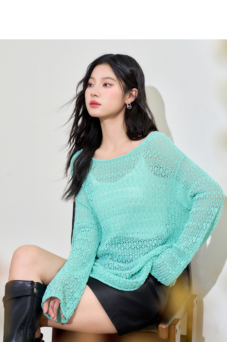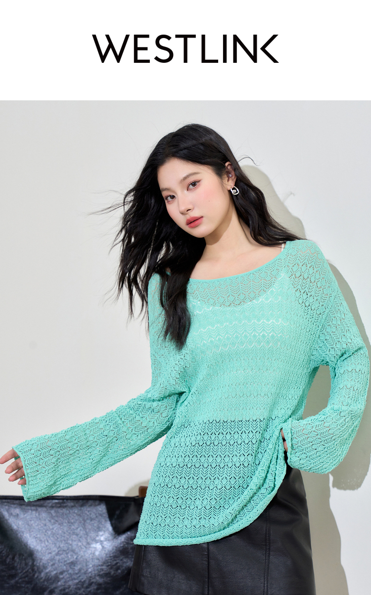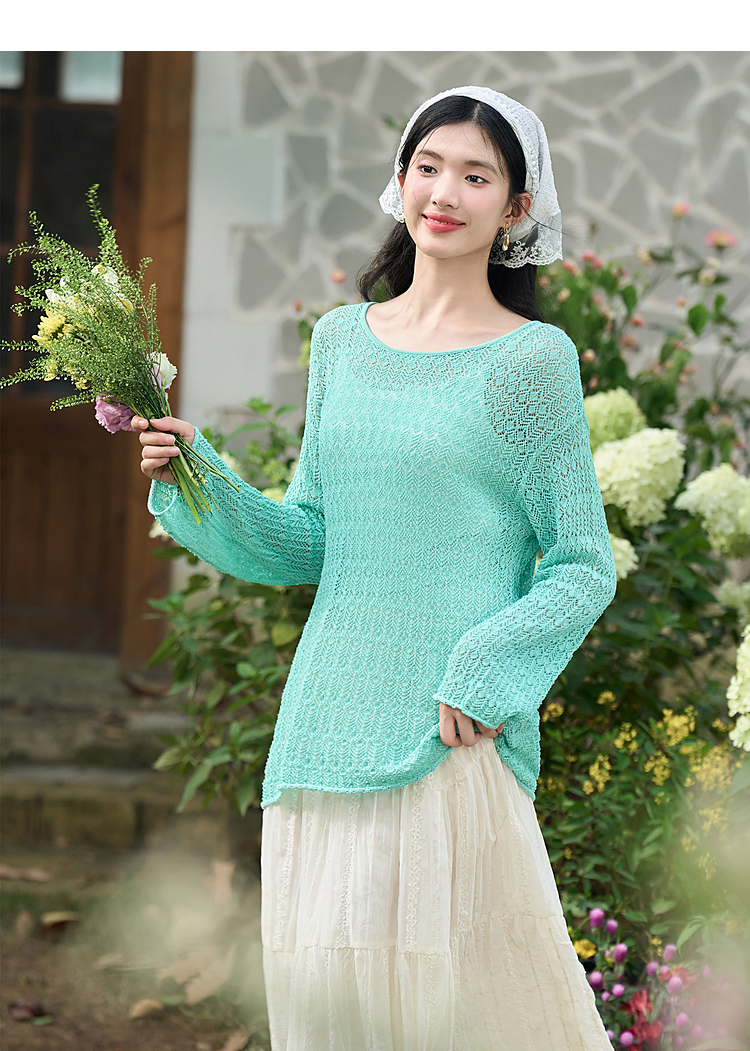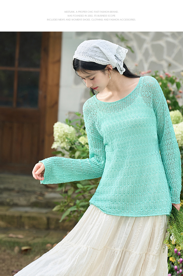 日薄荷曼波长袖镂空针织衫T恤女轻薄罩衫上衣V2942142