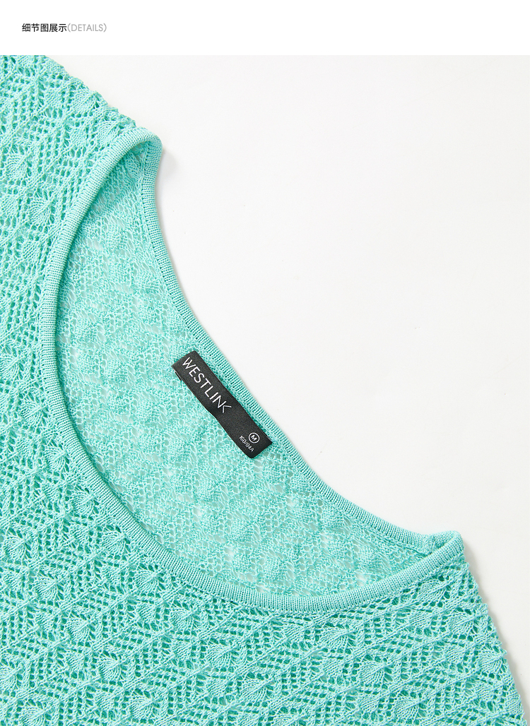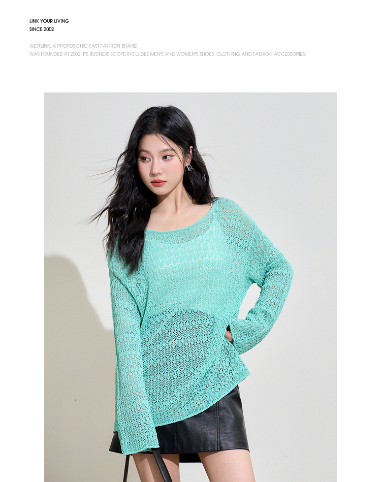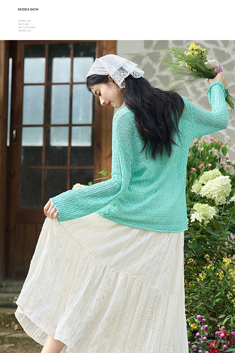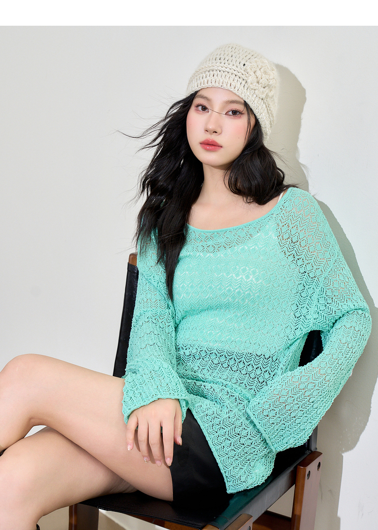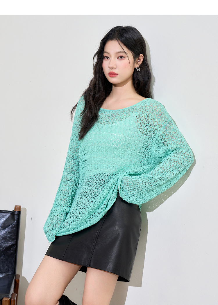 日薄荷曼波长袖镂空针织衫T恤女轻薄罩衫上衣V2942142