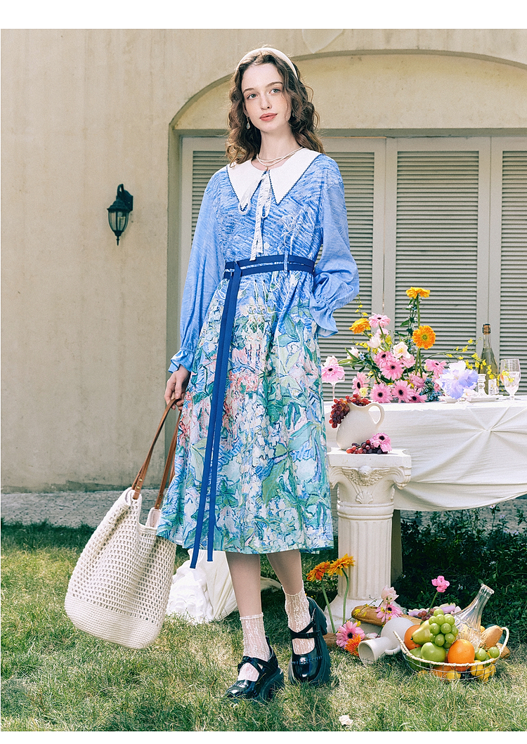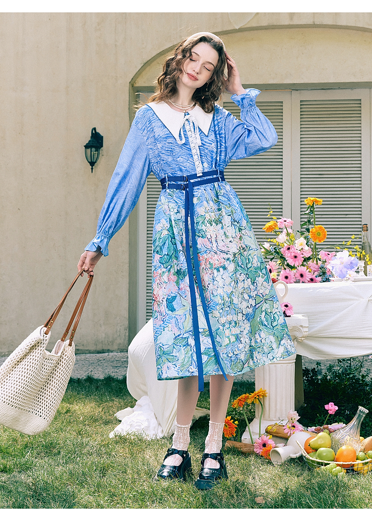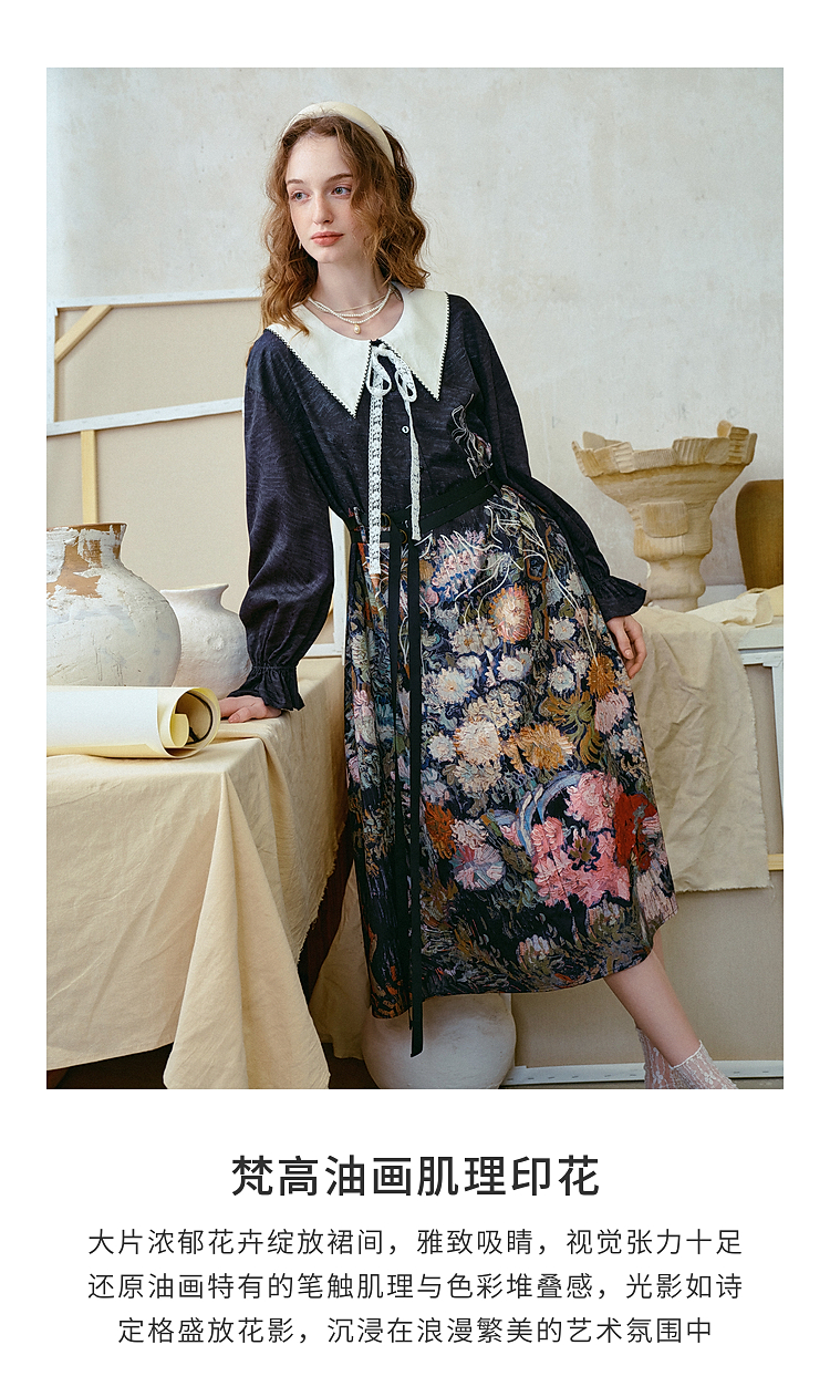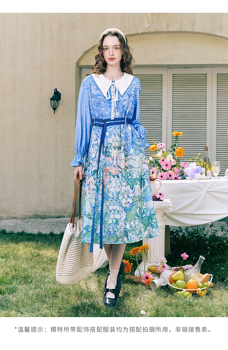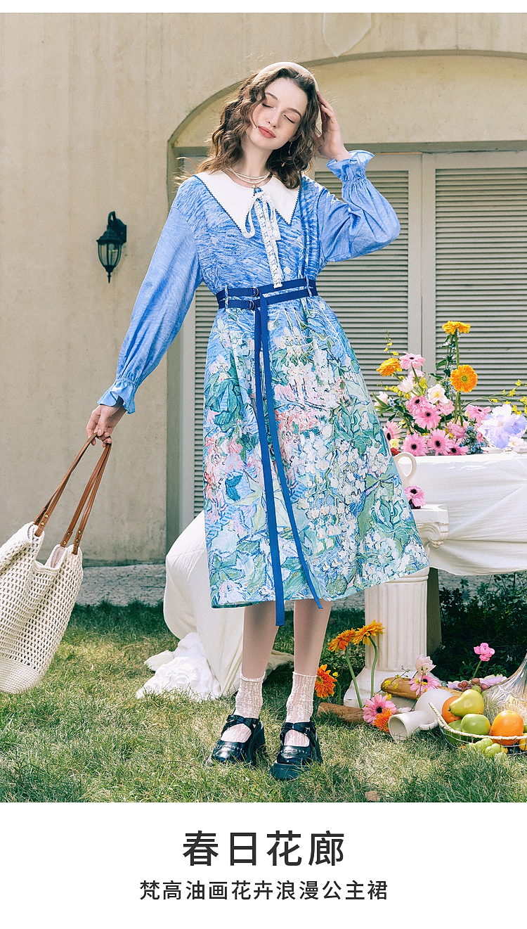 两三事梵高文艺春日花廊2026春季新款绑带撞色翻领印花a字连衣裙