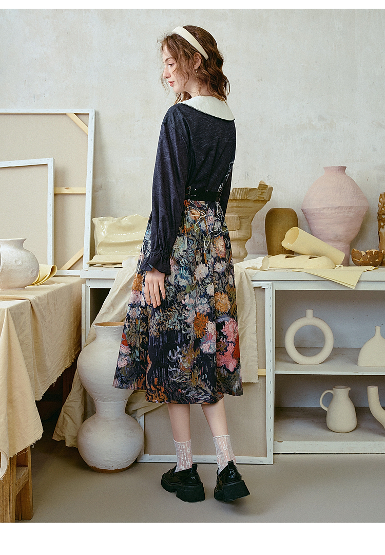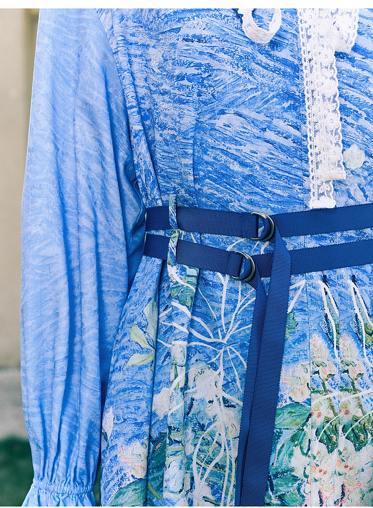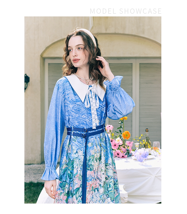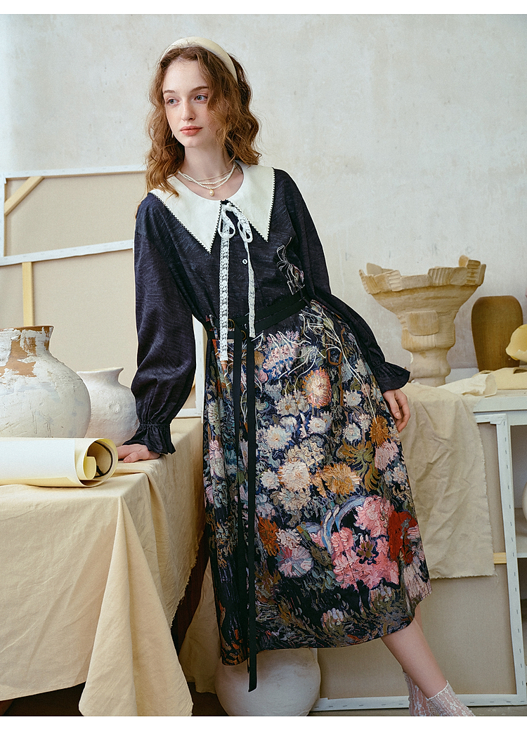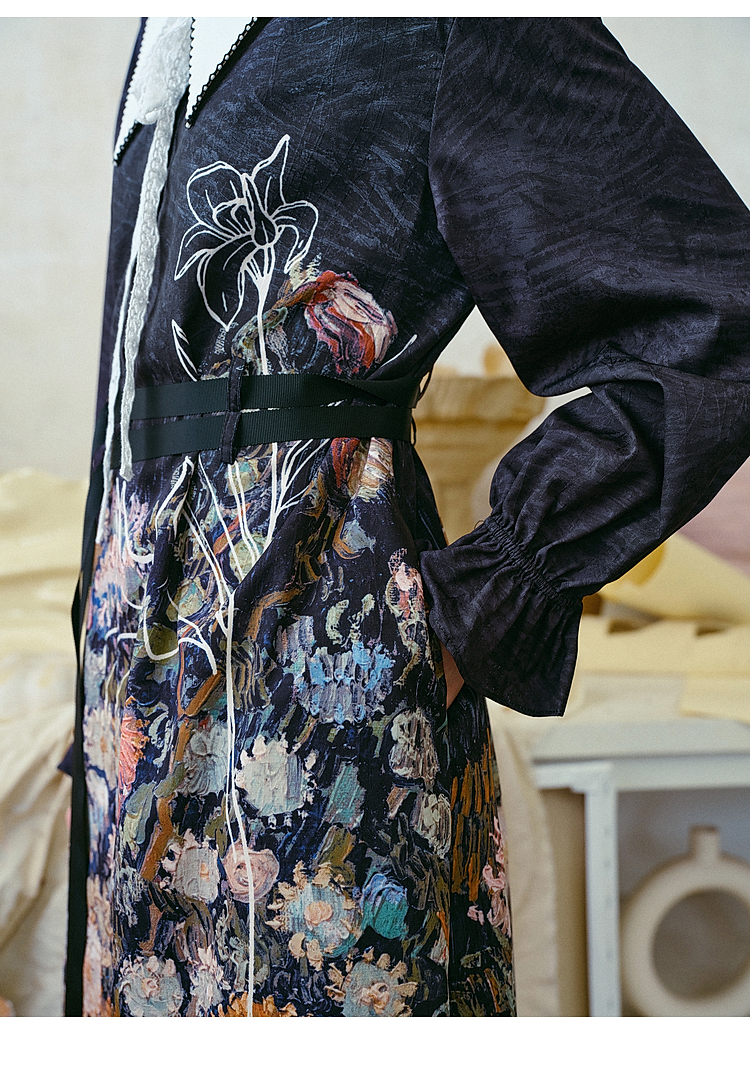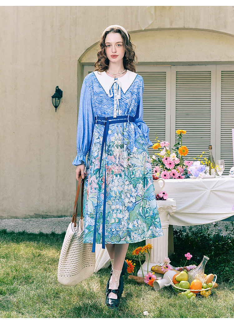 两三事梵高文艺春日花廊2026春季新款绑带撞色翻领印花a字连衣裙