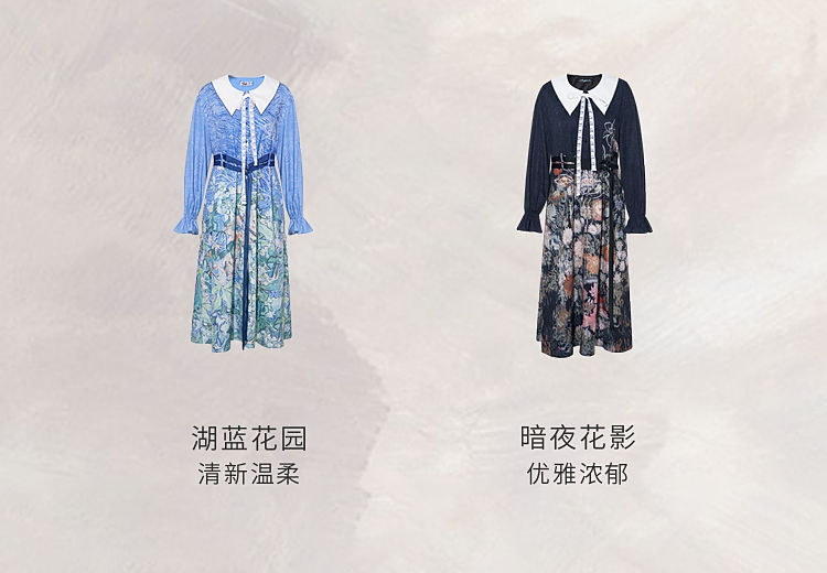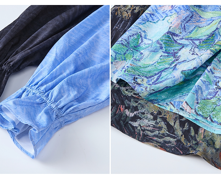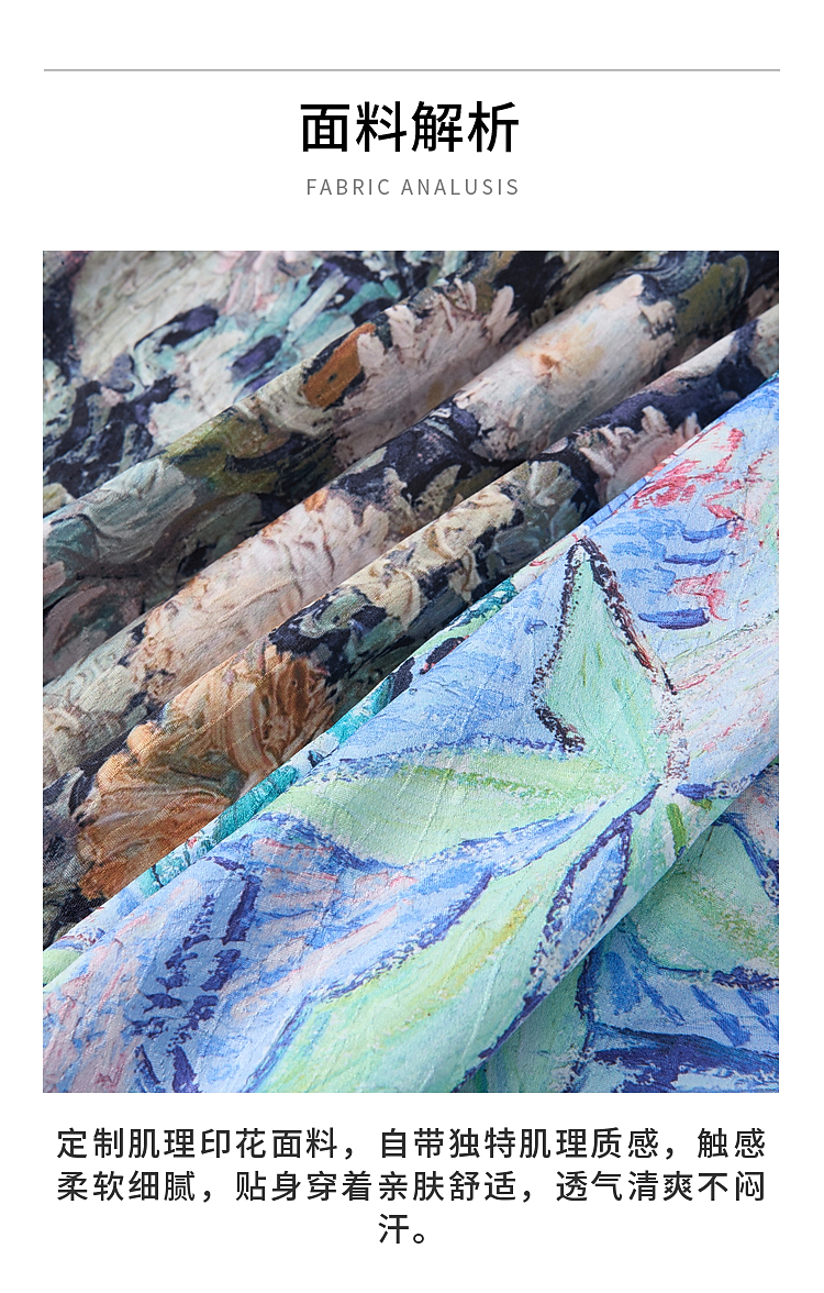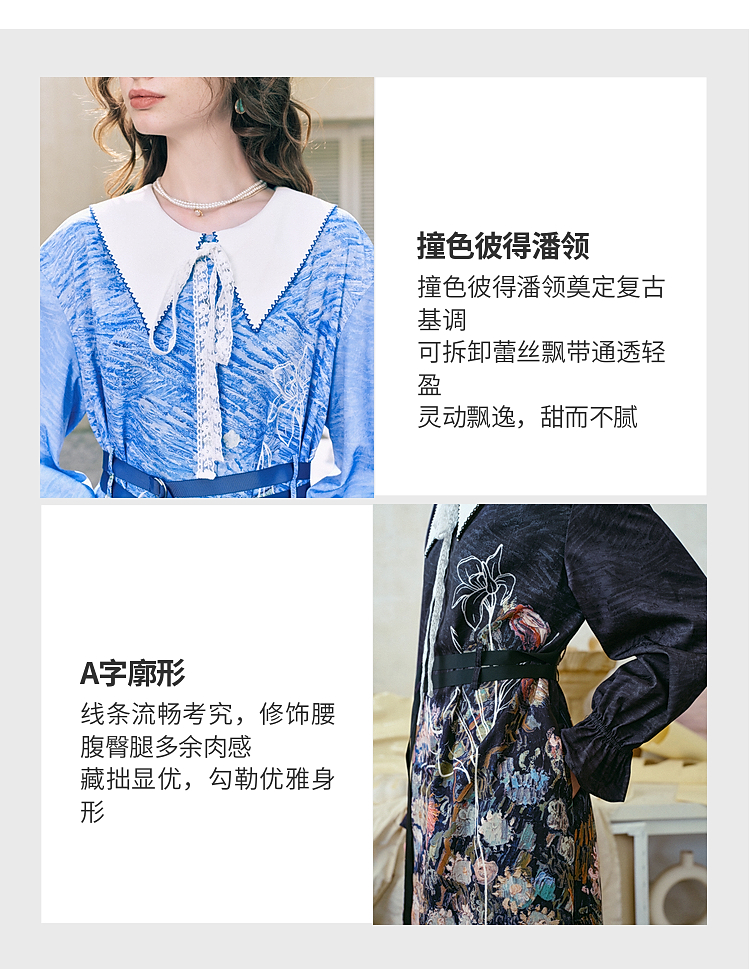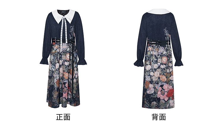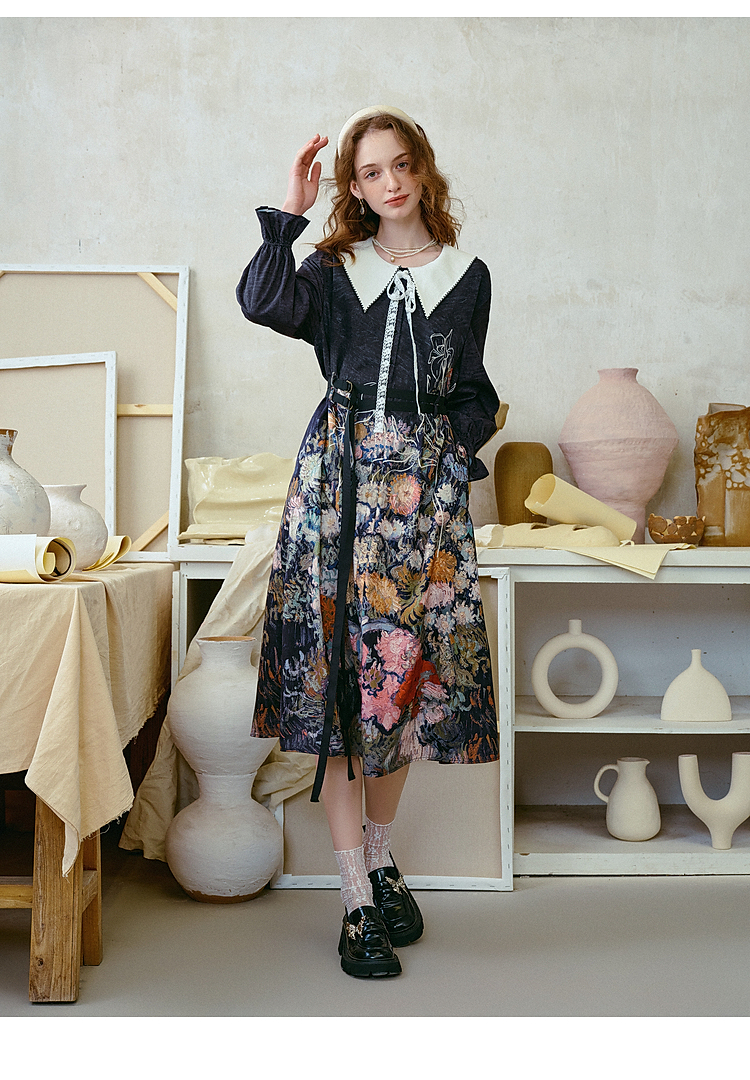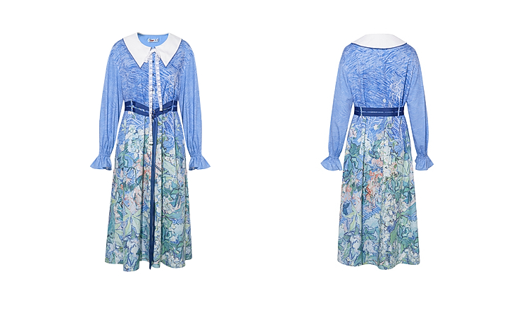 两三事梵高文艺春日花廊2026春季新款绑带撞色翻领印花a字连衣裙