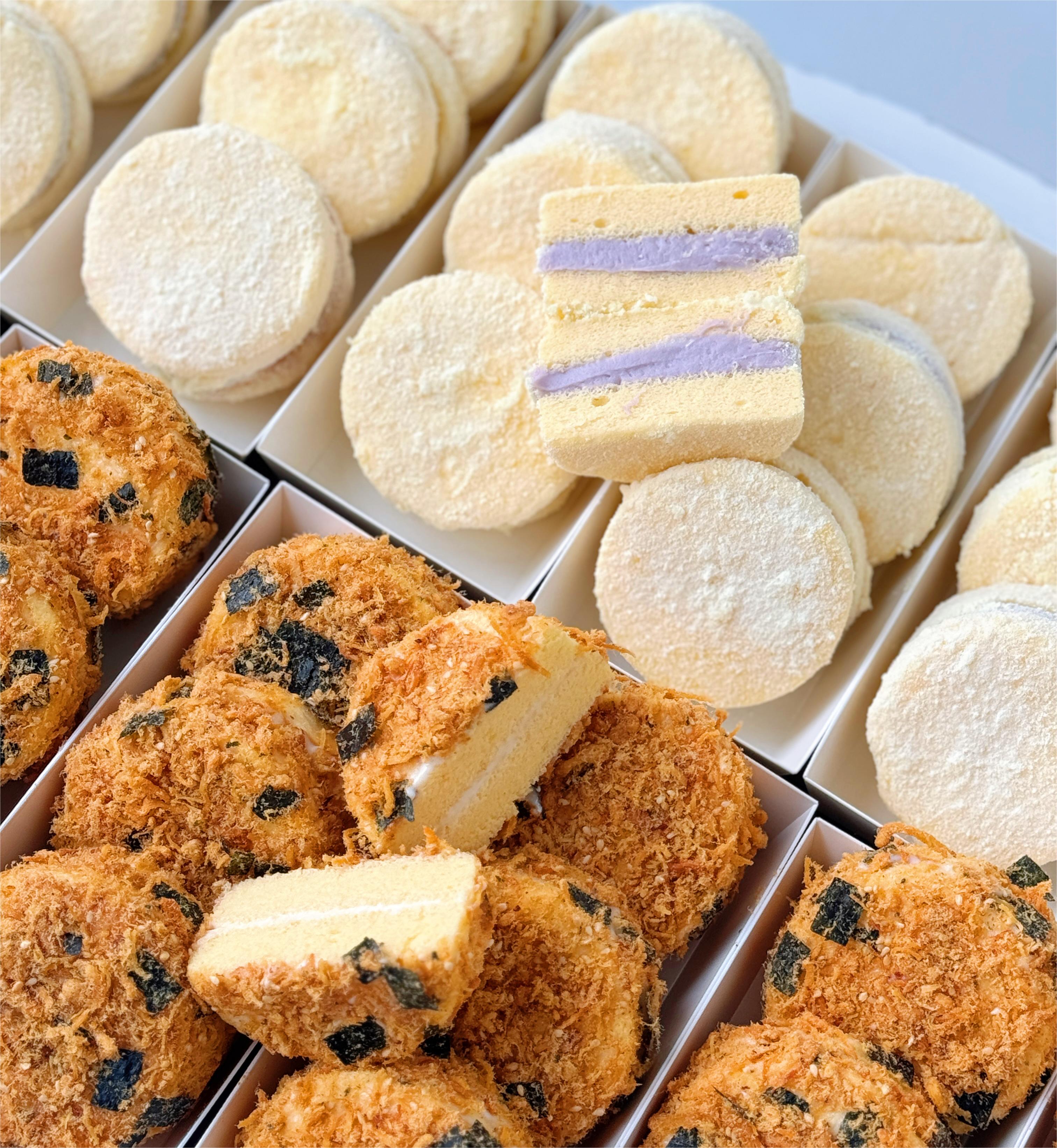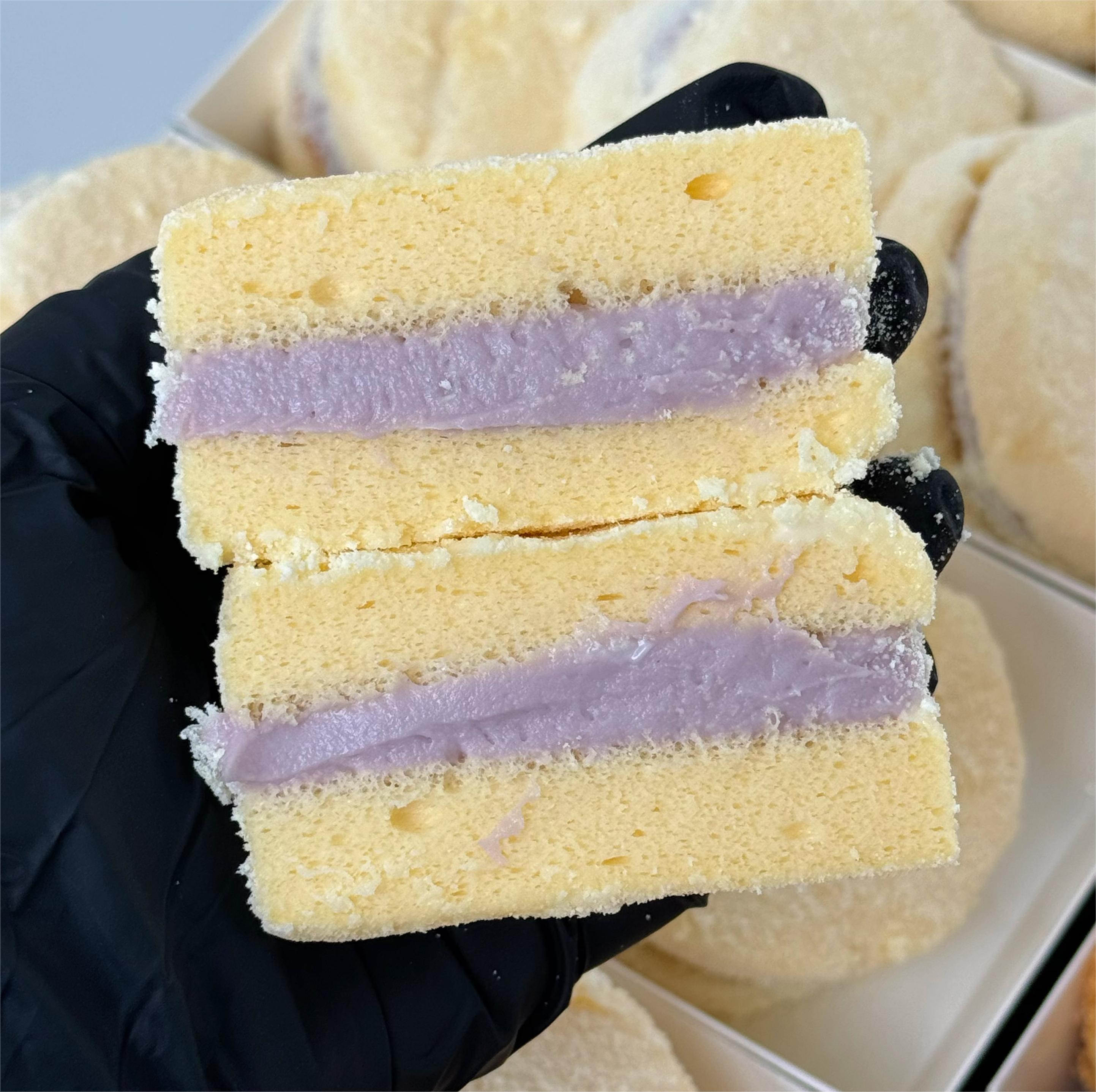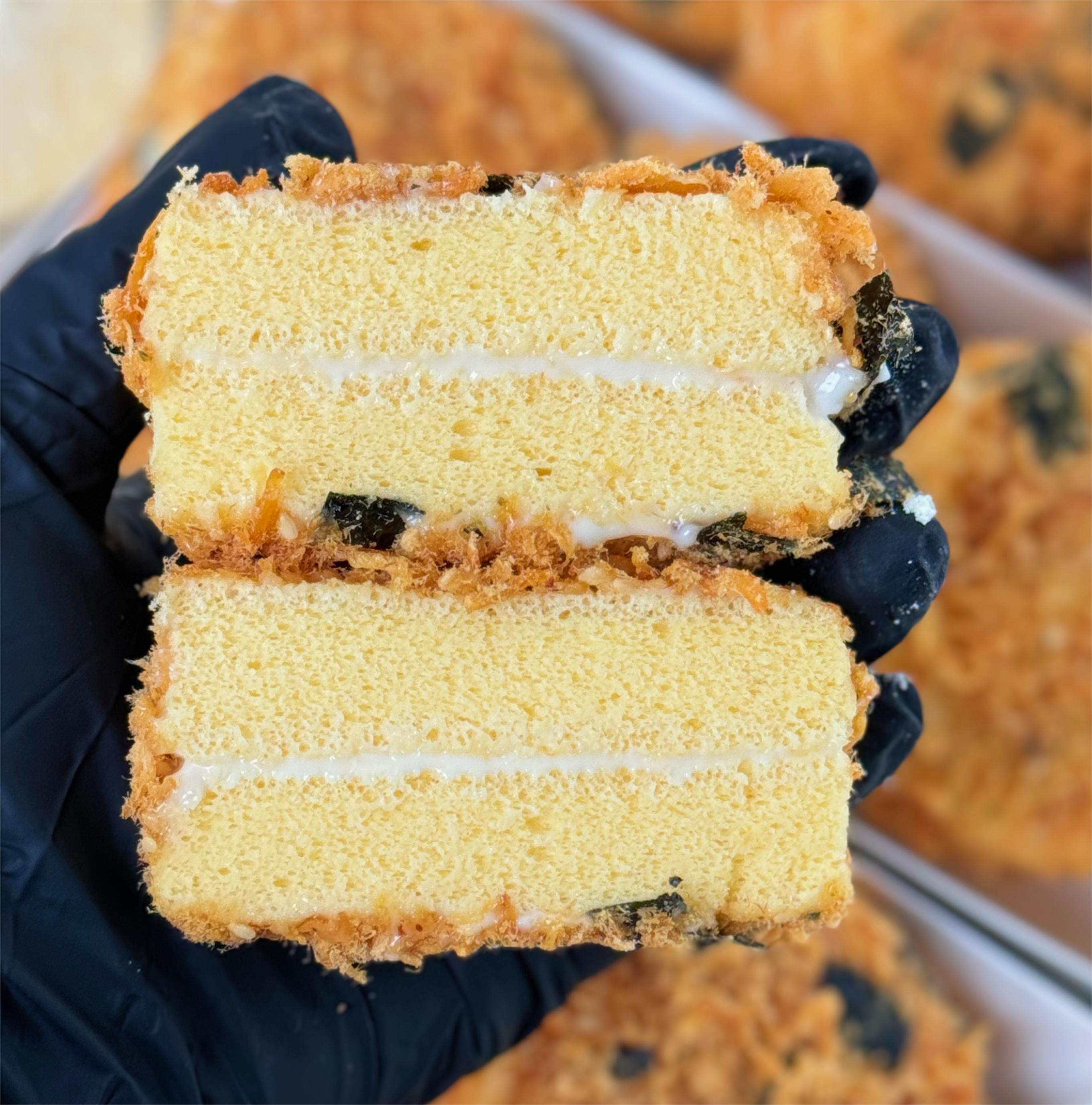 蛋糕体是我们的招牌蜂蜜胚和我们自制荔浦芋泥,德运奶粉,丘比沙拉酱和海苔肉松。芋泥雪贝每个不低于80g、海苔肉松小贝每个不低于65g。