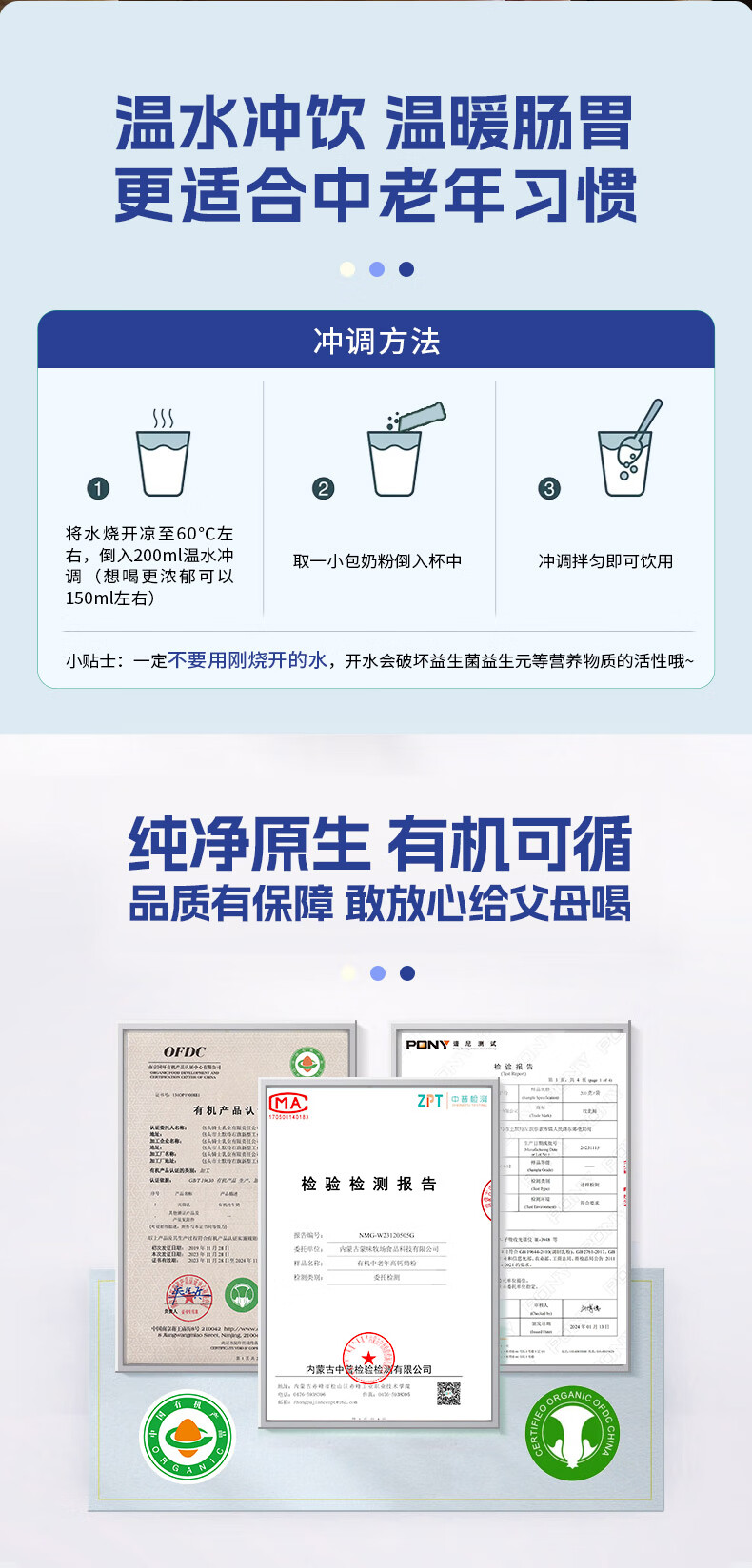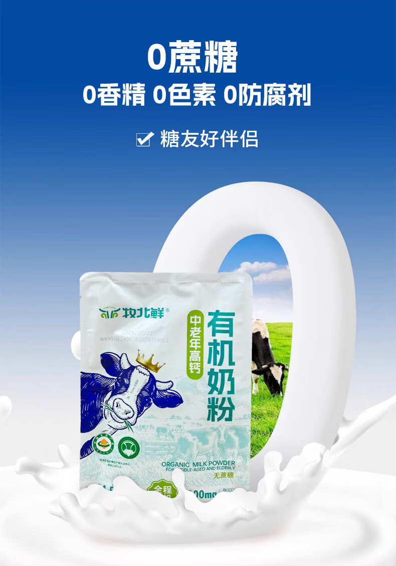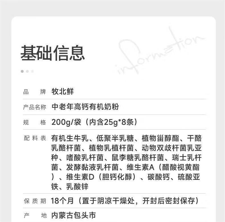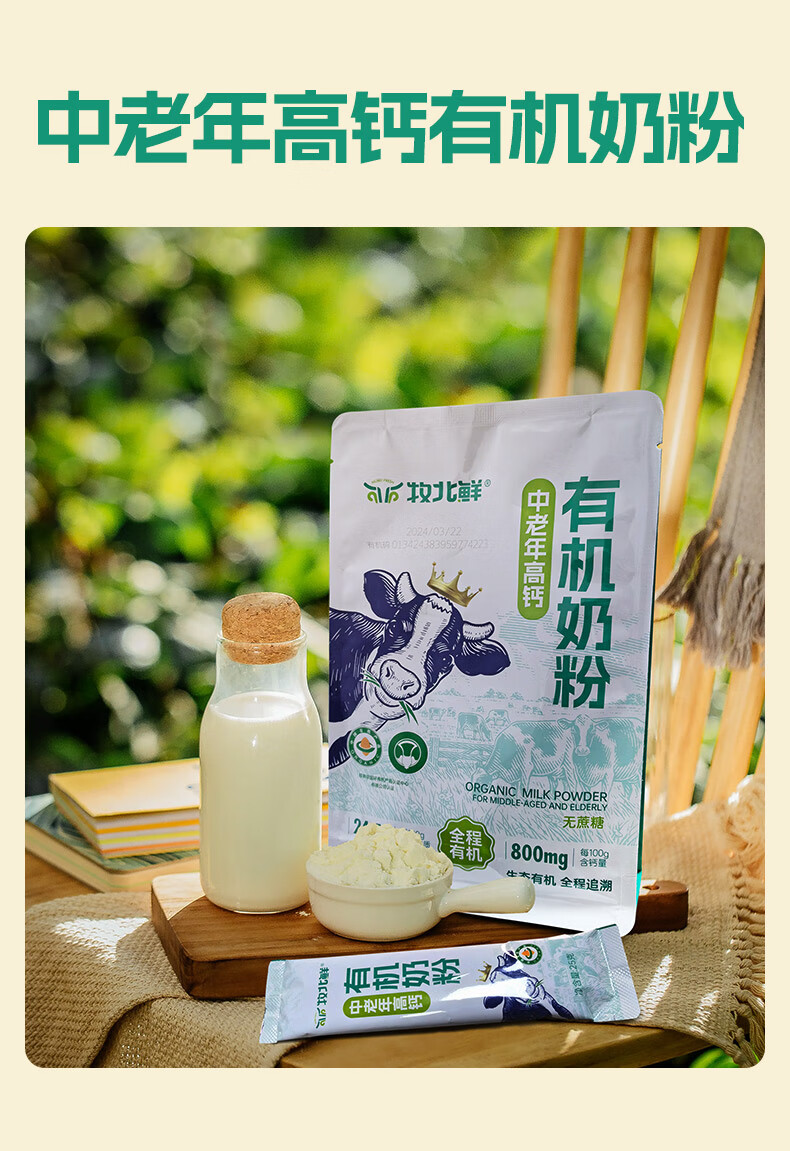 牧北鲜 中老年高钙有机奶粉 200g袋装(25g*8条)中老年奶粉有机食品