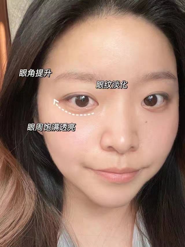 眼周肌肤最明显的变化就是纹路几乎都淡化掉了,而且眼周肌肤愈发紧致,眼角也有往上走的趋势!