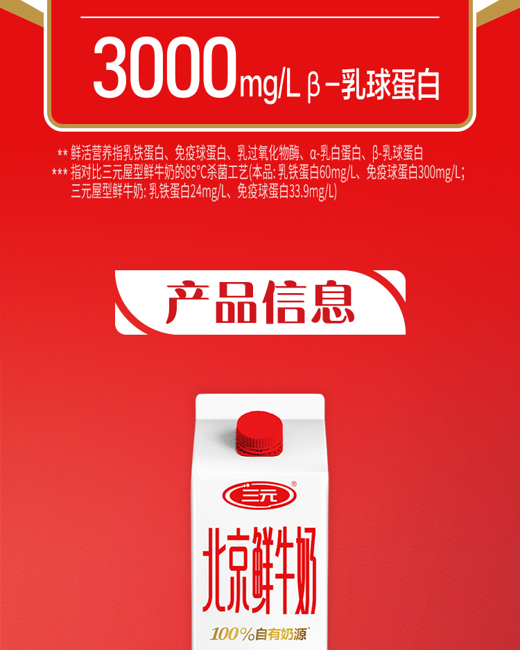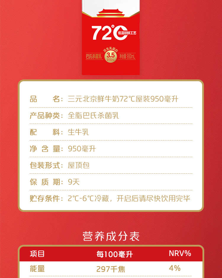 【自提-低温】三元北京鲜牛奶72℃屋型鲜牛乳950ml