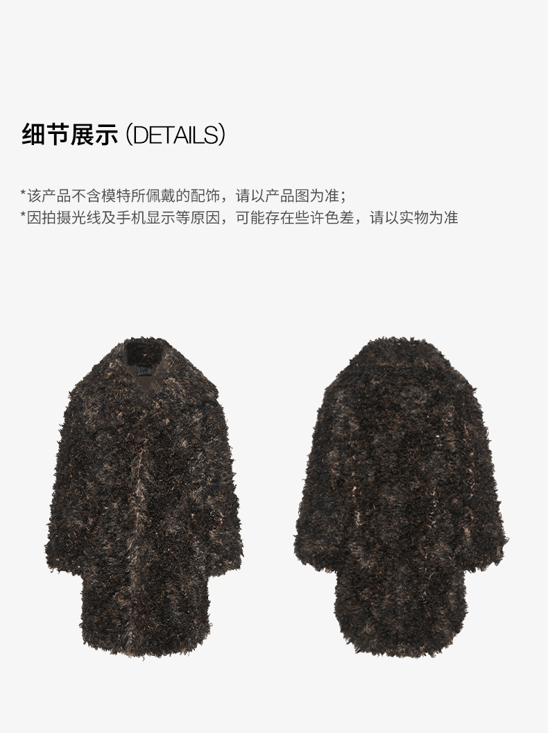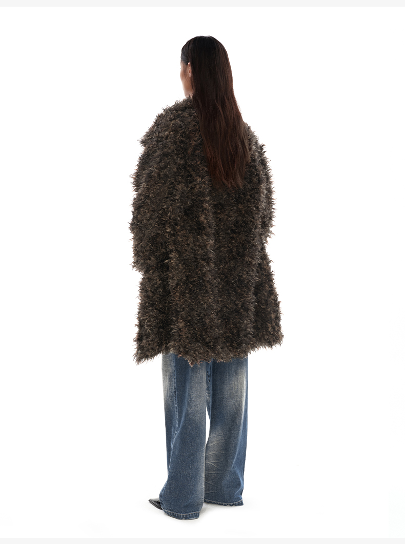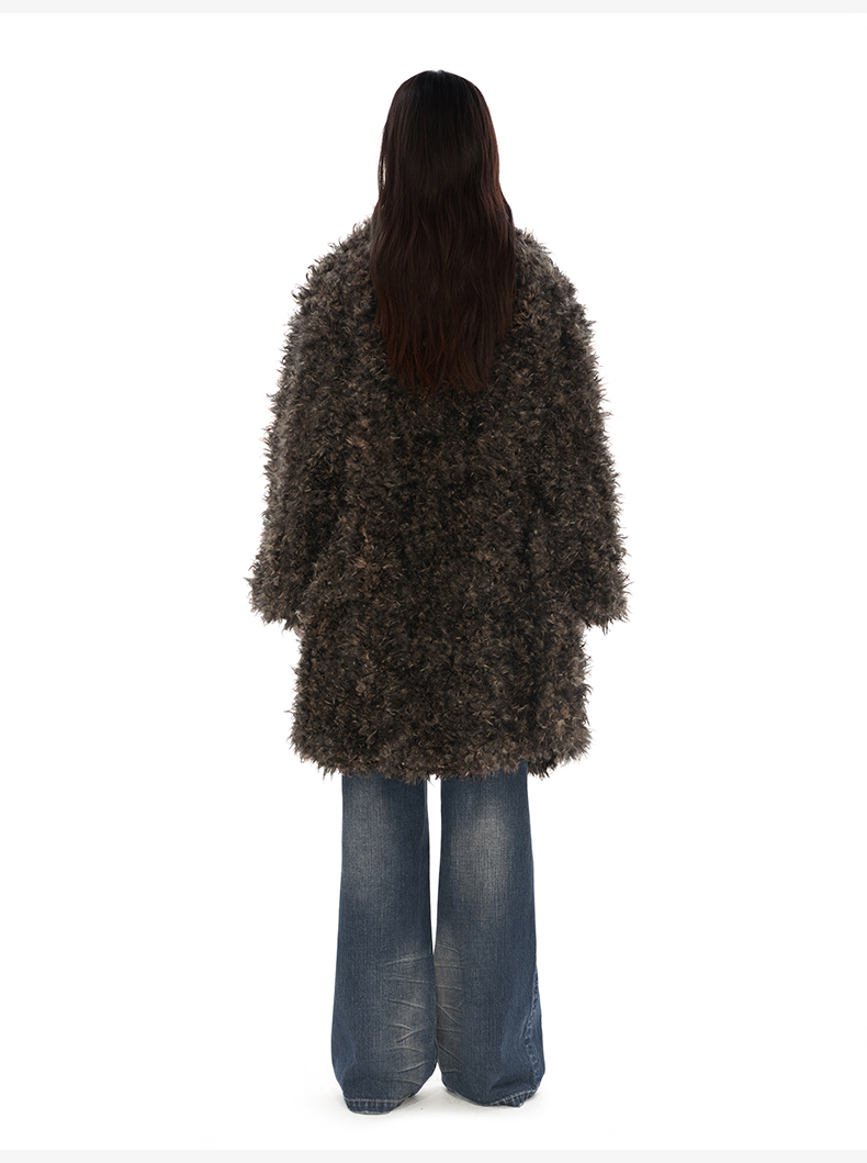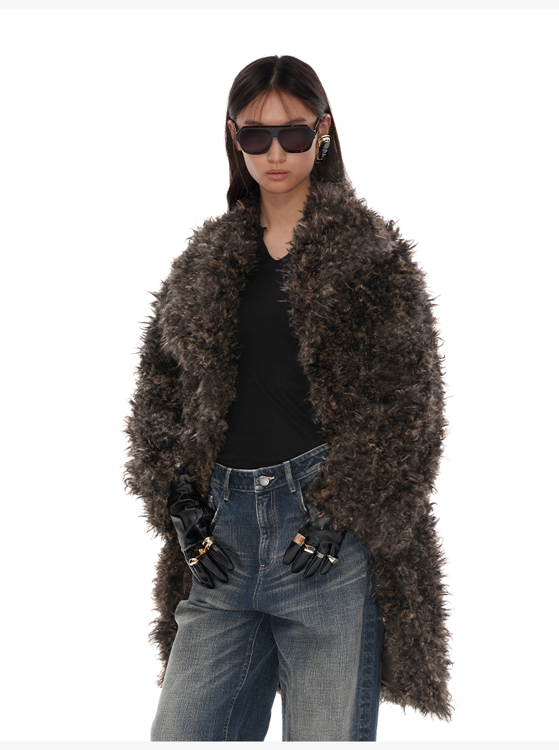 NUTH 棕色中长款环保皮草宽松保暖翻领大衣外套女