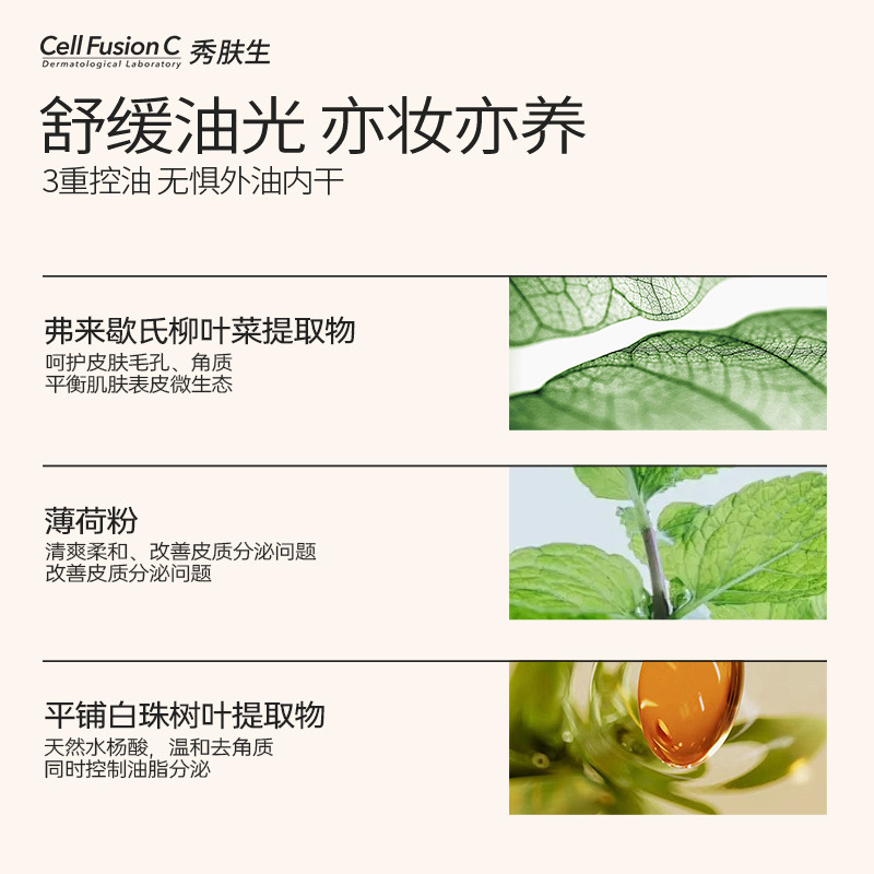 三重控油成分:含皮脂、油分、角质三重护理效果的精华成分,能够改善肌肤水油失衡问题乳 液 质 地:肤感轻薄不粘腻,不闷痘不堵塞毛孔