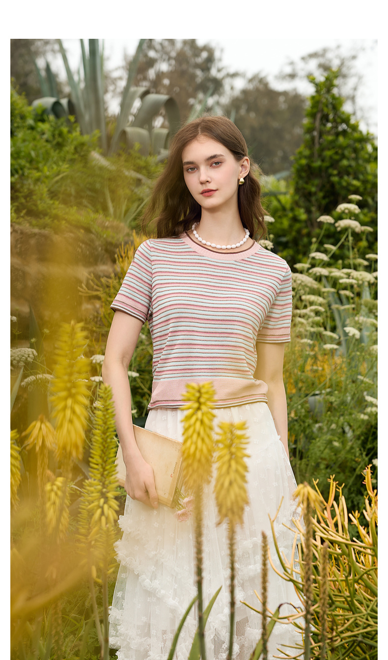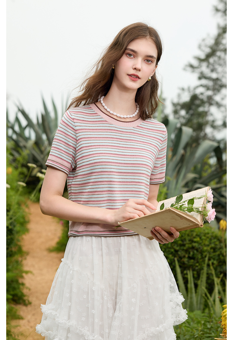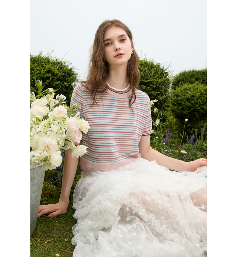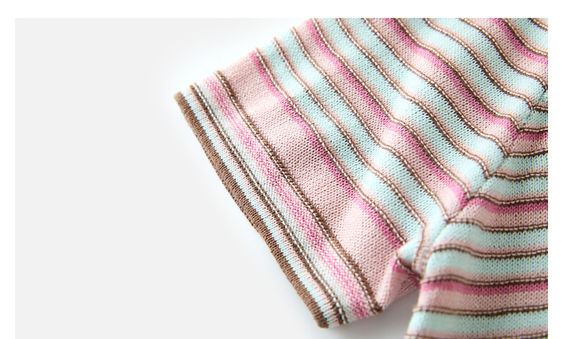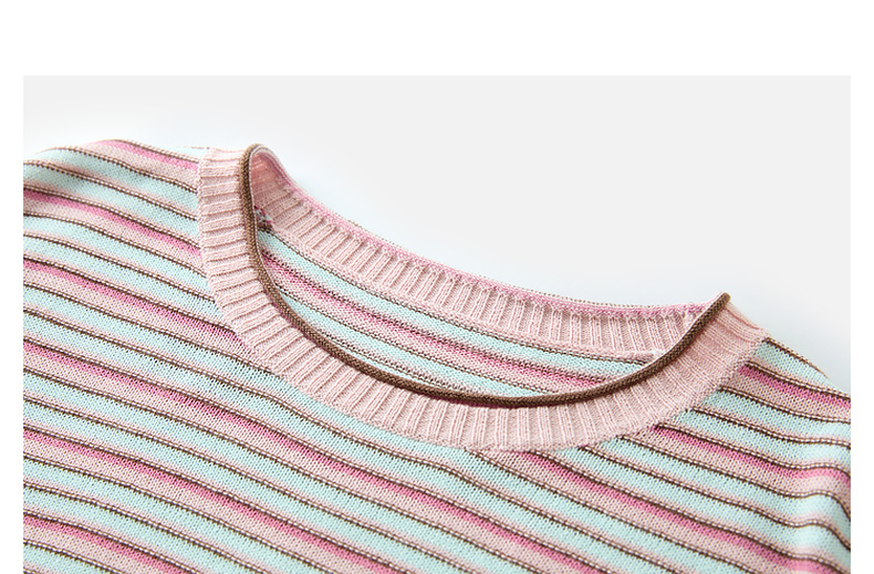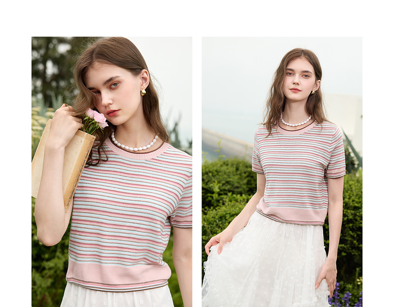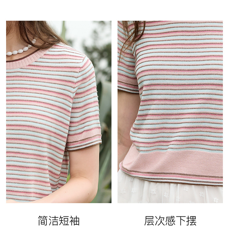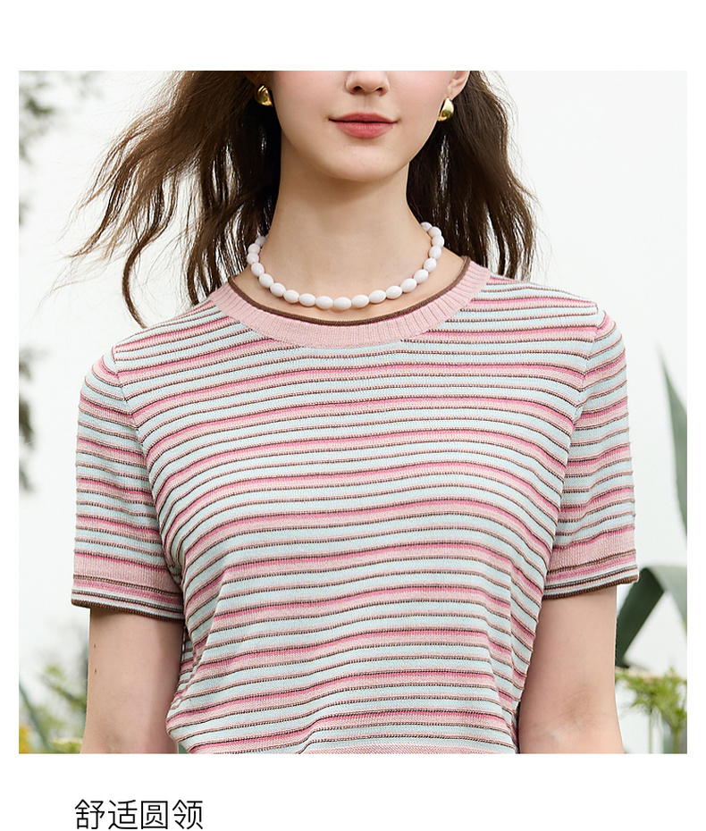 三彩2025夏季新款条纹针织衫圆领短袖毛衫套头衫短款简约M