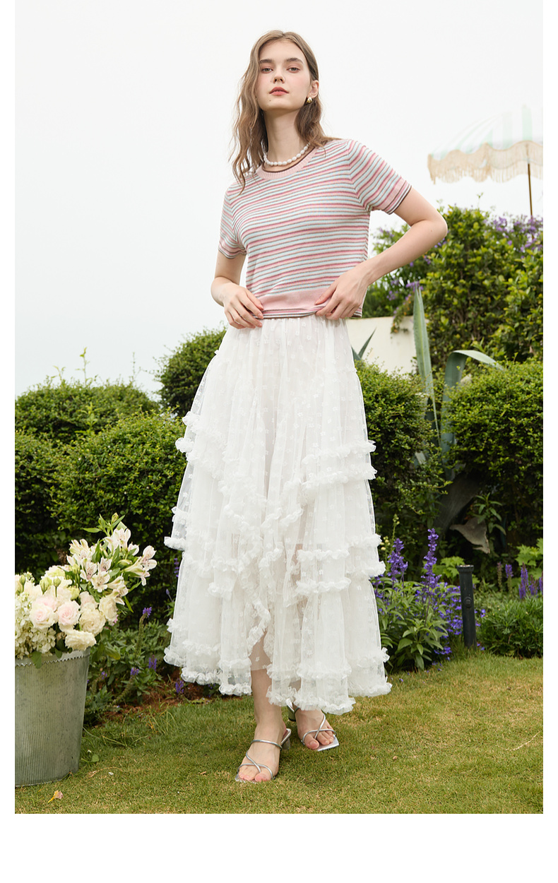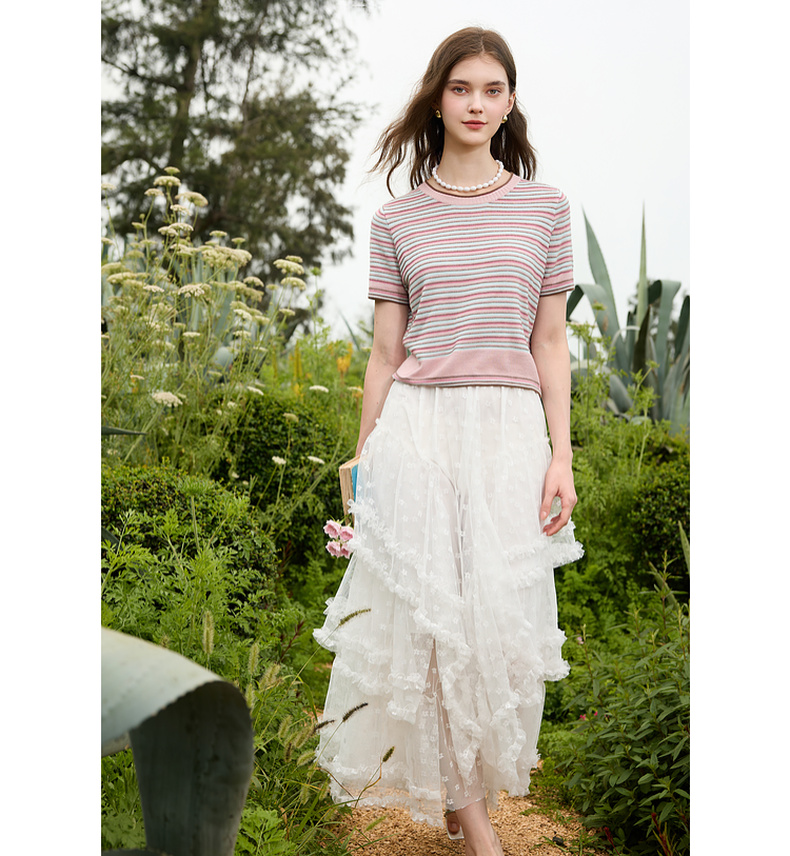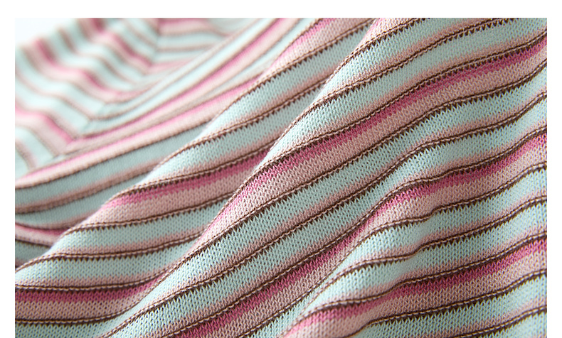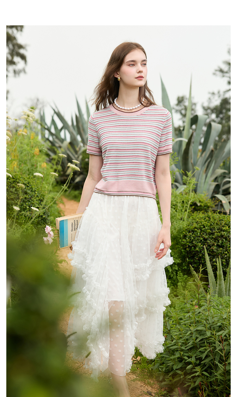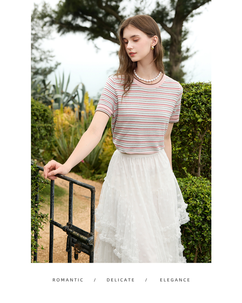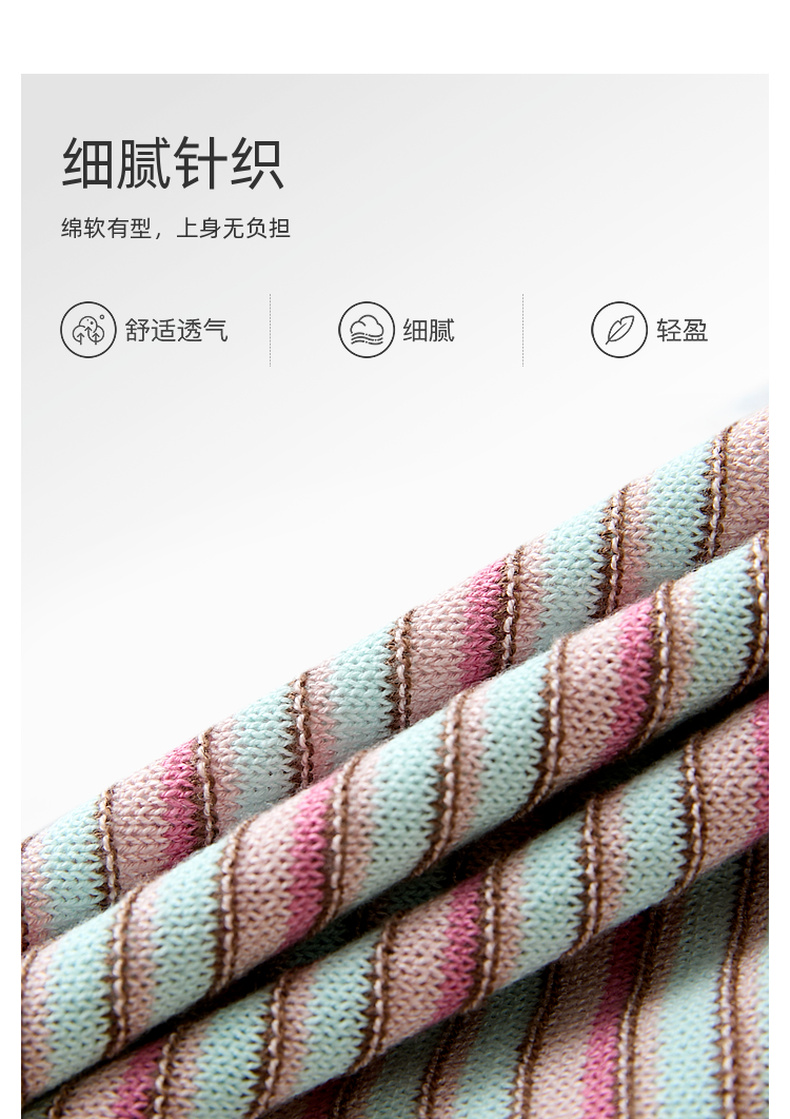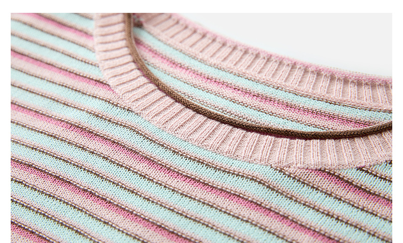 三彩2025夏季新款条纹针织衫圆领短袖毛衫套头衫短款简约M