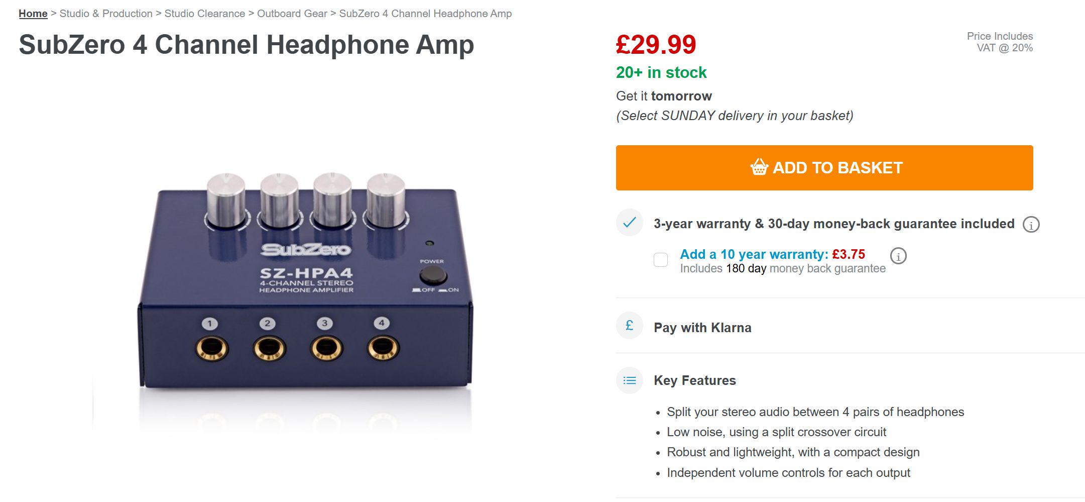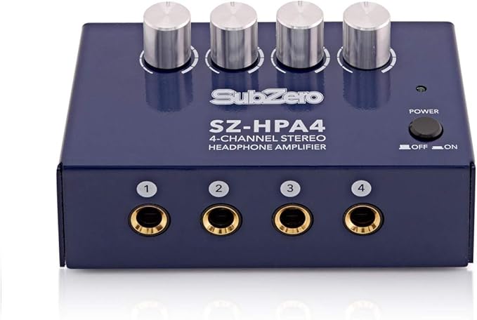 SubZero 四通道耳机放大器专为高质量监听设计,可支持多副耳机同时使用。采用高品质元件确保所有输出端信号始终清晰。每个通道都配有独立的音量控制,让每位用户都能调节到喜欢的音量大小。开关按钮配以LED指示灯,清晰可见,便于操作便捷,同时附带电源适配器