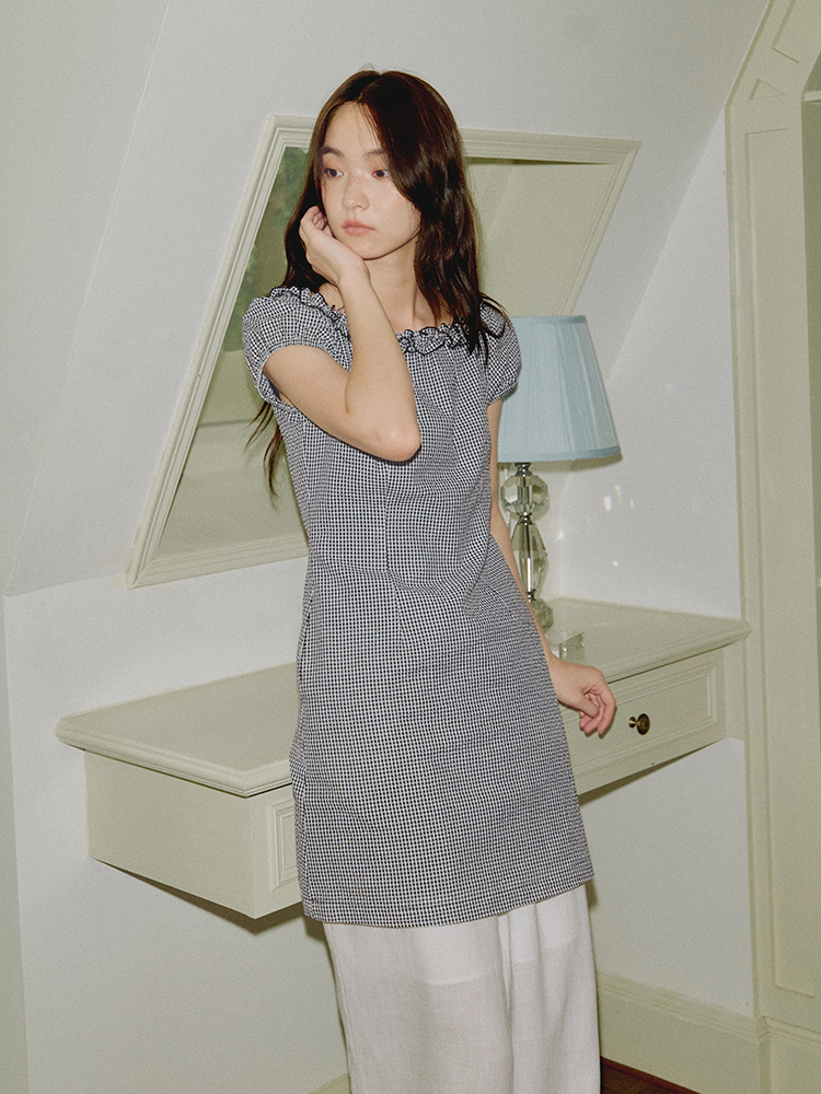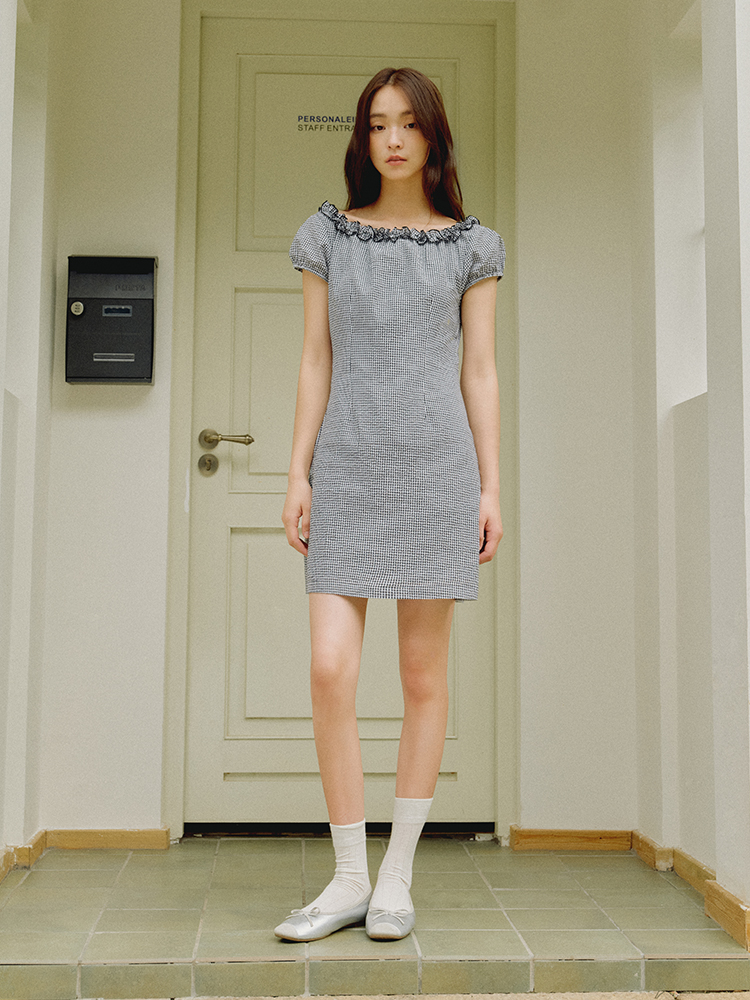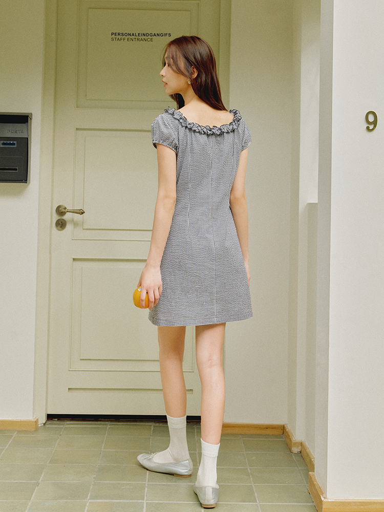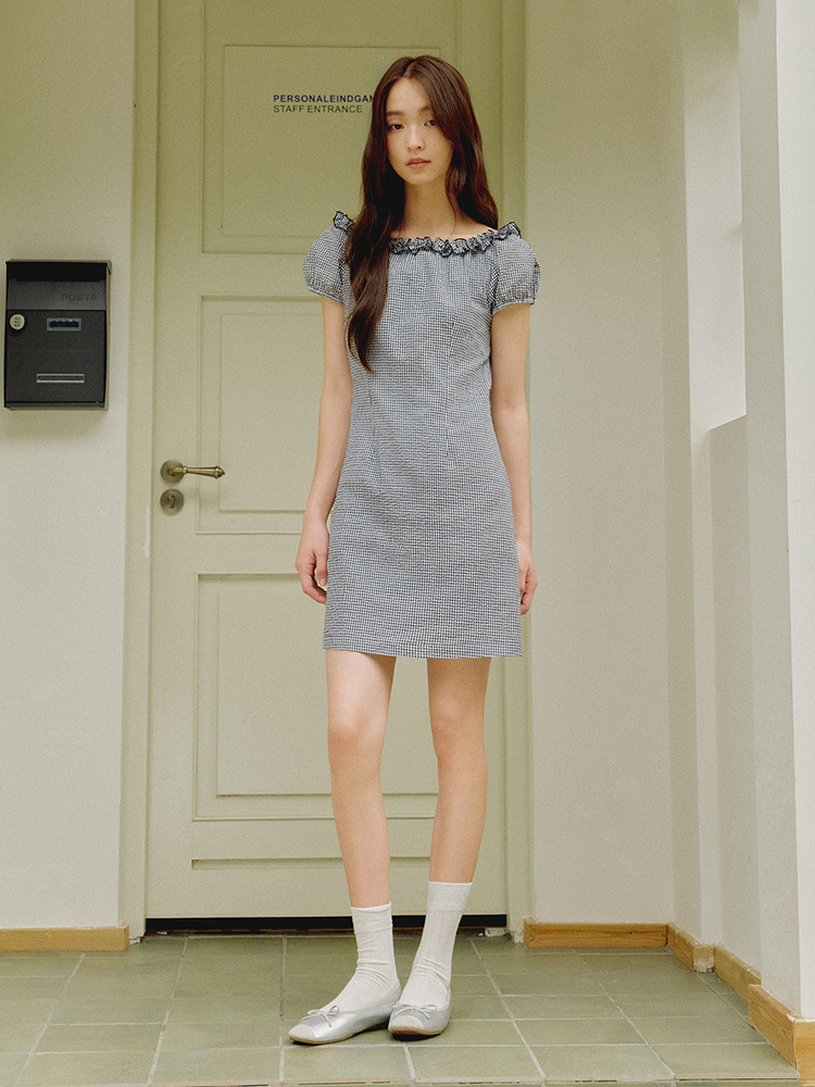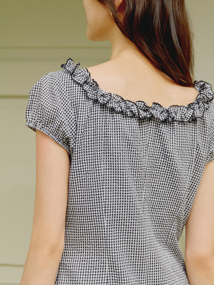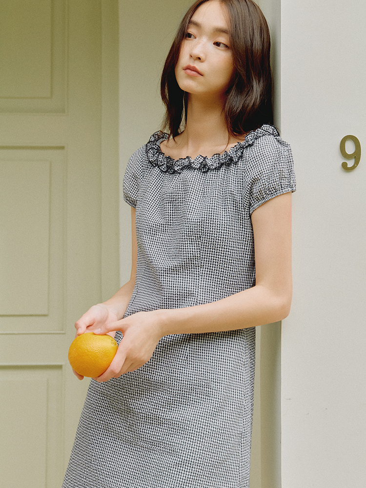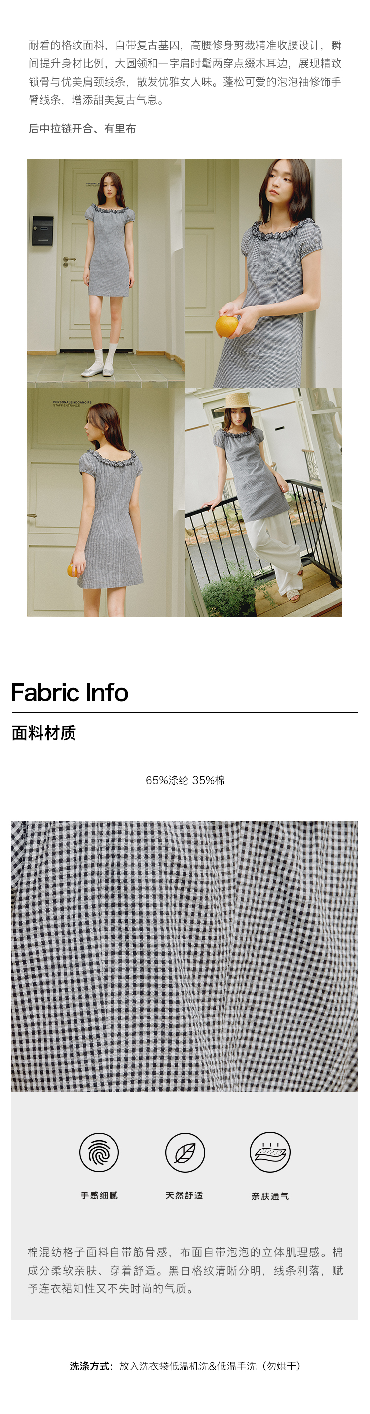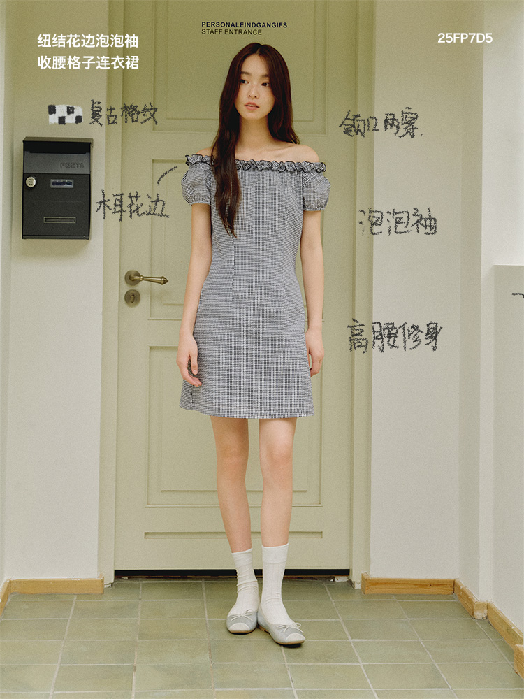 ForPoem 现货 25/SS原创设计纽结花边泡泡袖收腰格子连衣裙