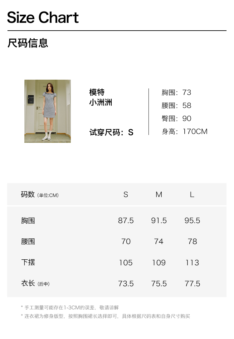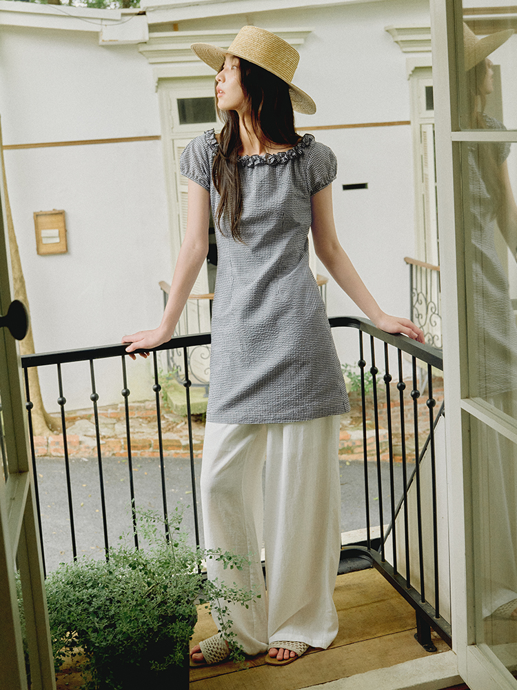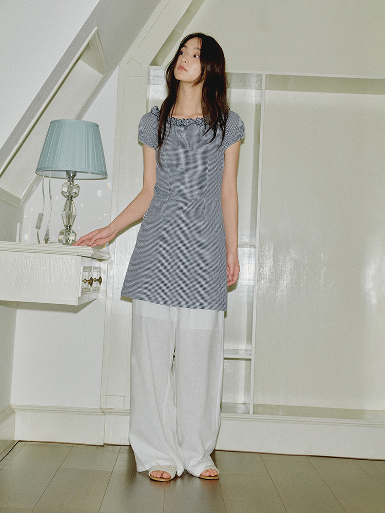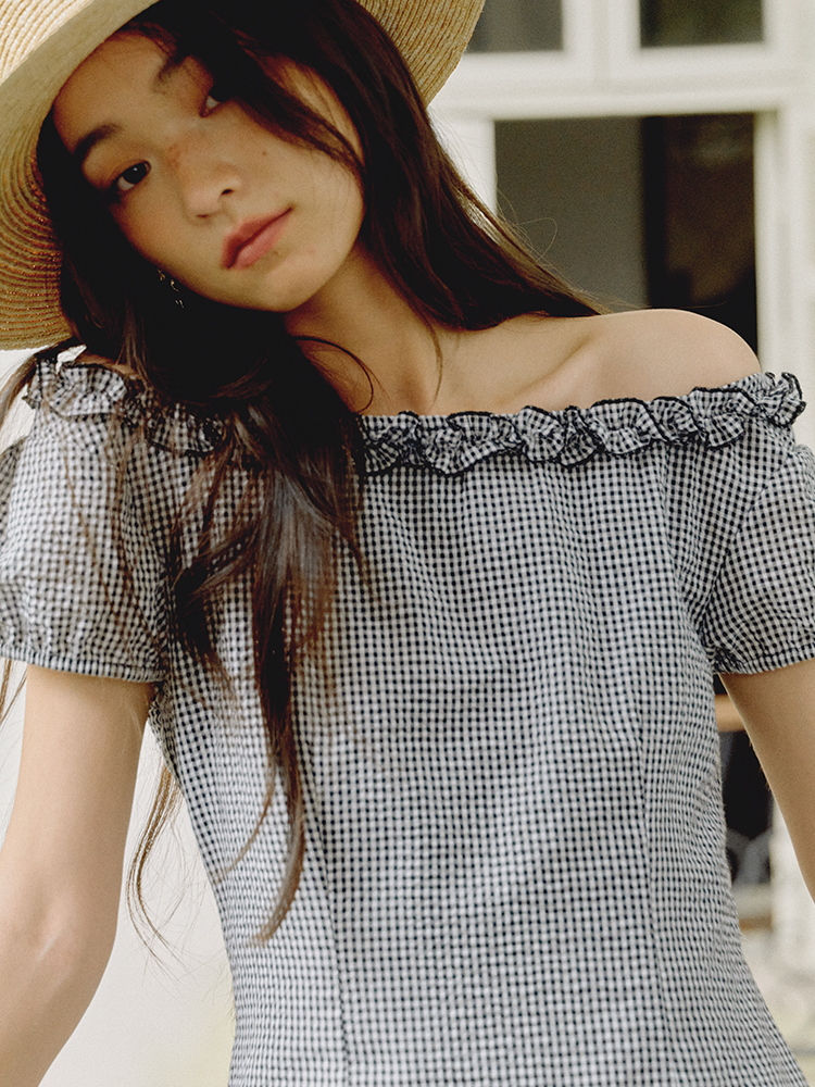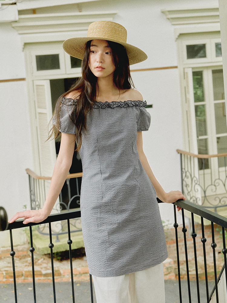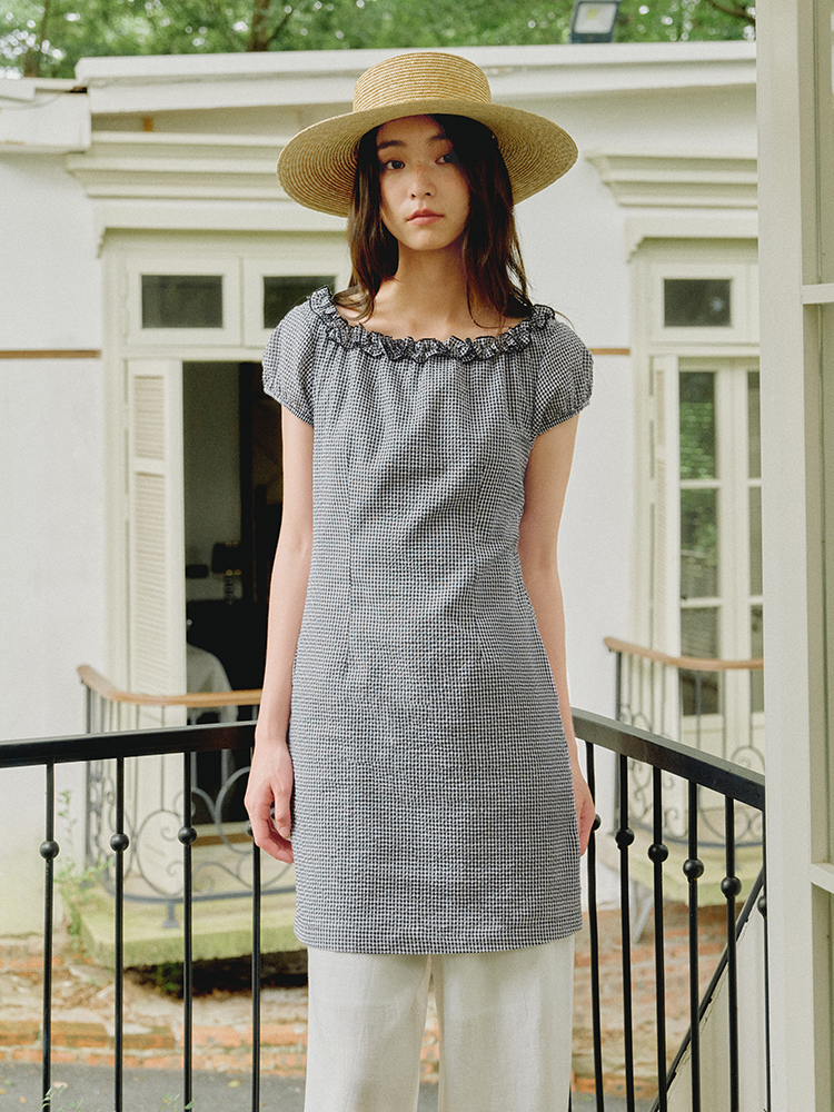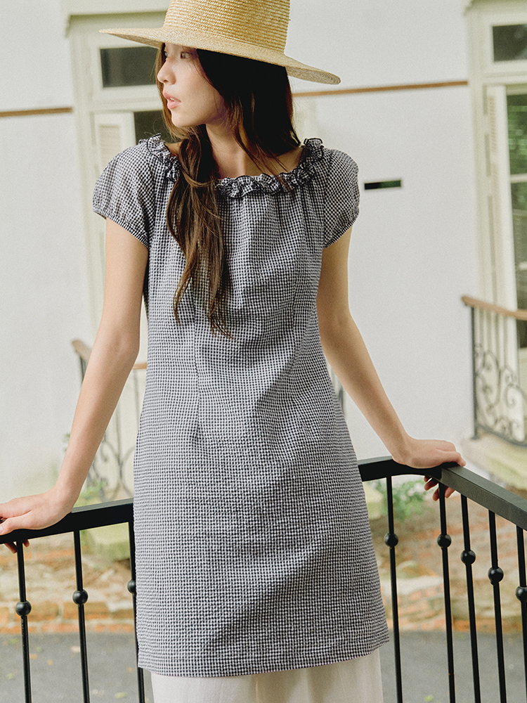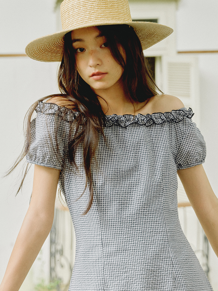 ForPoem 现货 25/SS原创设计纽结花边泡泡袖收腰格子连衣裙