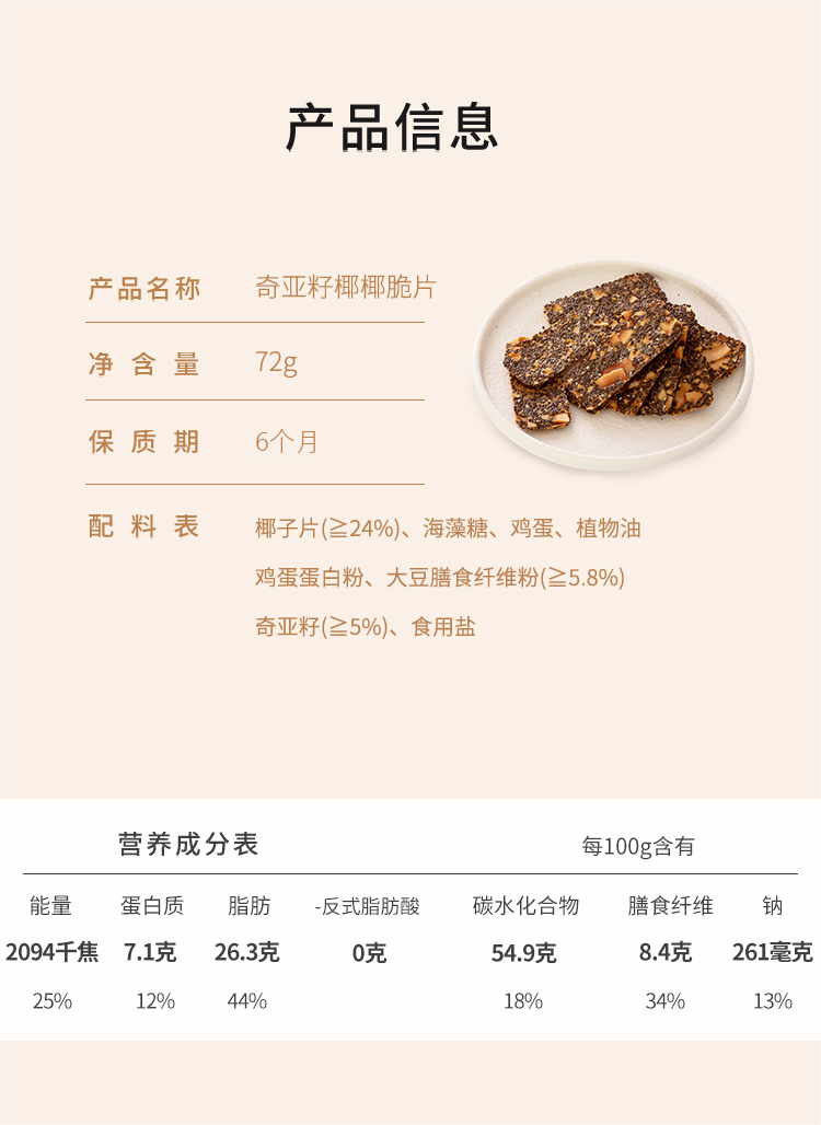 📍产品信息 【品名】:奇亚籽椰椰脆片 【产品规格】:72g 【保质期】:6个月 【配料表】:椰子片(≧24%)、海藻糖、鸡蛋、植物油、鸡蛋蛋白粉、大豆膳食纤维粉(≧5.8%)、奇亚籽(≧5%)、食用盐 【食用方法】:开封后请尽早食用,以保鲜美 【储存方式】:阴凉干燥处保存 【发货地】:福建漳州 【发货时效】:48小时内发出,14点前给订单 【发货快递】:中通、韵达随机发不指定 【补运费地区】:上海北京加1元,甘肃、内蒙古、宁夏运费加14元,青海、新疆、西藏运费加16元,上海北京加1元。
