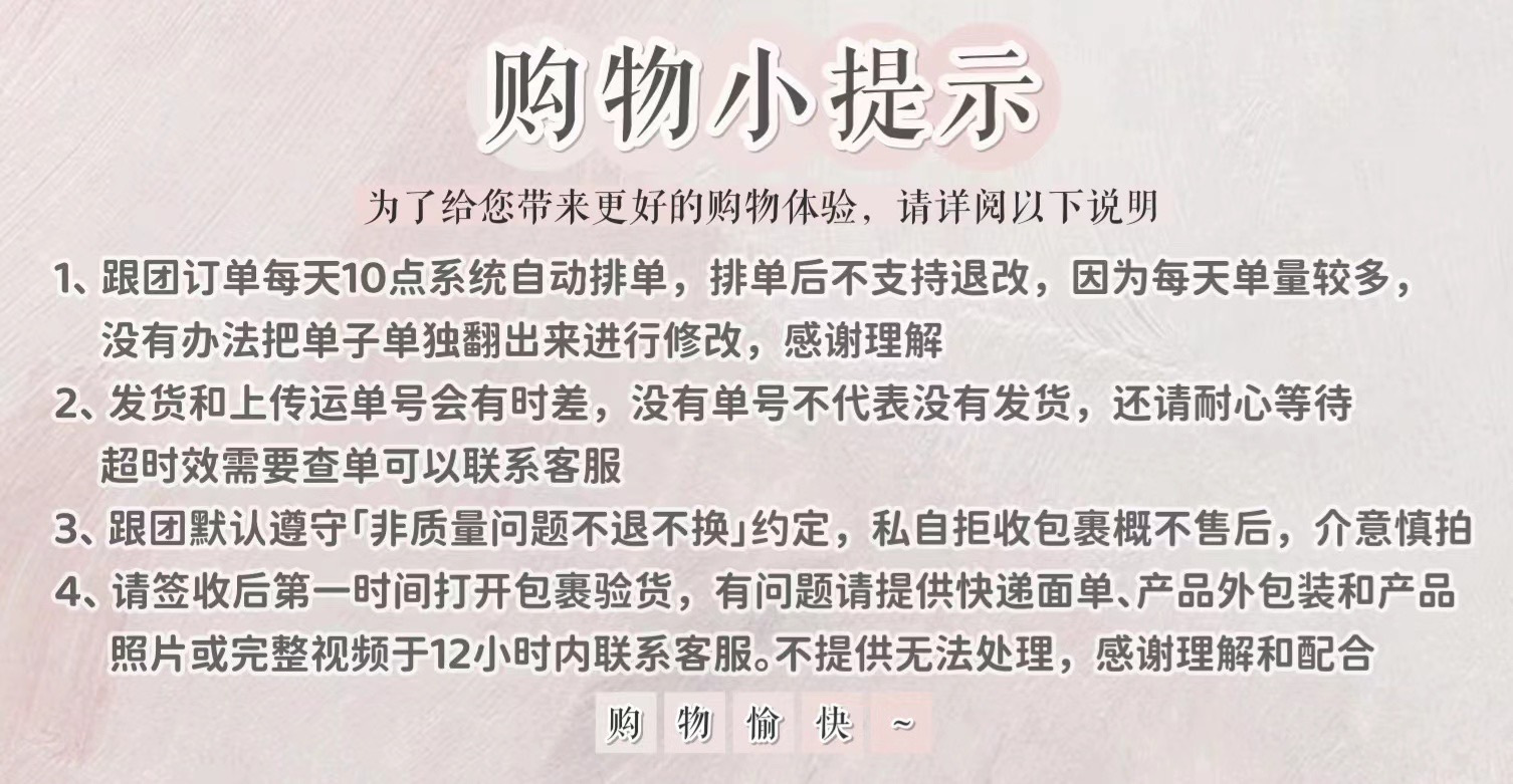 【关于售后】排单后不接受退改。不接受非质量问题的退换货,跟团默认同意约定。如有漏发或者其他质量问题,请收到商品后,提供快递面单及收到的产品清晰的照片和订单信息文字在24小时内联系团长。 【售后标准】 1、因个人口味问题(不好吃、太甜、不喜欢等)问题不售后。 2、如包裹破损、挤压严重请拍照签收,签单破损签收,拍照给客服处理。 3、返单后撤单、改地址会产生费用,拦截费按照大部分地区收取3元,北京、上海加收1元,偏远六省按实际发出运费收取。
