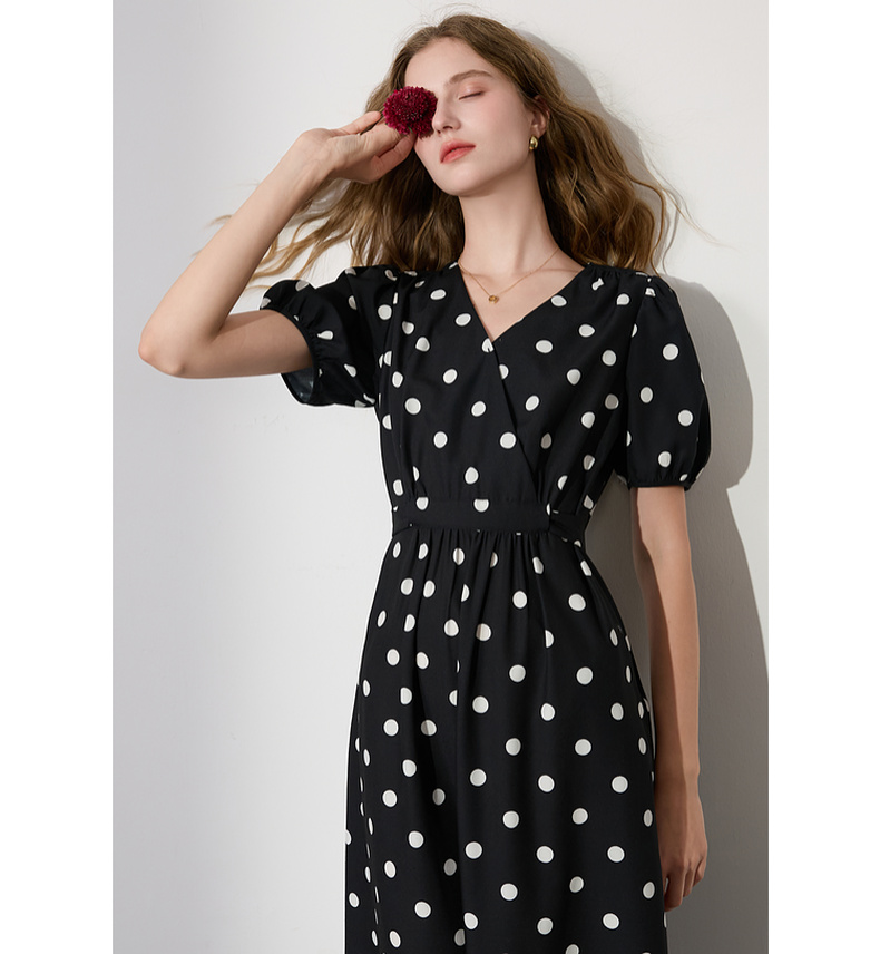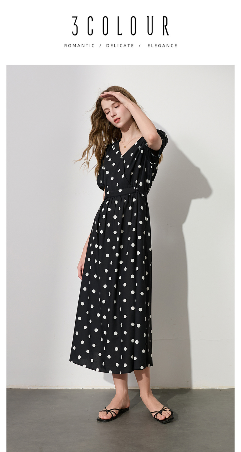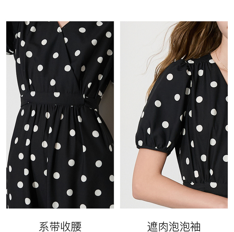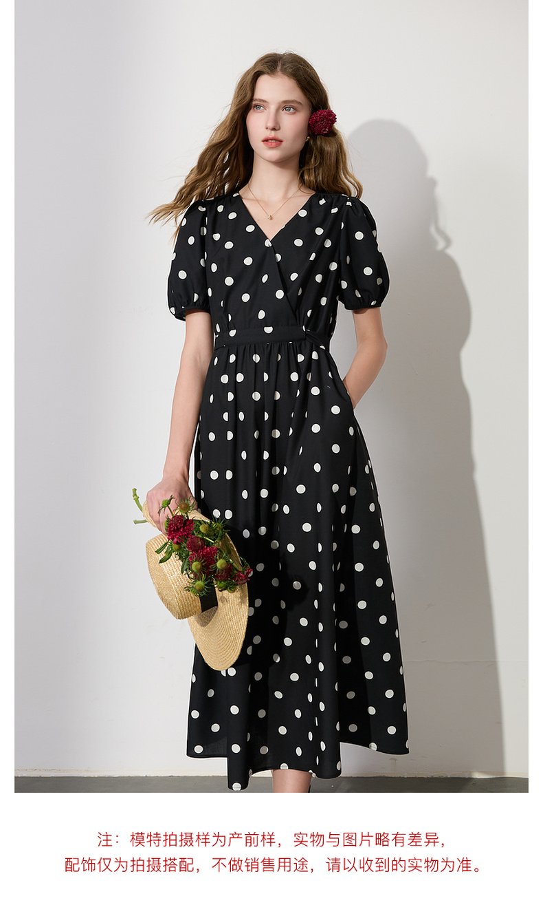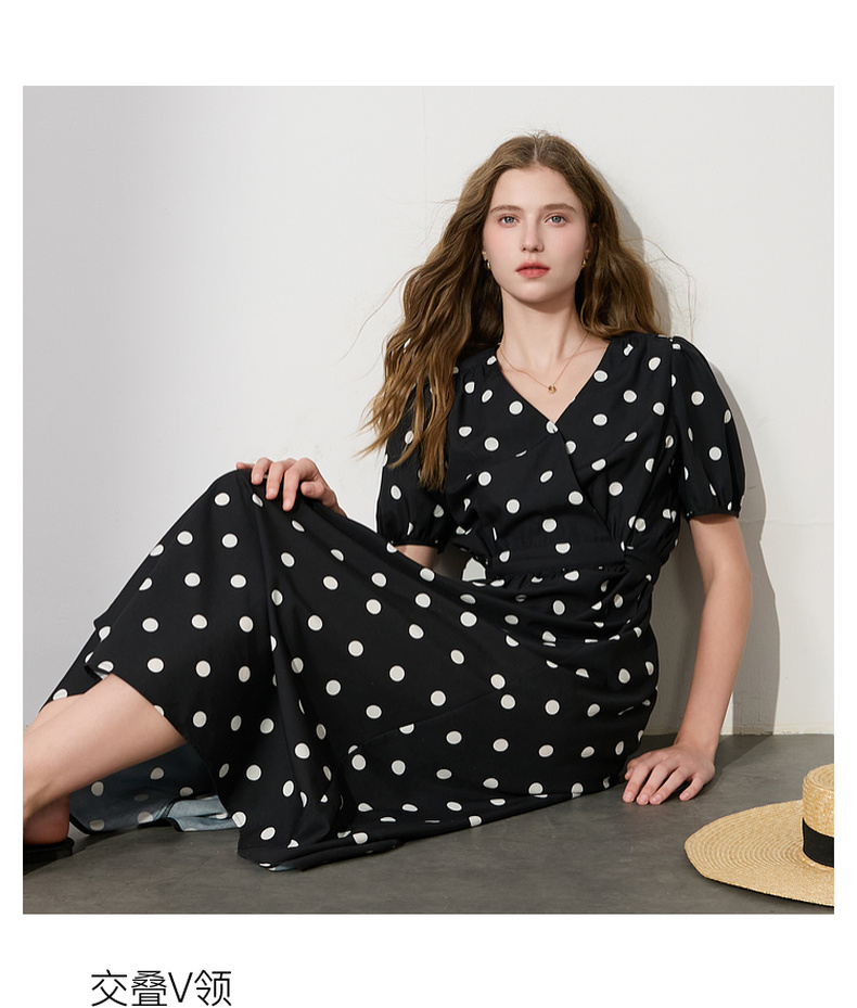 三彩2025夏季新款波点连衣裙法式高腰A字裙V领长裙优雅M